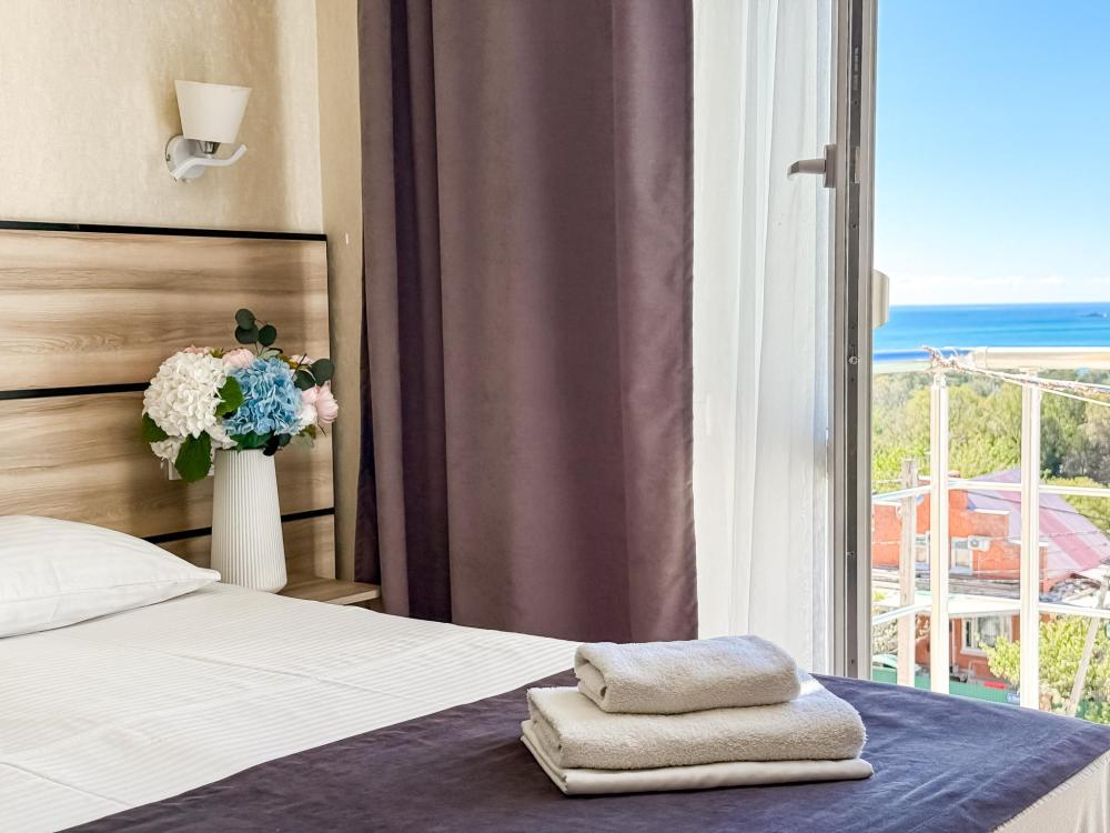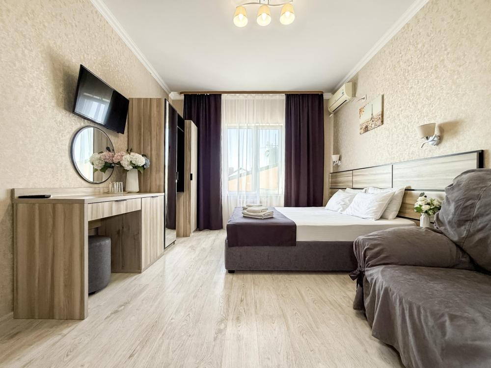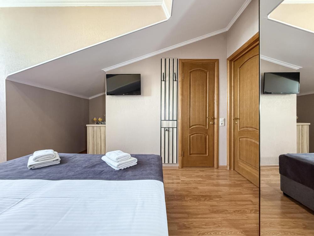 Трехместный номер с двуспальной кроватью и диваном/кроватью, в номере ЖК телевизор, холодильник, набор посуды, шкаф для одежды, вешалка, зеркало, журнальный столик
