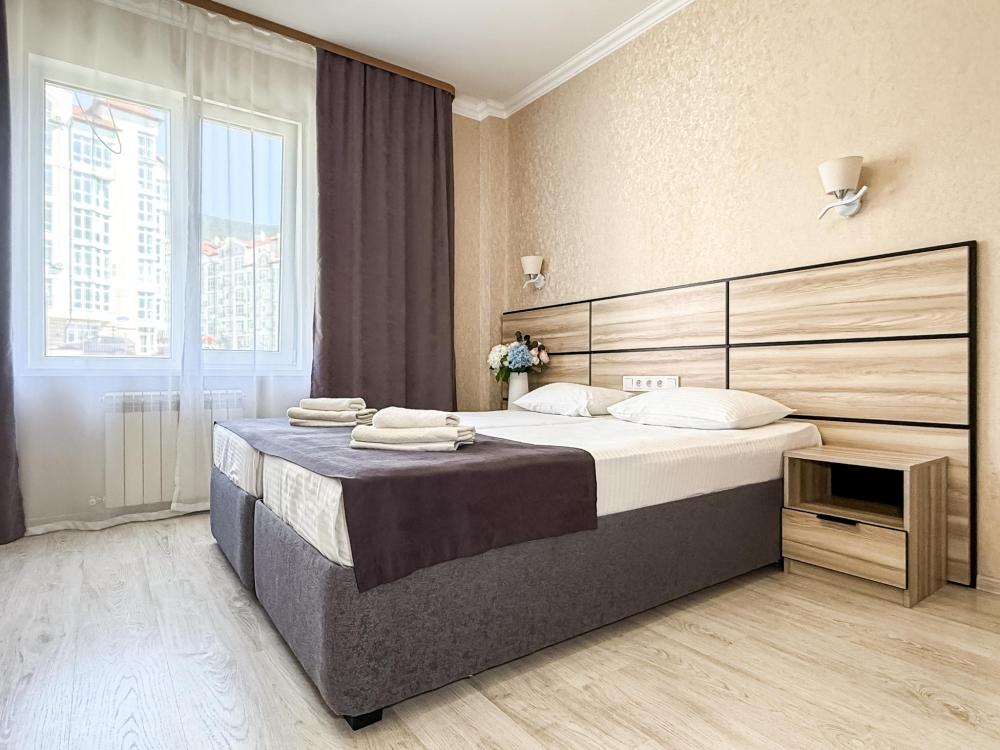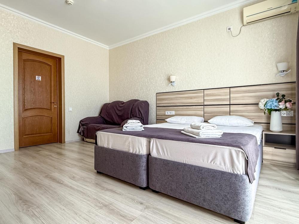 Четырехместный улучшенный номер с двуспальной и односпальной кроватью, диваном. В номере ЖК телевизор, холодильник, журнальный столик, шкаф для одежды, вешалка.
