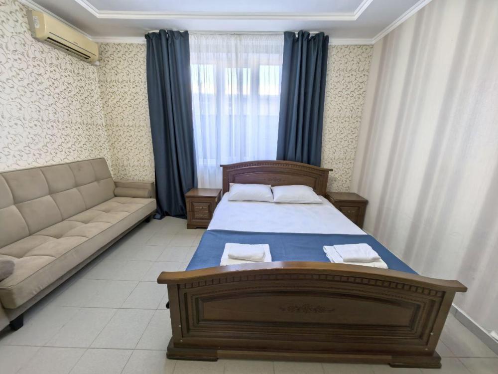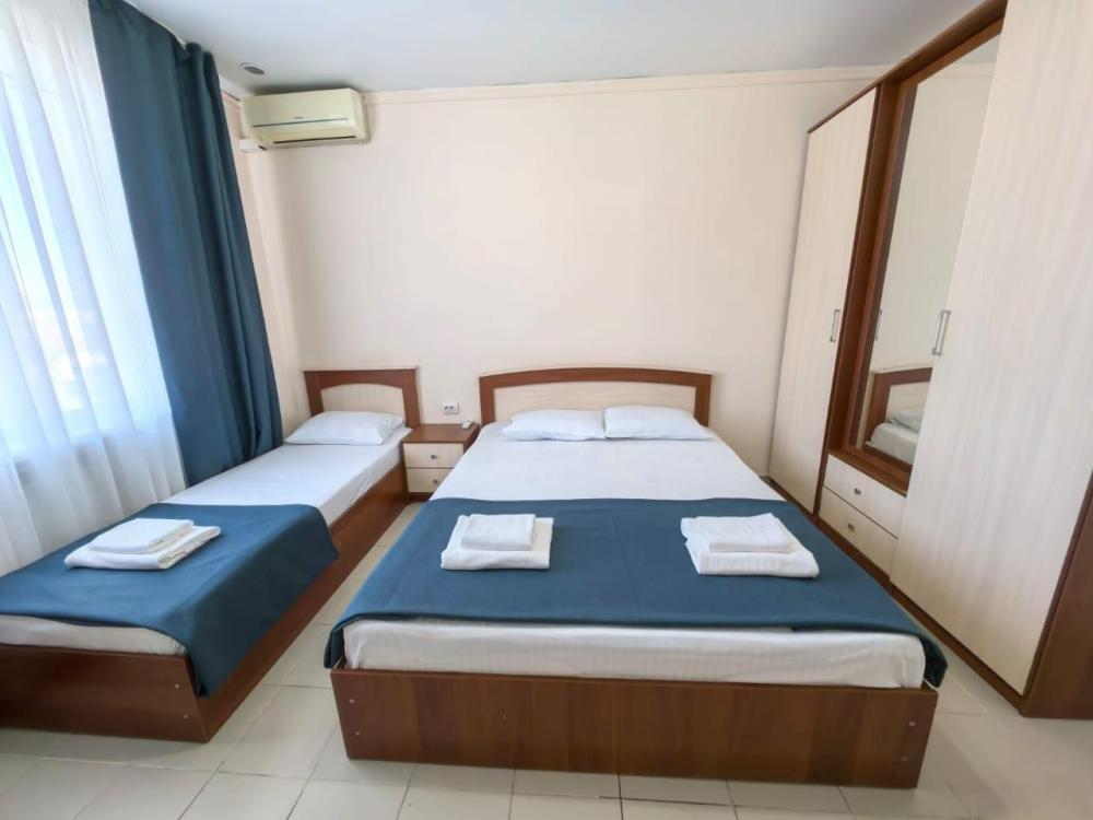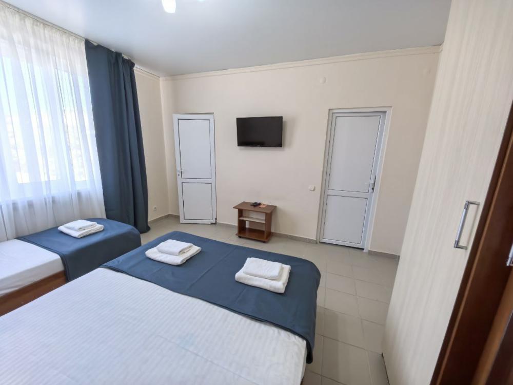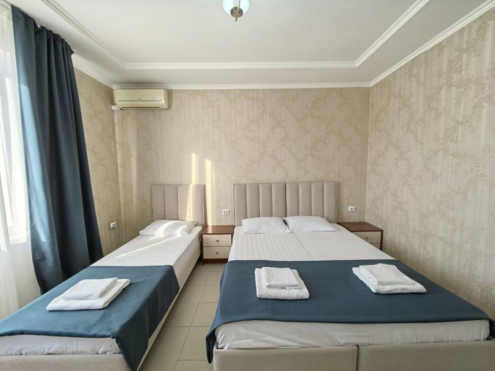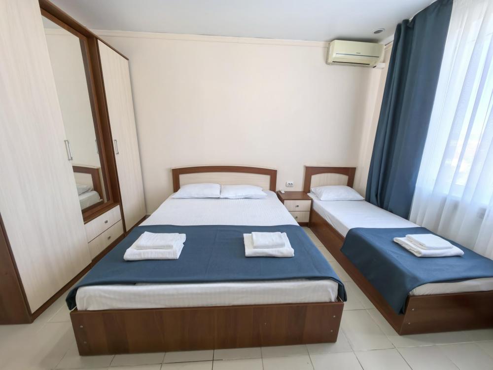 Трёх местный стандарт с одной двухспальной кроватью и одной односпальной кроватью. На ваш выбор есть номера с двумя односпальными кроватями. В номере: Душ-туалет Полотенце Бесплатный wi-fi Сплит-система Телевизор Мини-холодильник Чайник Кровати: на ваш выбор. Одна двуспальная и односпальная кровать. Три односпальные кровати. Номер имеет выход в общий коридор из которого можно попасть на большой общий балкон. На нем размещены столы стулья, где можно отдохнуть проводить закат с видом на город и море. Парковка, бассейн бесплатно.