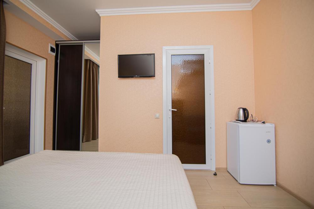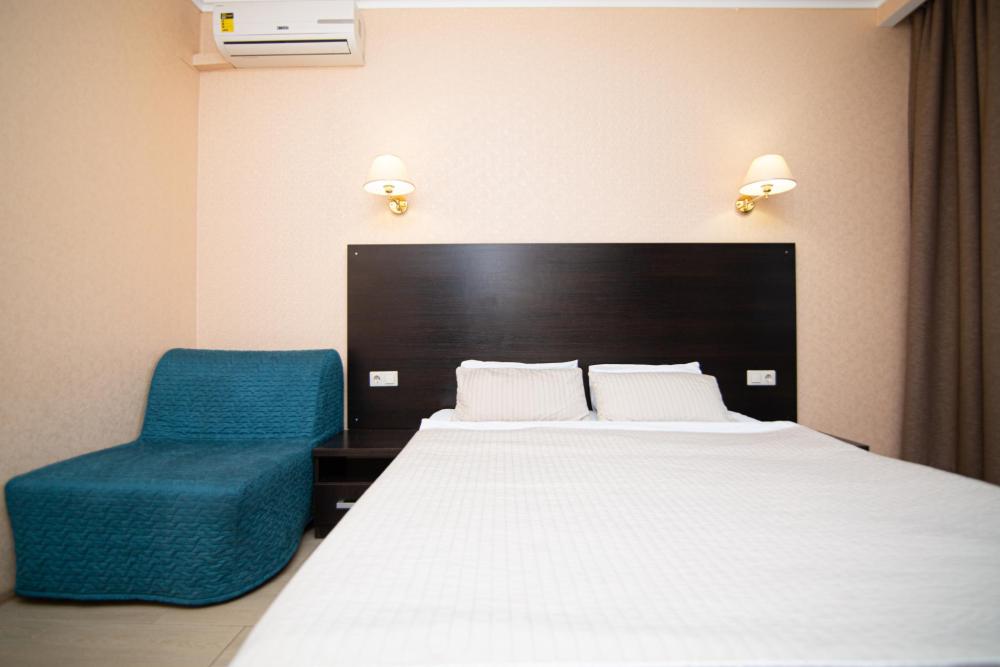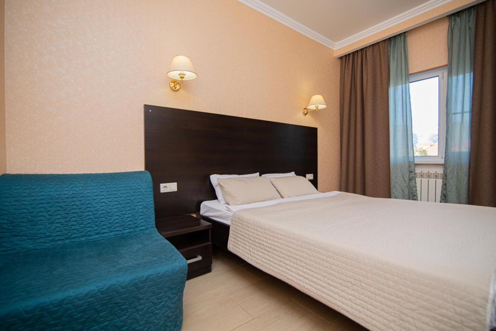 Трехместная комната идеально подойдет для проживания троих гостей, в том числе семей с детьми. В комнате большая двуспальная кровать и раскладное кресло. В комнате есть собственный санузел.