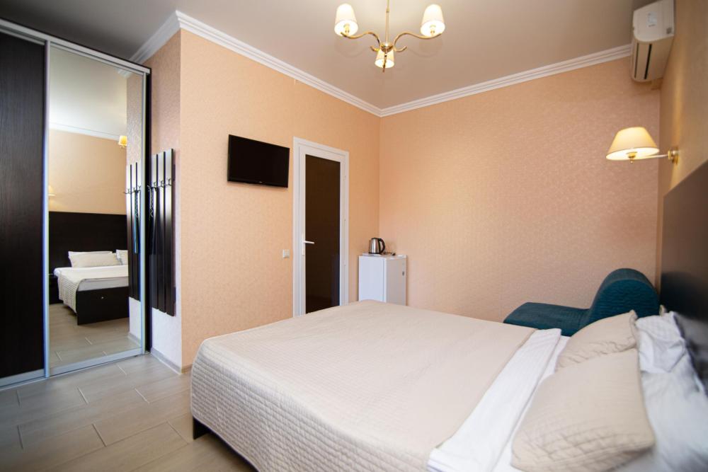 Двухкомнатный полулюкс для 4 гостей и семьи с детьми. В номере есть двуспальная кровать и раскладной двуспальный диван. Собственный санузел.