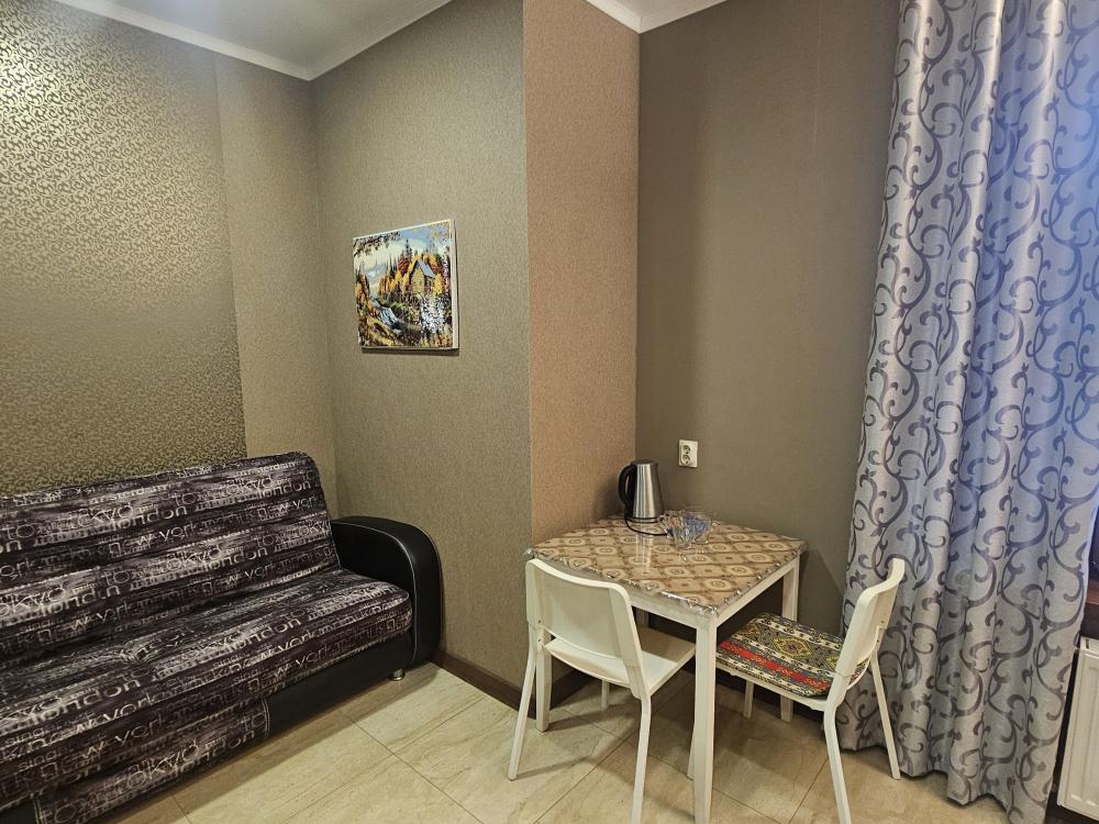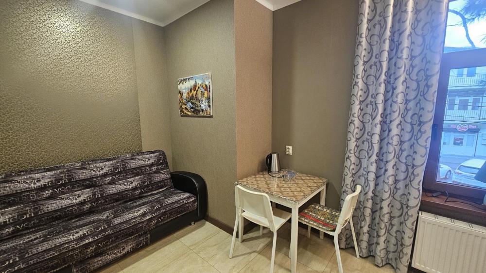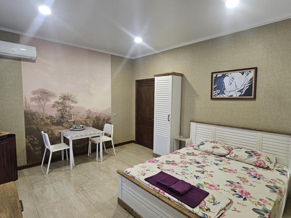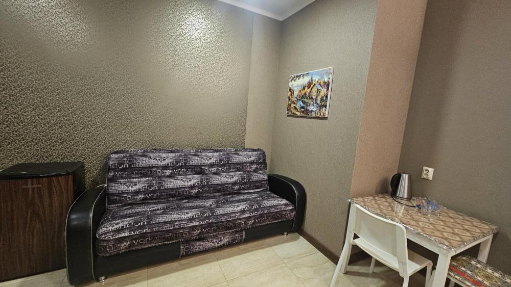 Комната люкс с 1 двуспальной кроватью и диваном. В комнате: телевизор, кондиционер, холодильник, санузел с душем.