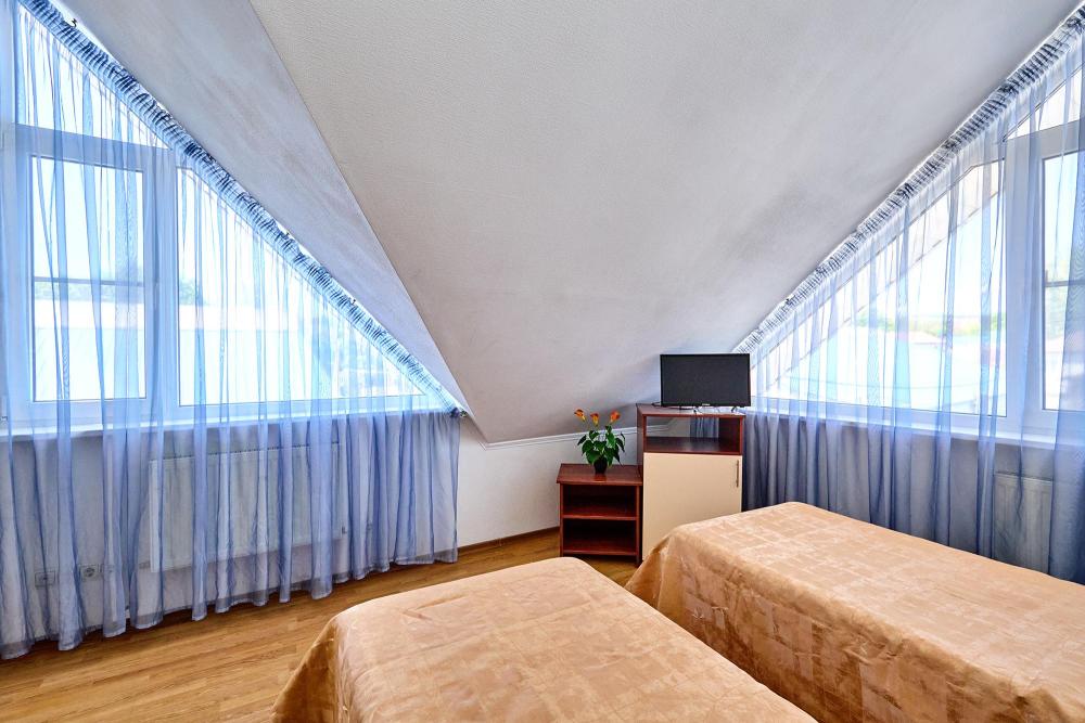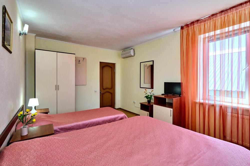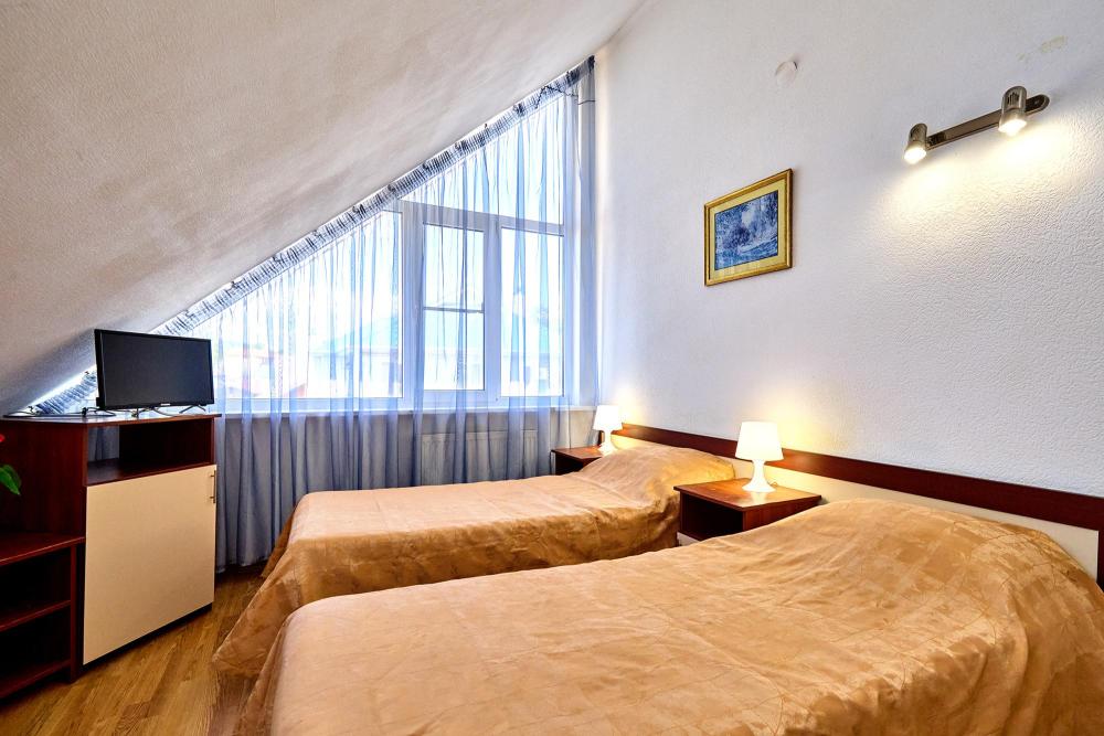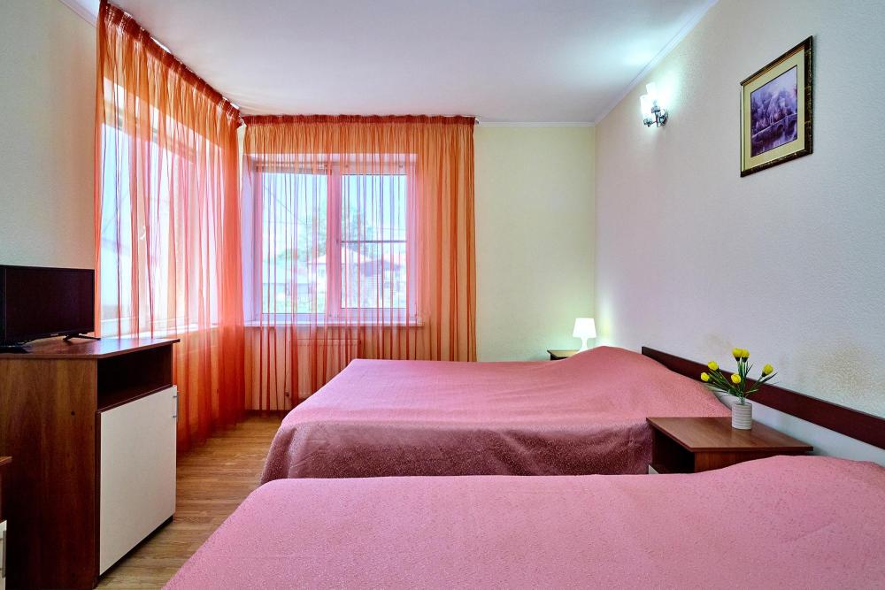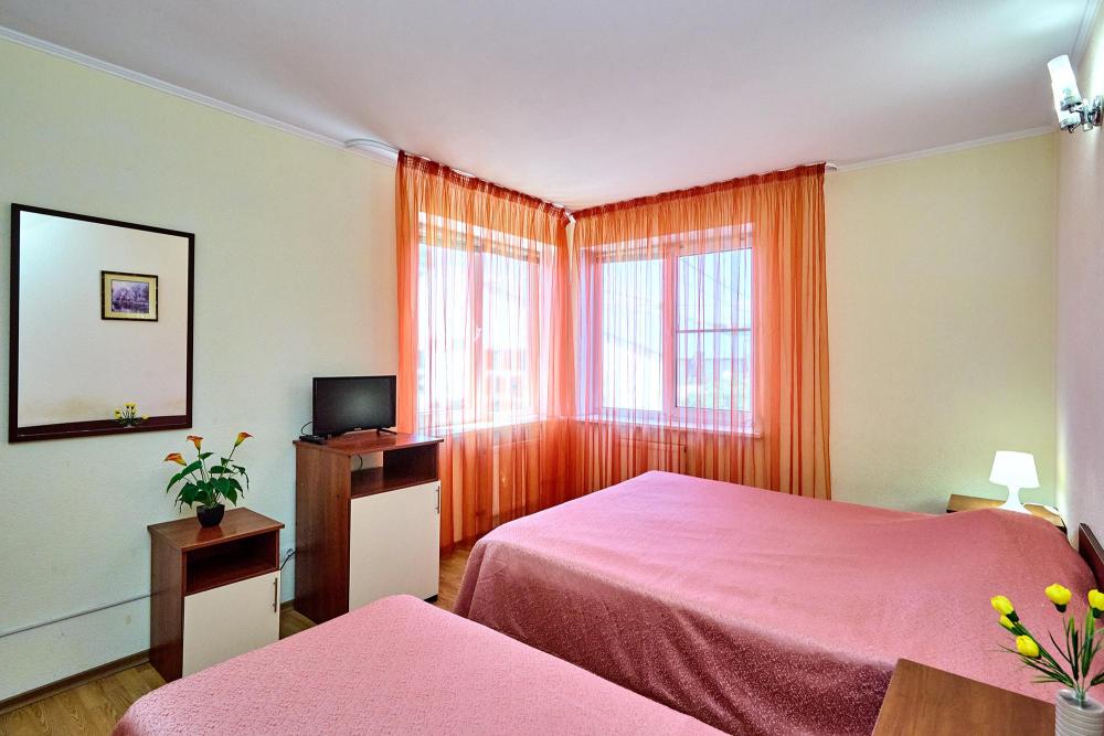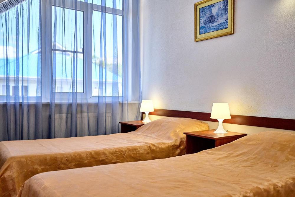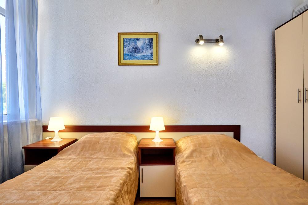 Стандартная четырехместная комната без балкона - три односпальные кровати и диван, либо двуспальная кровать, односпальная кровать и диван. В комнате: сплит-система, холодильник, ТВ на 20 каналов, прикроватные тумбы и светильники, шкаф для одежды, полотенца, туалетные принадлежности, фен, электрочайник, набор посуды, санузел и душ в номере.