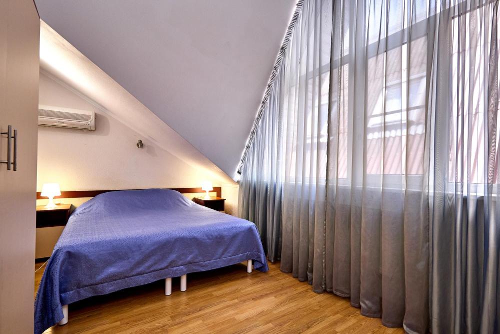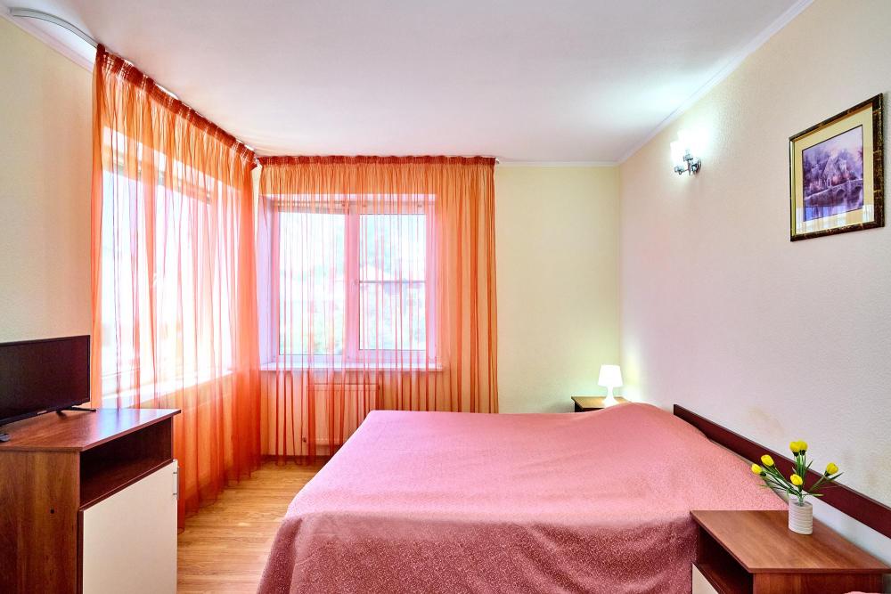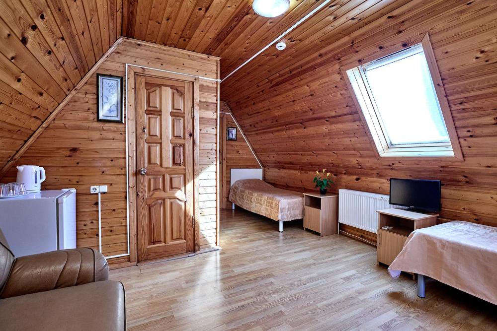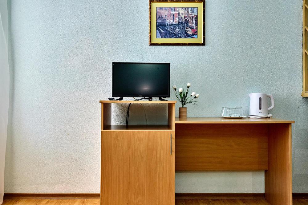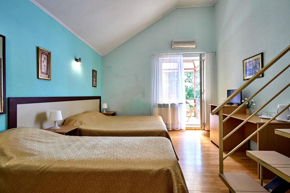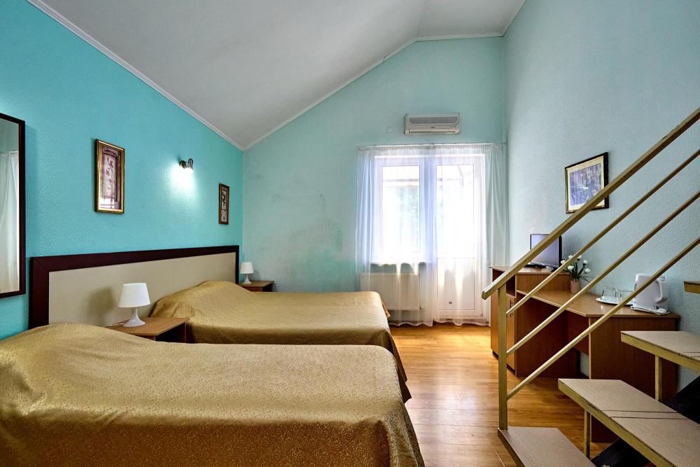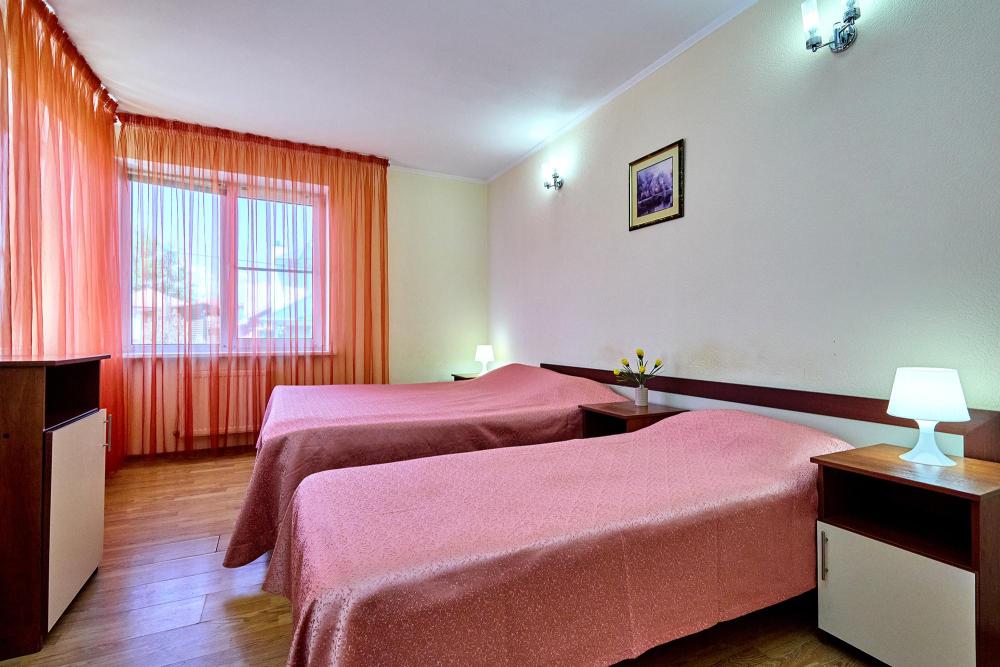 Стандартная четырехместная комната без балкона - три односпальные кровати и диван, либо двуспальная кровать, односпальная кровать и диван. В комнате: сплит-система, холодильник, ТВ на 20 каналов, прикроватные тумбы и светильники, шкаф для одежды, полотенца, туалетные принадлежности, фен, электрочайник, набор посуды, санузел и душ в номере.