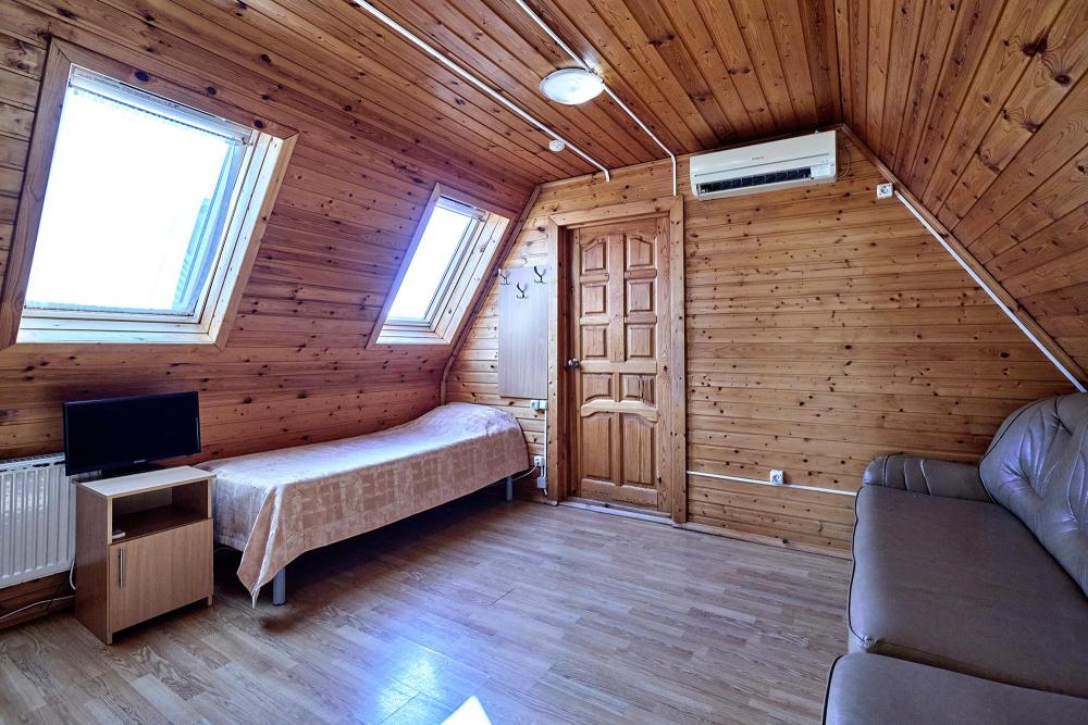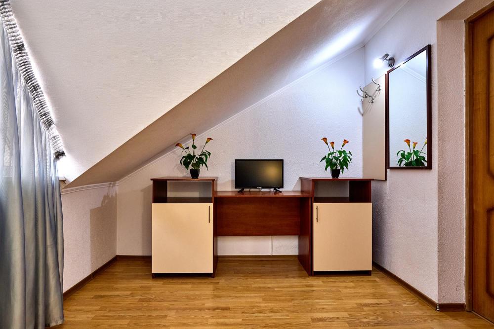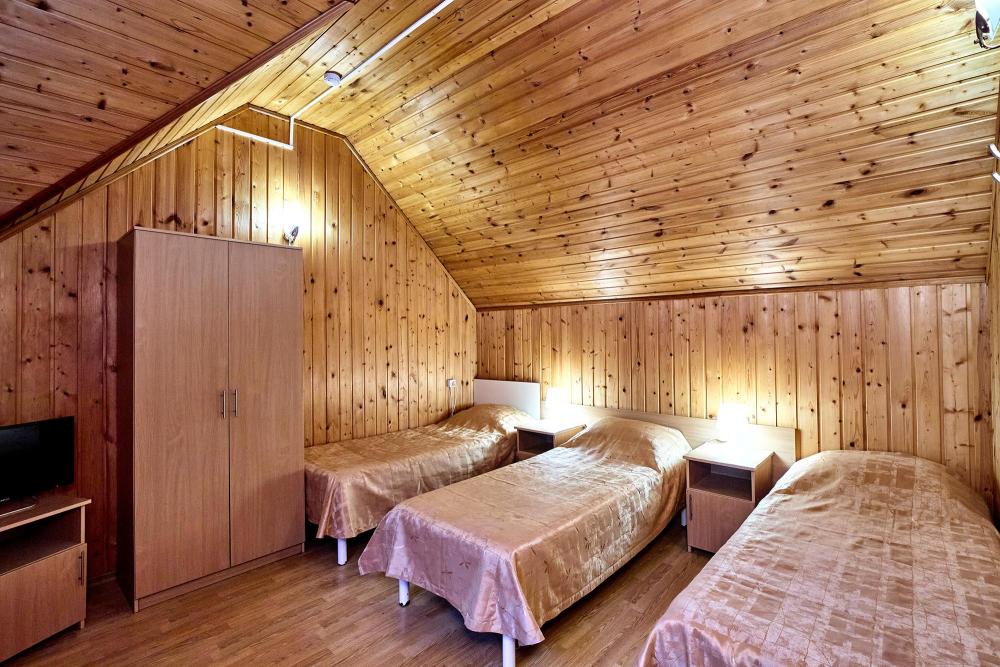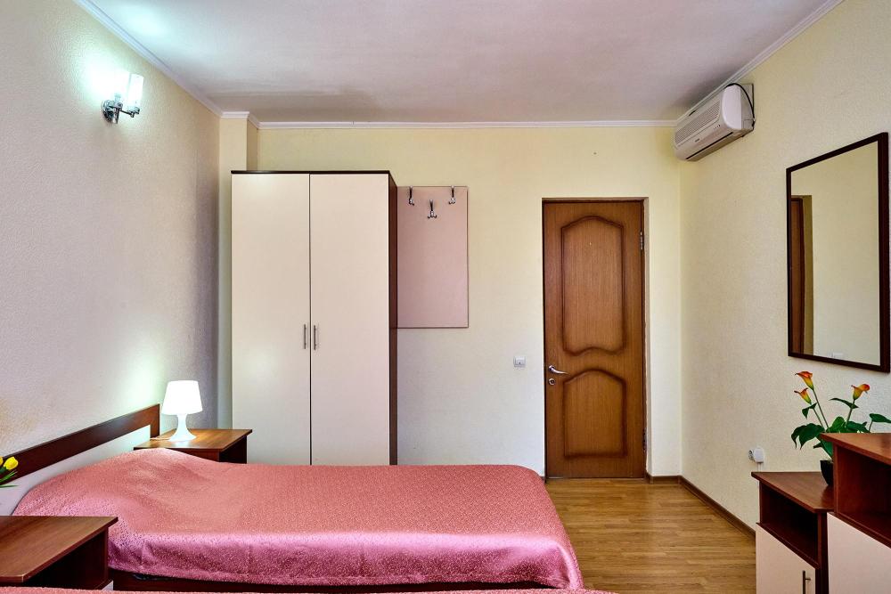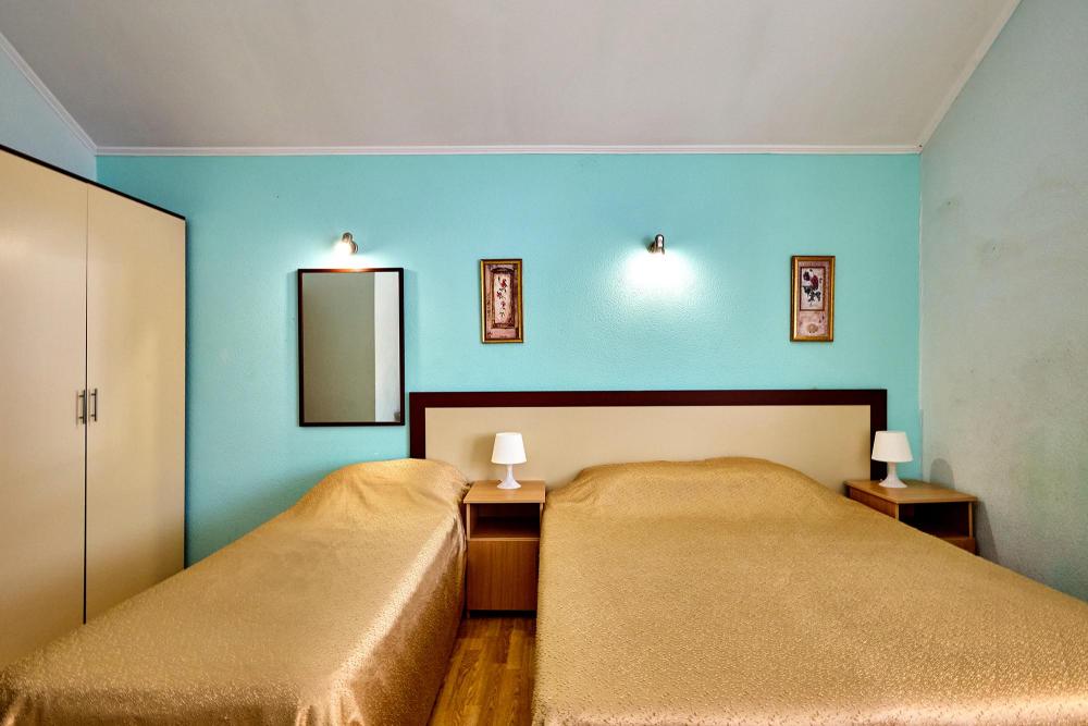 Трехместная комната эконом-класса без балкона с 1 двуспальной кроватью и одной односпальной, либо 3 односпальные кровати. В номере: сплит-система, холодильник, ТВ на 20 каналов, прикроватные тумбы и светильники, шкаф для одежды, полотенца, туалетные принадлежности, фен, электрочайник, набор посуды, санузел и душевая кабина на этаже.