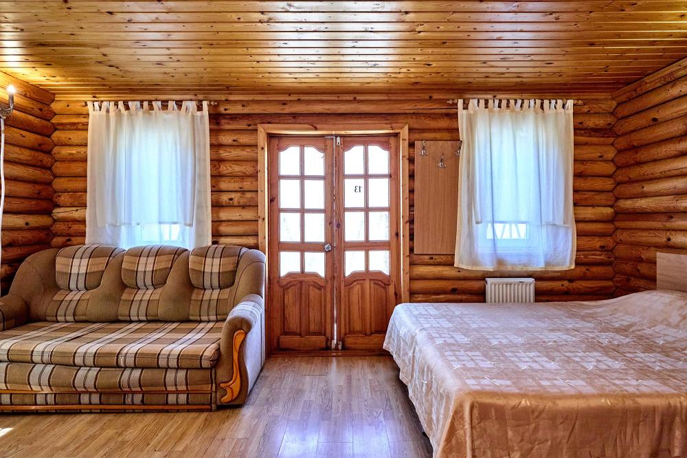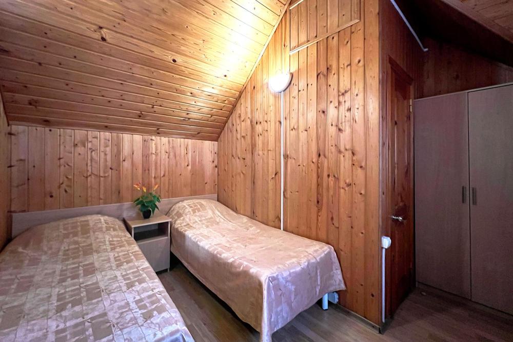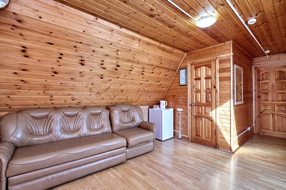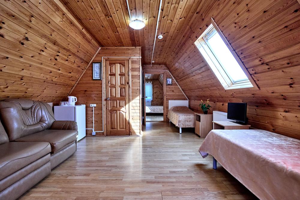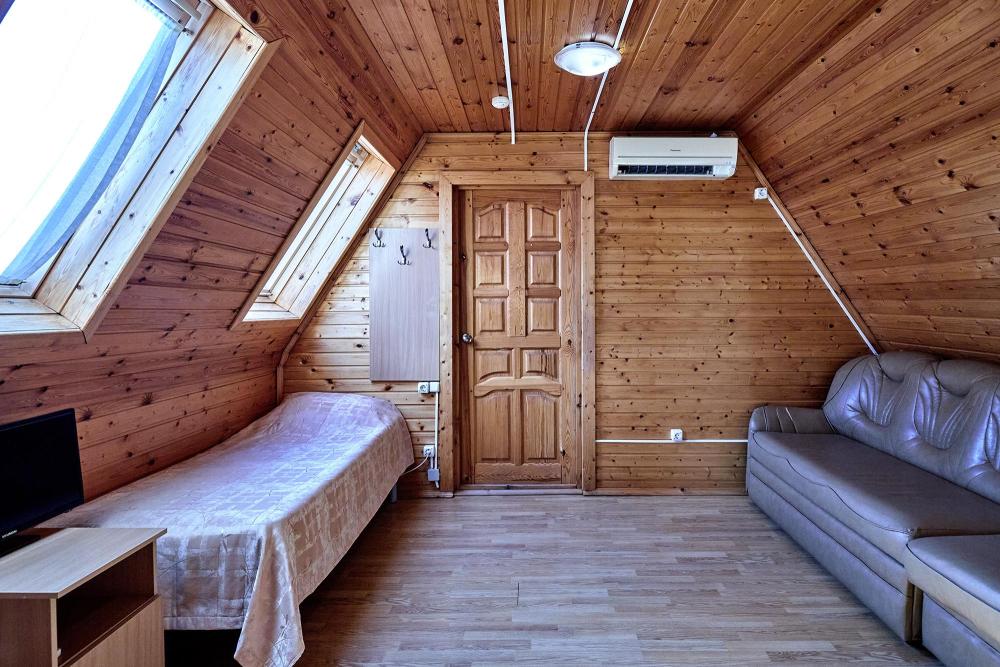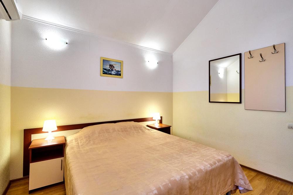 Стандартная семиместная комната без балкона с 1 двуспальной кроватью, двуспальным раскладным диваном и 4 односпальными кроватями. В комнате: сплит-система, холодильник, ТВ на 20 каналов, прикроватные тумбы и светильники, шкаф для одежды, полотенца, туалетные принадлежности, фен, электрочайник, набор посуды, санузел и душ в номере.