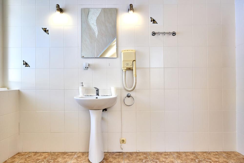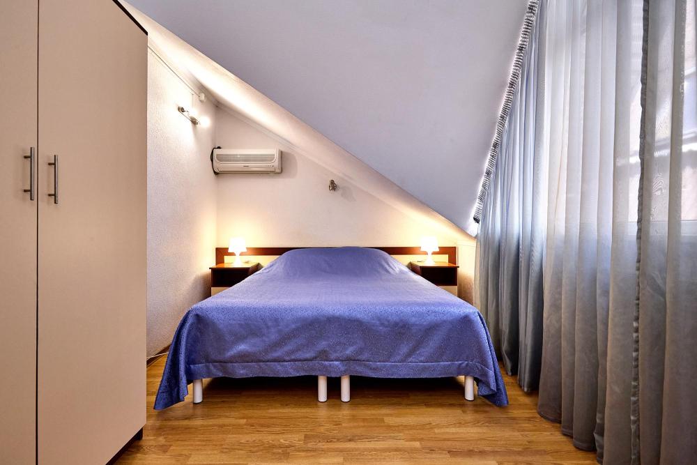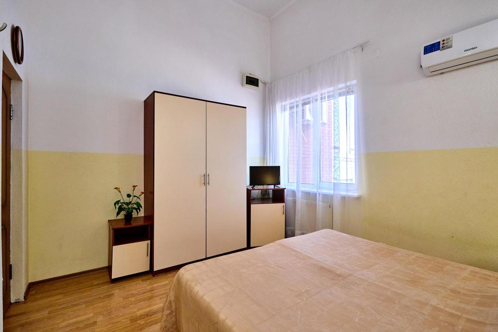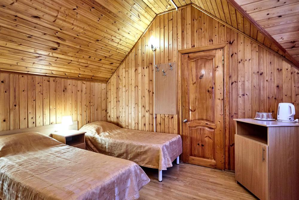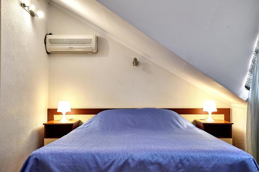 Двухместная комната эконом-класса без балкона с 1 двуспальной кроватью или 2 отдельными кроватями. В комнате: сплит-система, холодильник, ТВ на 20 каналов, прикроватные тумбы и светильники, шкаф для одежды, полотенца, туалетные принадлежности, фен, электрочайник, набор посуды, санузел и душевая кабина на этаже.