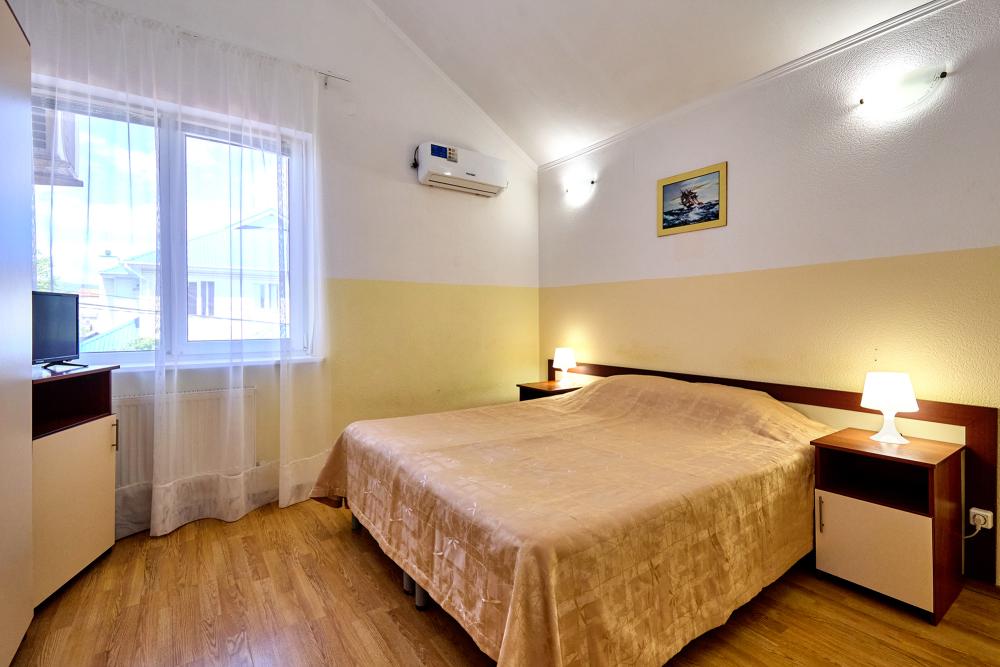 Стандартная пятиместная комната без балкона с 1 двуспальной кроватью и 3 односпальными кроватями, либо 3 односпальные кровати и двуспальный диван. В комнате: сплит-система, холодильник, ТВ на 20 каналов, прикроватные тумбы и светильники, шкаф для одежды, полотенца, туалетные принадлежности, фен, электрочайник, набор посуды, санузел и душ в номере.
