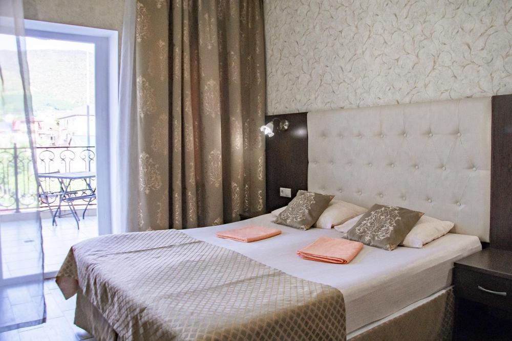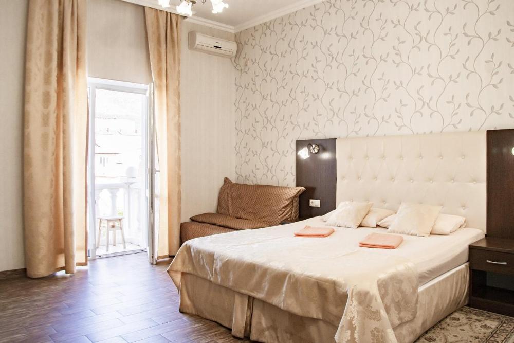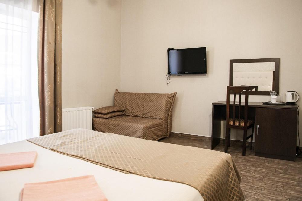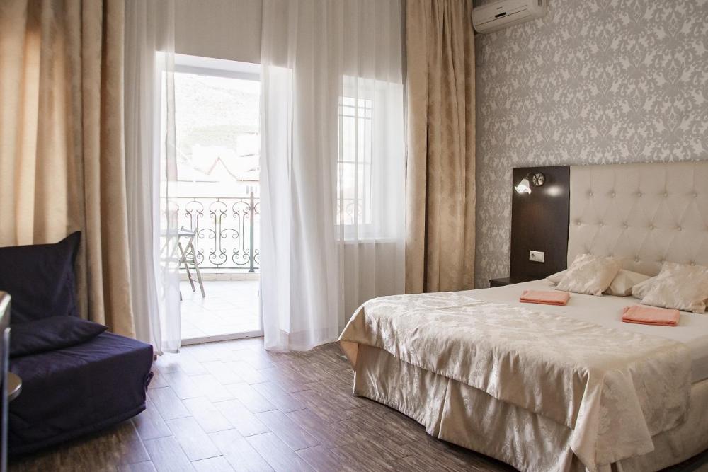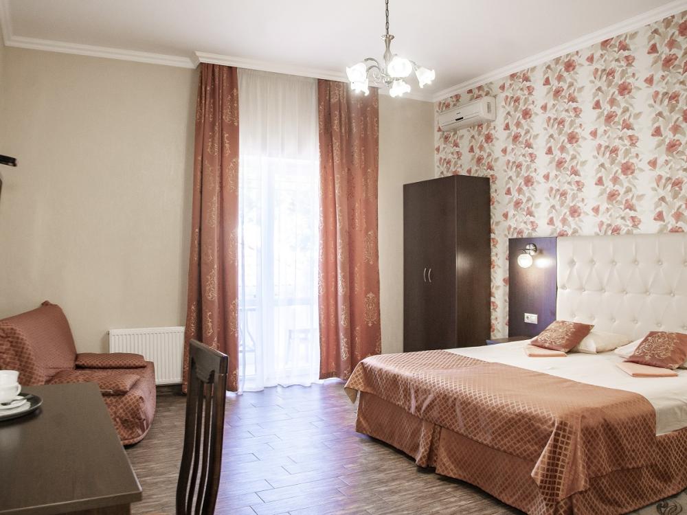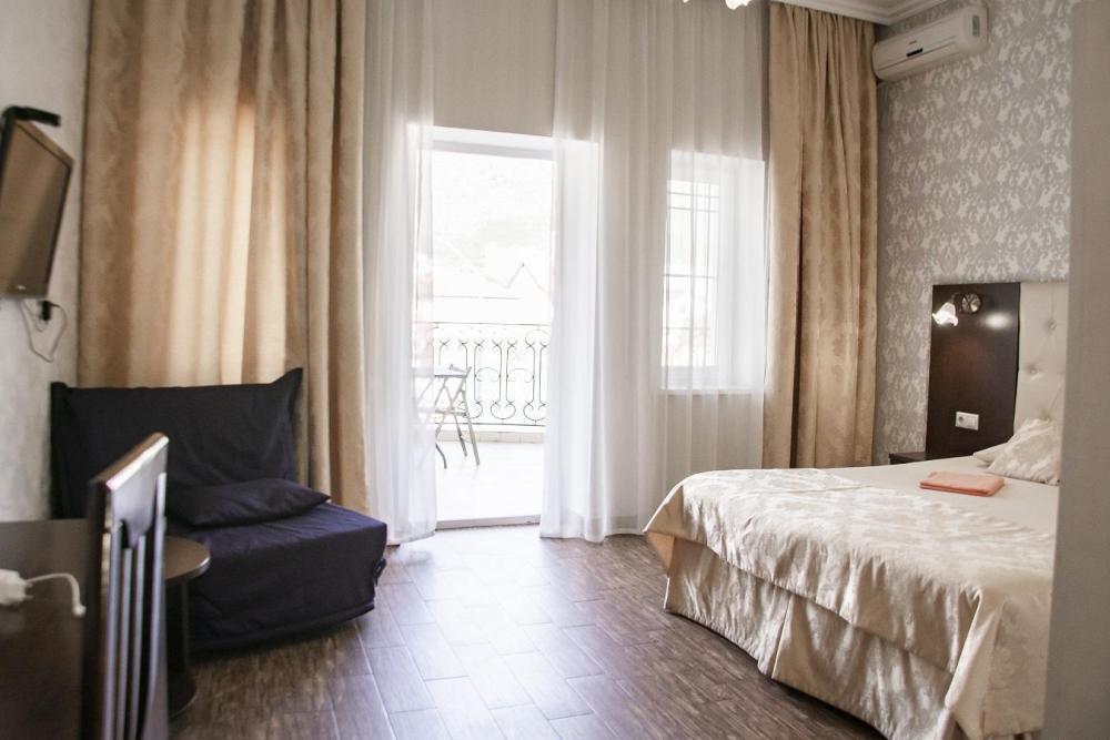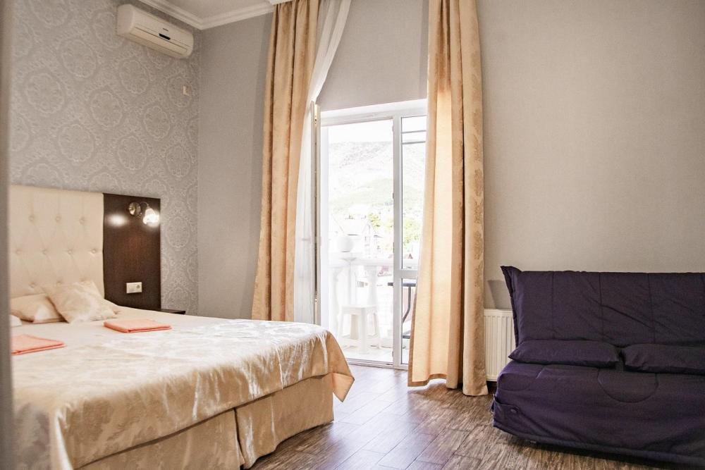 Комната рассчитана на размещение до 3 гостей. Два основных спальных места и одно дополнительное. В комнате: большая двуспальная кровать, балкон с видом на горы, телевизор с плоским экраном, собственный душ ,туалет, мини-холодильник, чайник, столовые принадлежности.