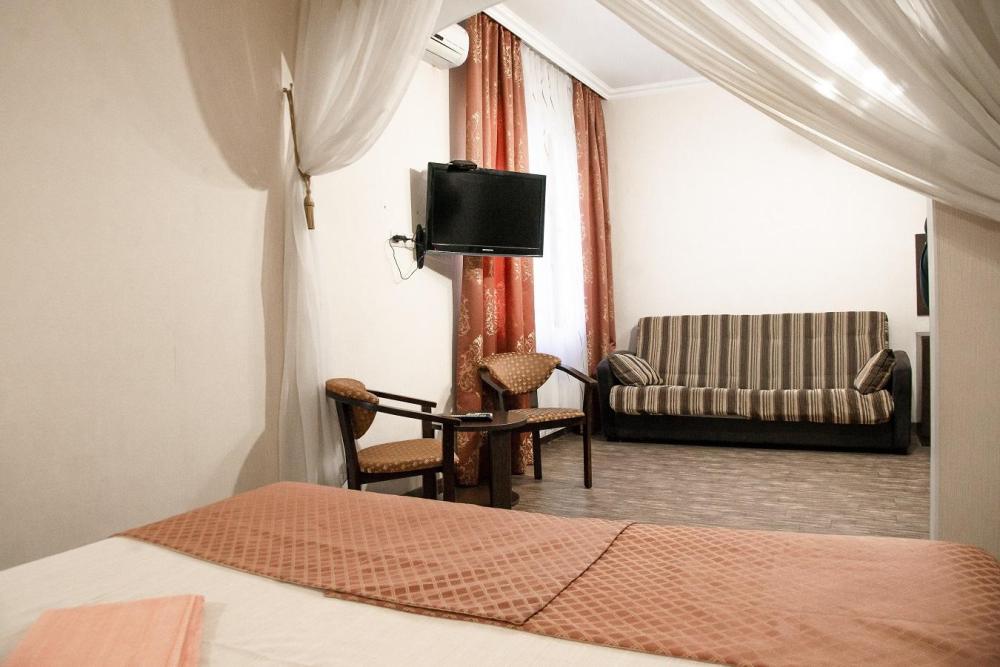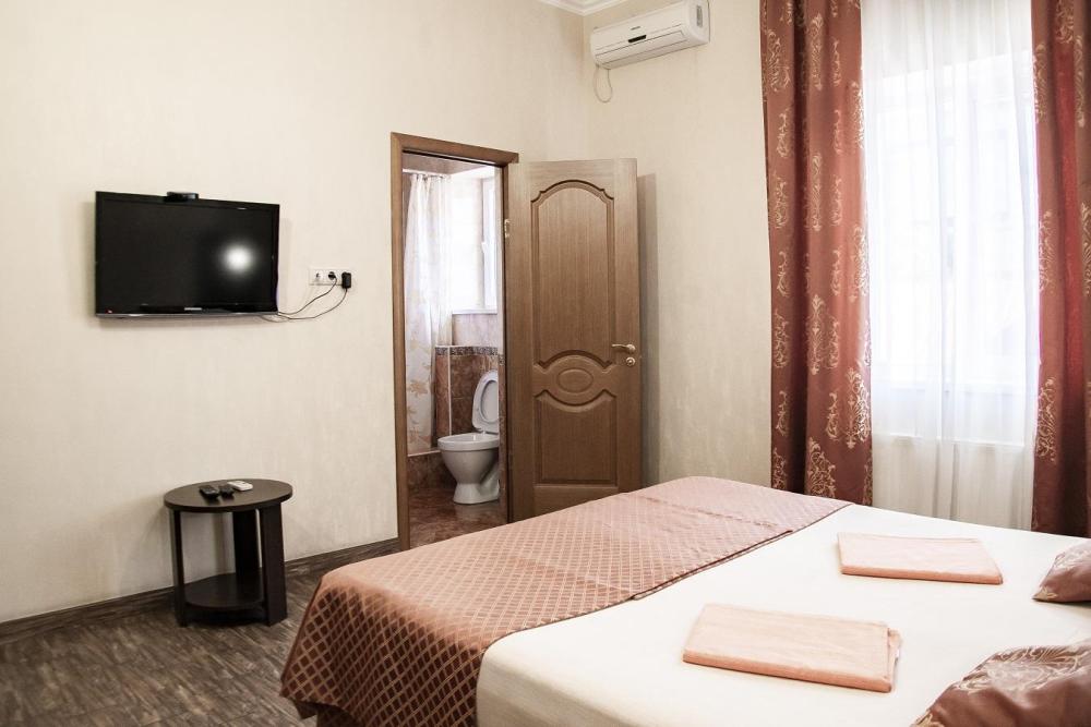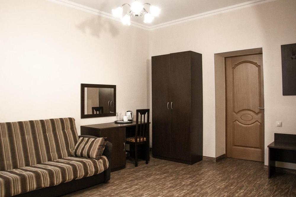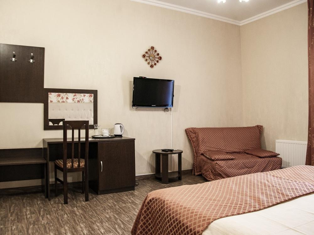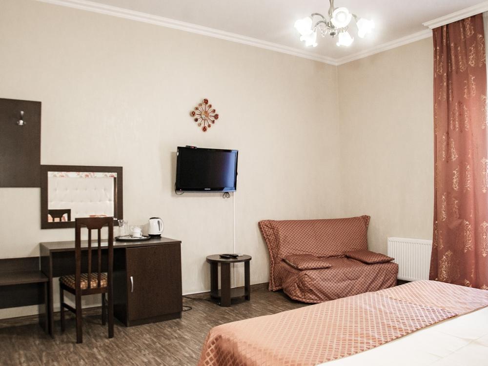 Комната рассчитана на размещение до 5 гостей. Три основных спальных места и два дополнительных. В комнате: двуспальная кровать и диван-кровать, телевизор с плоским экраном, собственный душ, туалет, мини-холодильник, чайник, столовые принадлежности. ДАННЫЙ НОМЕР со всеми удобствами находится на низком первом этаже.