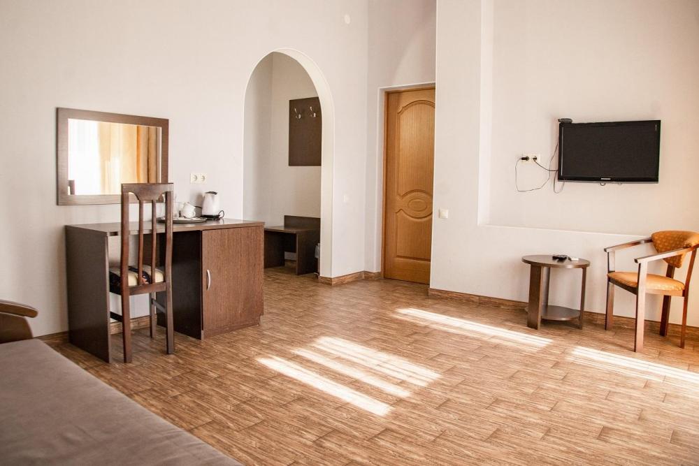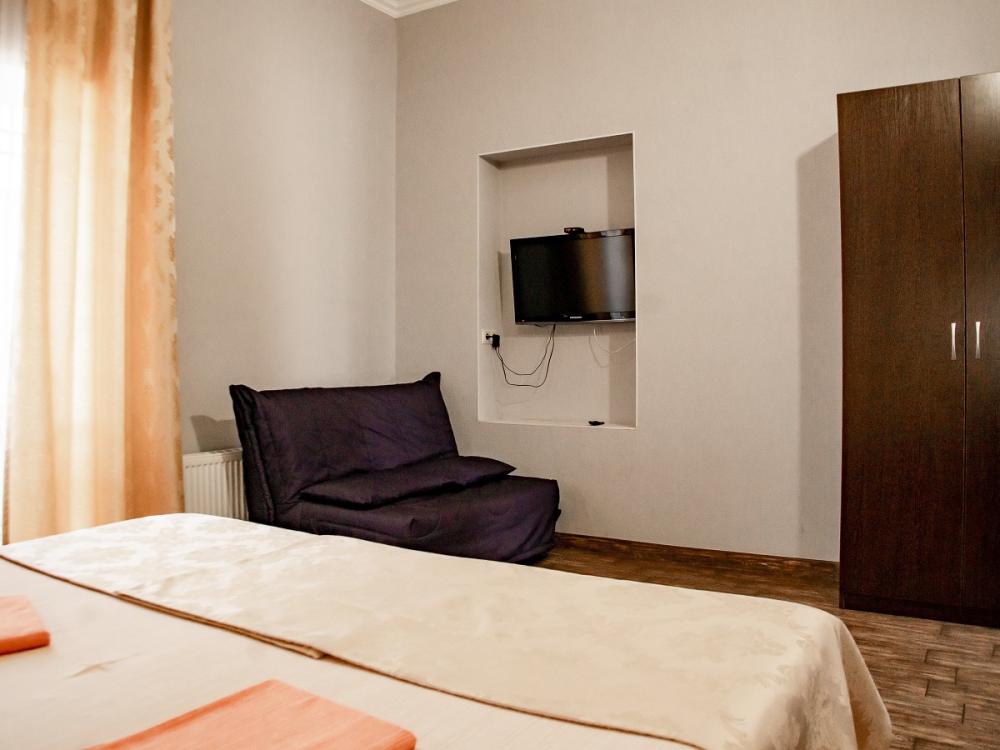 Комната рассчитана на размещение до 4 гостей. Три основных спальных места и одно дополнительное. В комнате: большая двуспальная кровать и кресло кровать, телевизор с плоским экраном, собственный душ, туалет, мини-холодильник, чайник, столовые принадлежности.