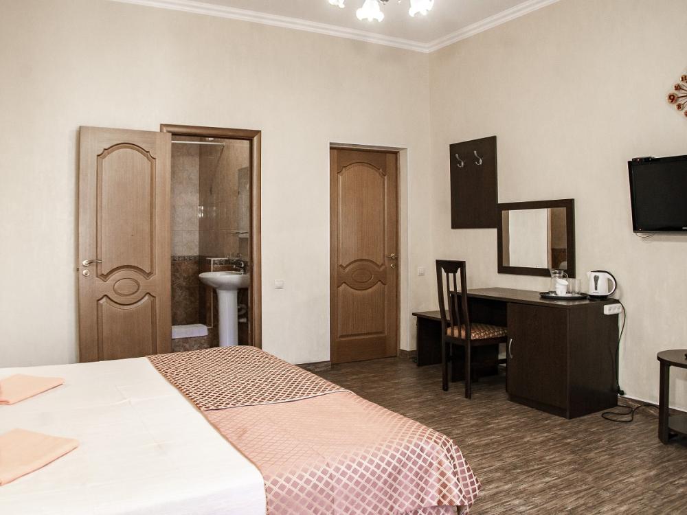 Комната рассчитана на размещение до 3 гостей. Два основных спальных места и одно дополнительное. В комнате: большая двуспальная кровать, телевизор с плоским экраном, собственный душ, туалет, мини-холодильник, чайник, столовые принадлежности.