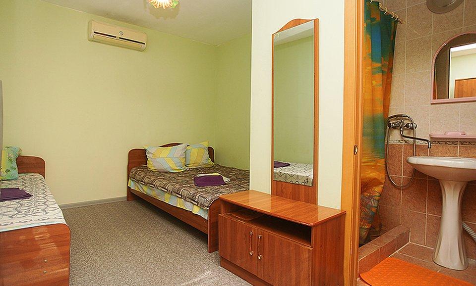 Комната улучшенная с двумя односпальными кроватями для размещения до 2-х гостей (с возможностью установки дополнительного места). Оснащение: 2 односпальные кровати, кондиционер, телевизор, холодильник, шкаф, ванная комната с душем, туалетом и туалетно-косметическими принадлежностями.