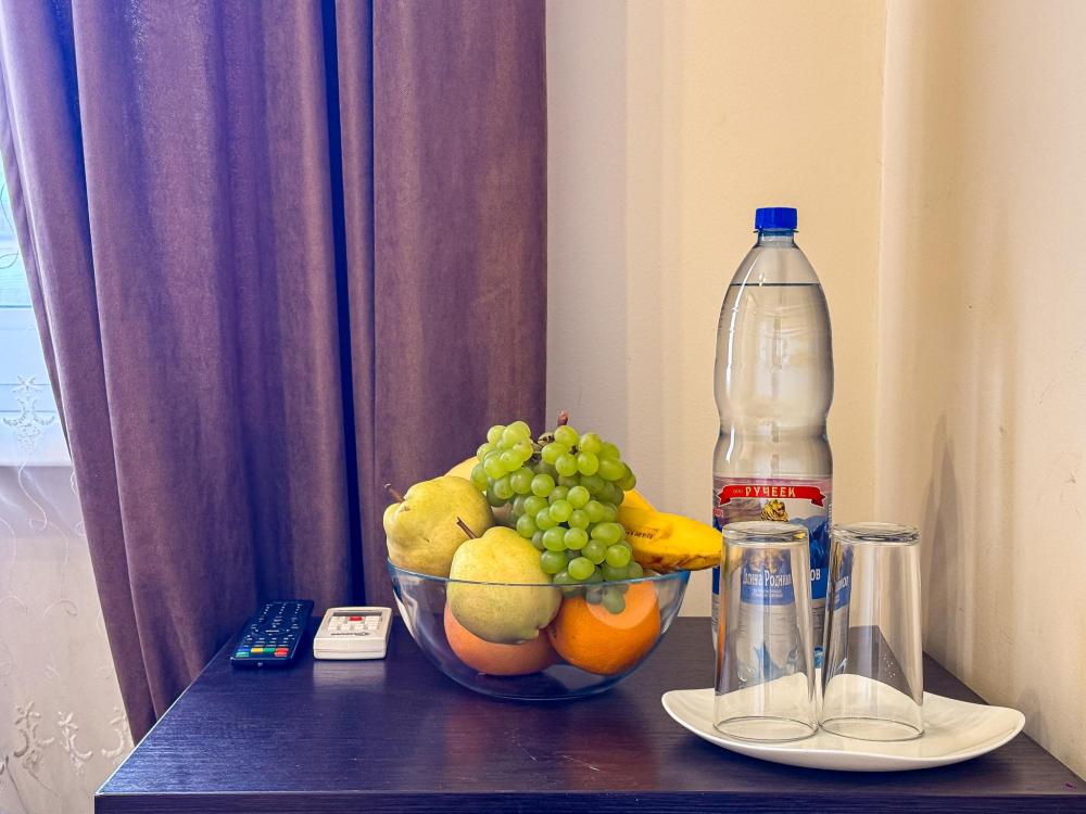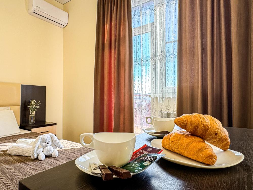 Двухместный номер стандарт общей площадью 20 кв.м. для размещения до 3-х гостей. Оснащение номера: двухспальная кровать, раскладное кресло, прикроватные тумбочки, шкаф, кондиционер, телевизор, ванная комната с душем, полотенца, туалетно-косметические принадлежности.