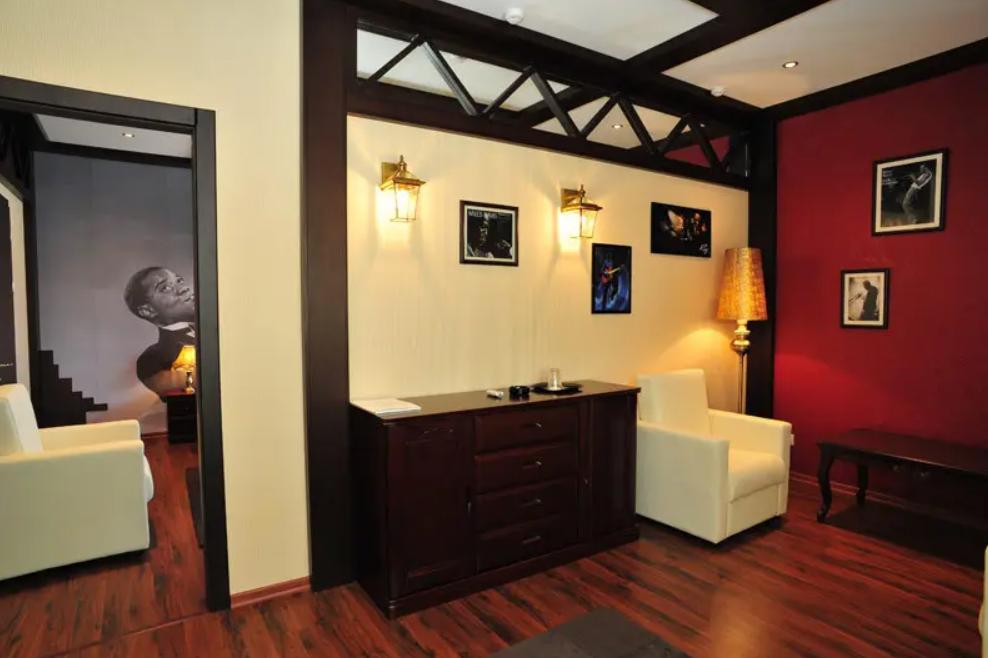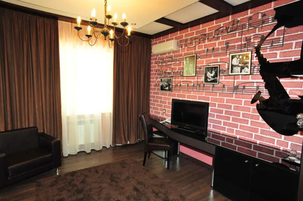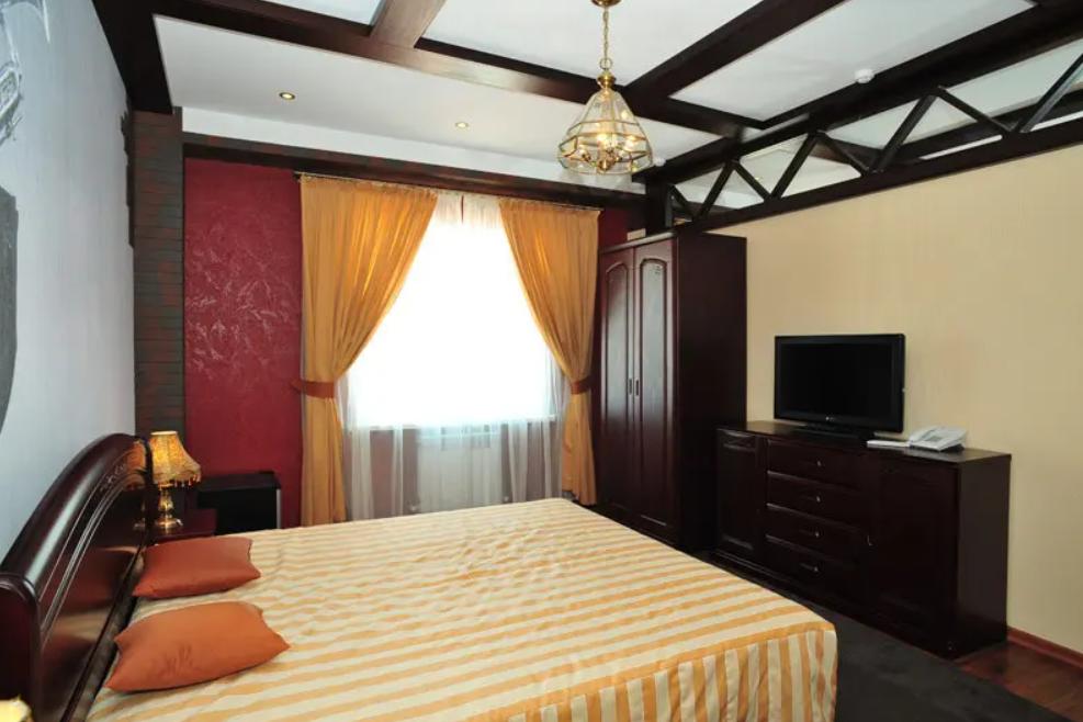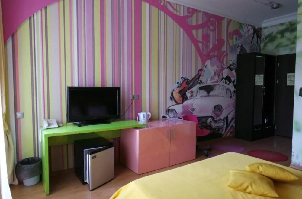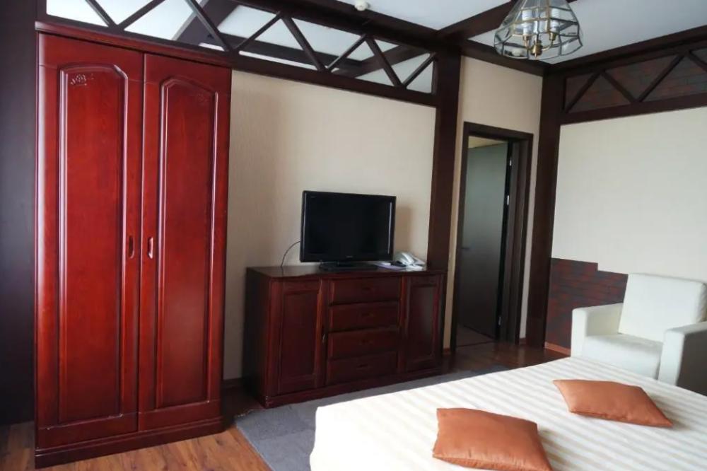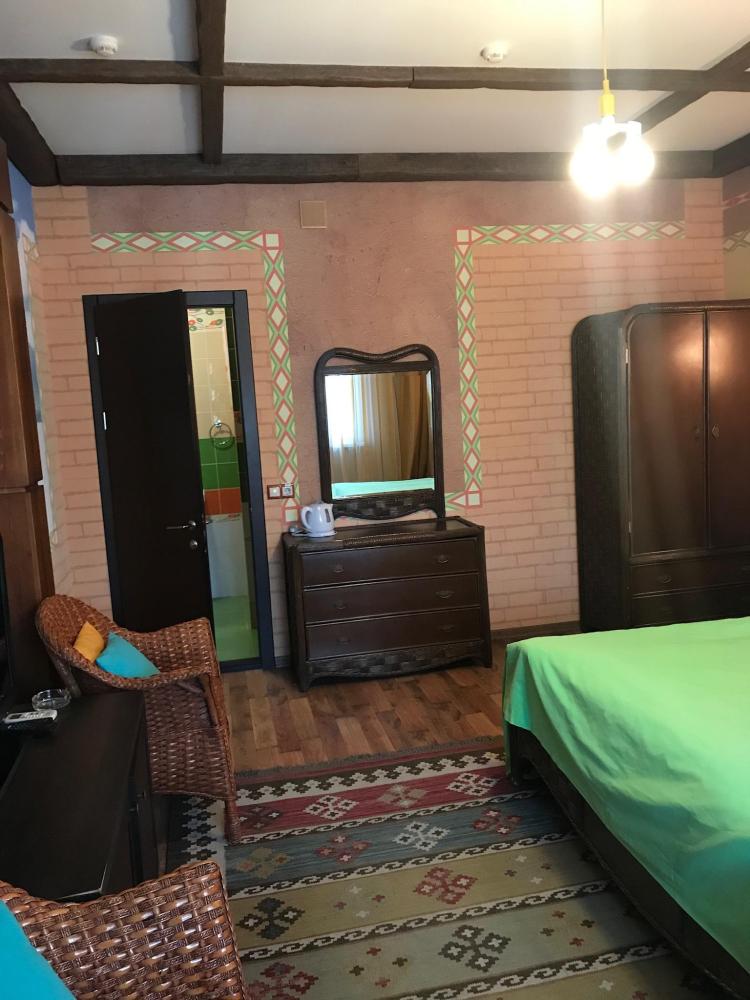 Красивый и хорошо продуманный номер. Укомплектован всем необходимым: двуспальная кровать, просторный шкаф-купе, две тумбочки, пуфик или кресло, телевизор, холодильник, кондиционер, сейф, чайник, необходимый набор посуды. Совмещенный санузел: фен, одноразовые гигиенические принадлежности.Площадь номера составляет 25 кв.м. У некоторых номеров есть свой балкон и есть номера с общей террасой.