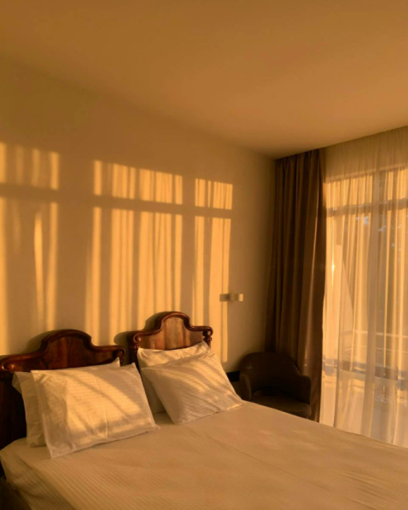 Уютный номер, оборудованный всем необходимым для комфортного проживания. В номере: двуспальная кровать, прикроватные тумбочки, шкаф, телевизор, рабочий стол, стул, кондиционер, фен, ванная комната с душем и санузлом. Номер с балконом и красивым видом на море. В некоторых номерах возможно использовать две односпальные кровати.