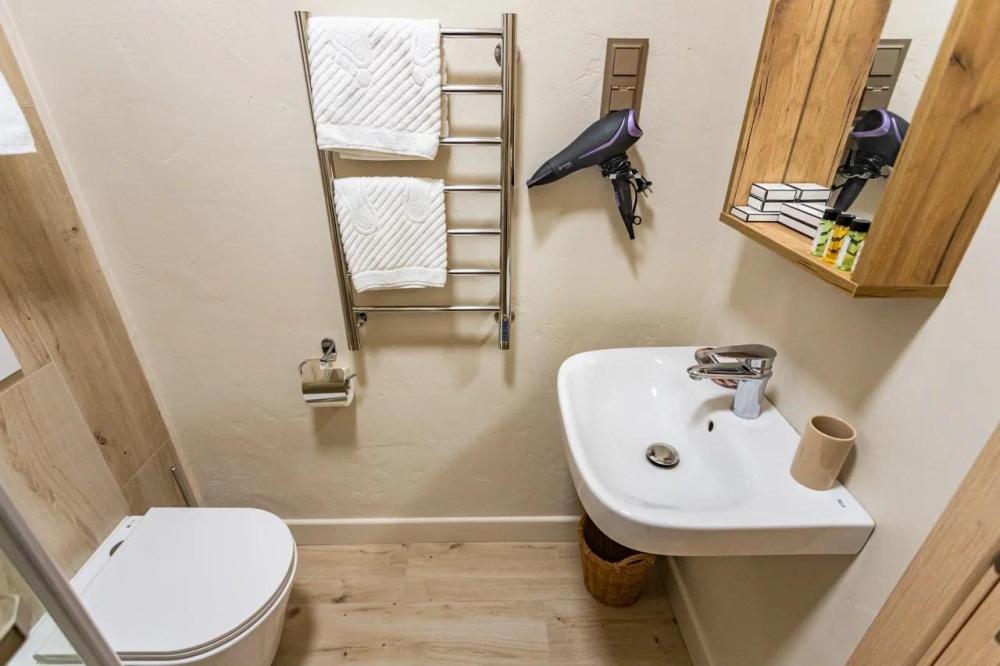 Уютный номер, оборудованный всем необходимым для комфортного проживания. В номере: двуспальная кровать, шкаф, телевизор, рабочий стол, стул, кондиционер, ванная комната с душем и санузлом.