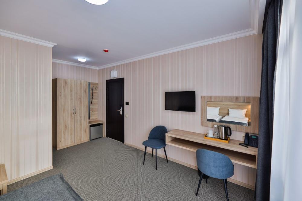 Однокомнатный номер стандартной категории с двумя односпальными или одной двуспальной кроватью с балконом. Выполнены в традиционном, классическом стиле и обставлены удобной мебелью. В каждом номере имеется ванная комната, сплит-система, сейф, фен, туалетные принадлежности для каждого гостя.