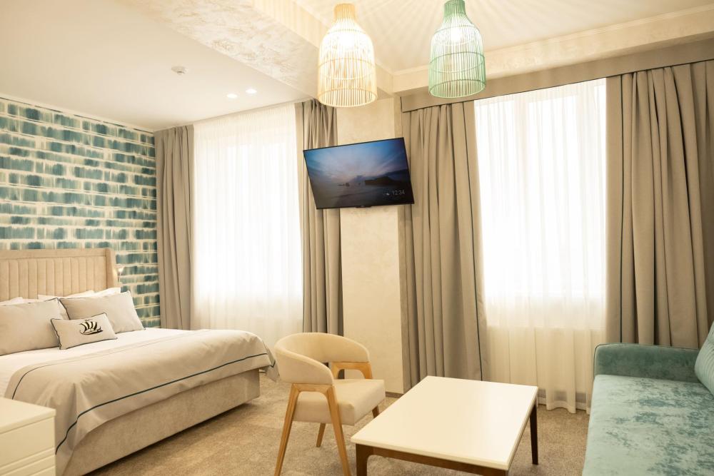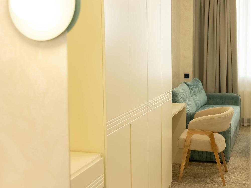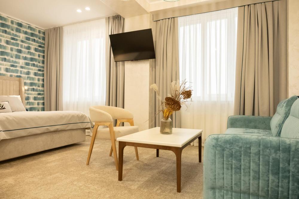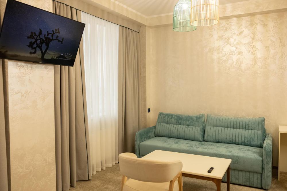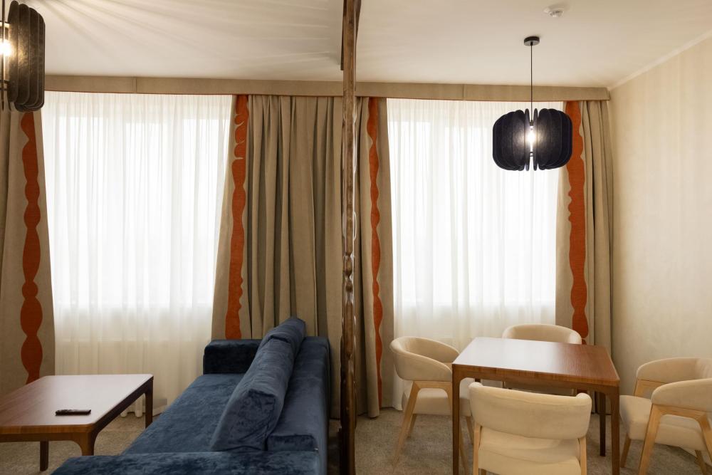 Семейный Люкс 53 м² идеально подойдет гостям, которые ценят комфорт и внимание к деталям. Интерьер номера выполнен в сдержанных тонах с яркими акцентами, создающими атмосферу уюта и изысканности. Номер состоит из просторной спальни, и элегантной гостиной с выделенной зоной отдыха с уютными креслами и журнальным столиком. Каждый номер оборудован просторной ванной комнатой с современной сантехникой, тропическим душем и полами с подогревом. Окна номеров данной категории выходят во двор, что обеспечивает спокойную атмосферу и уединение.