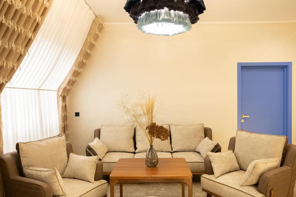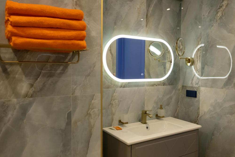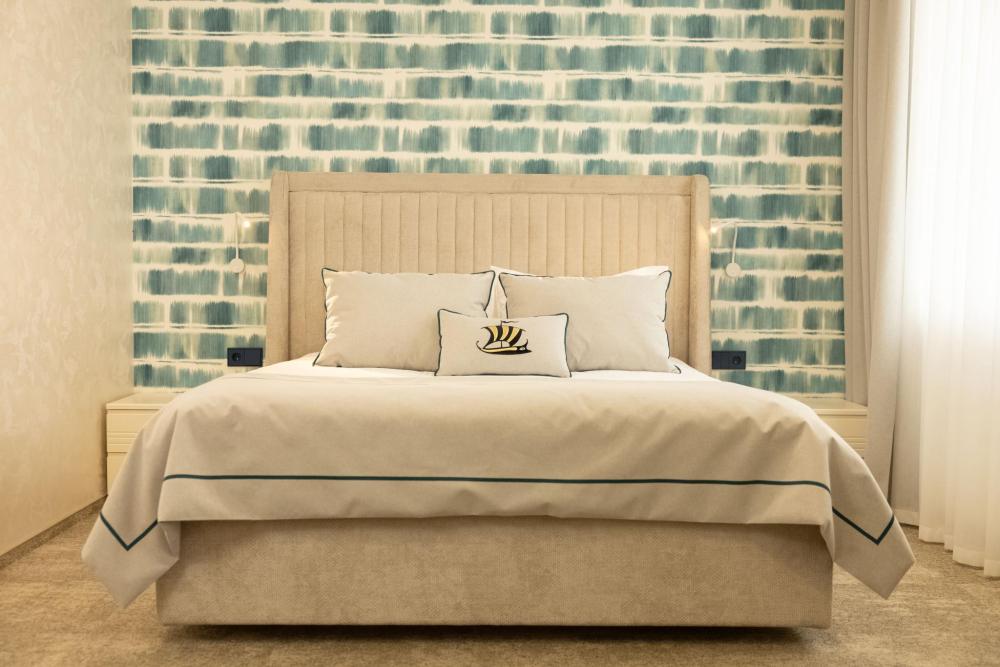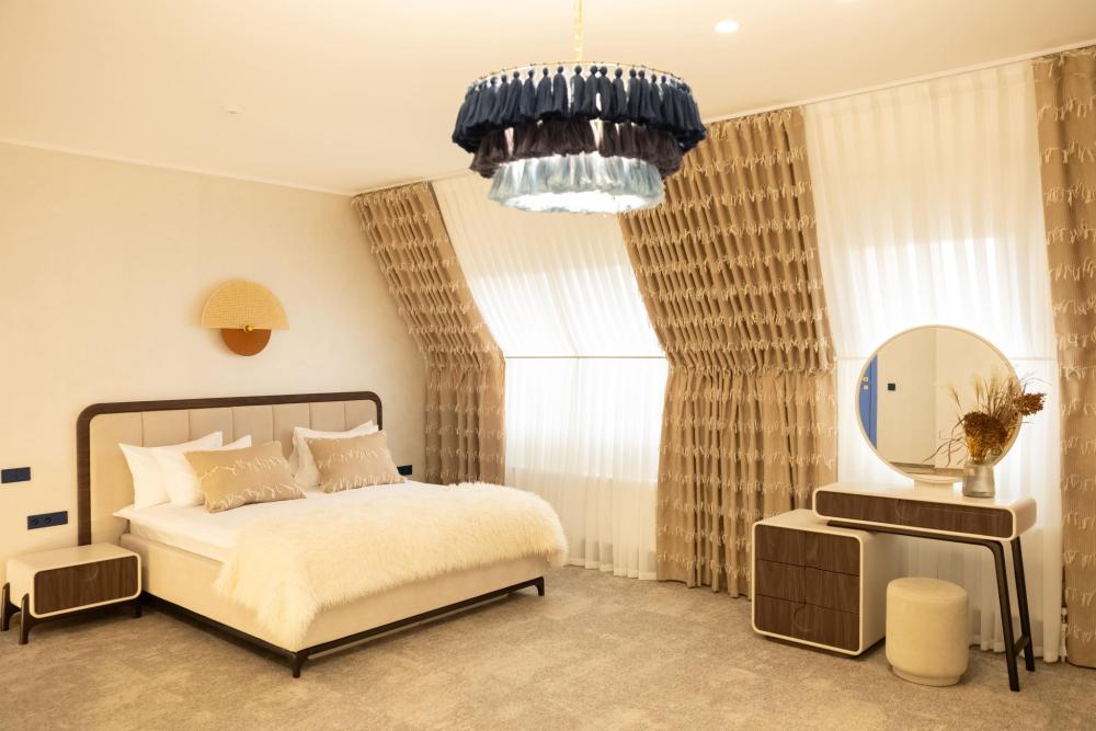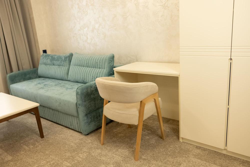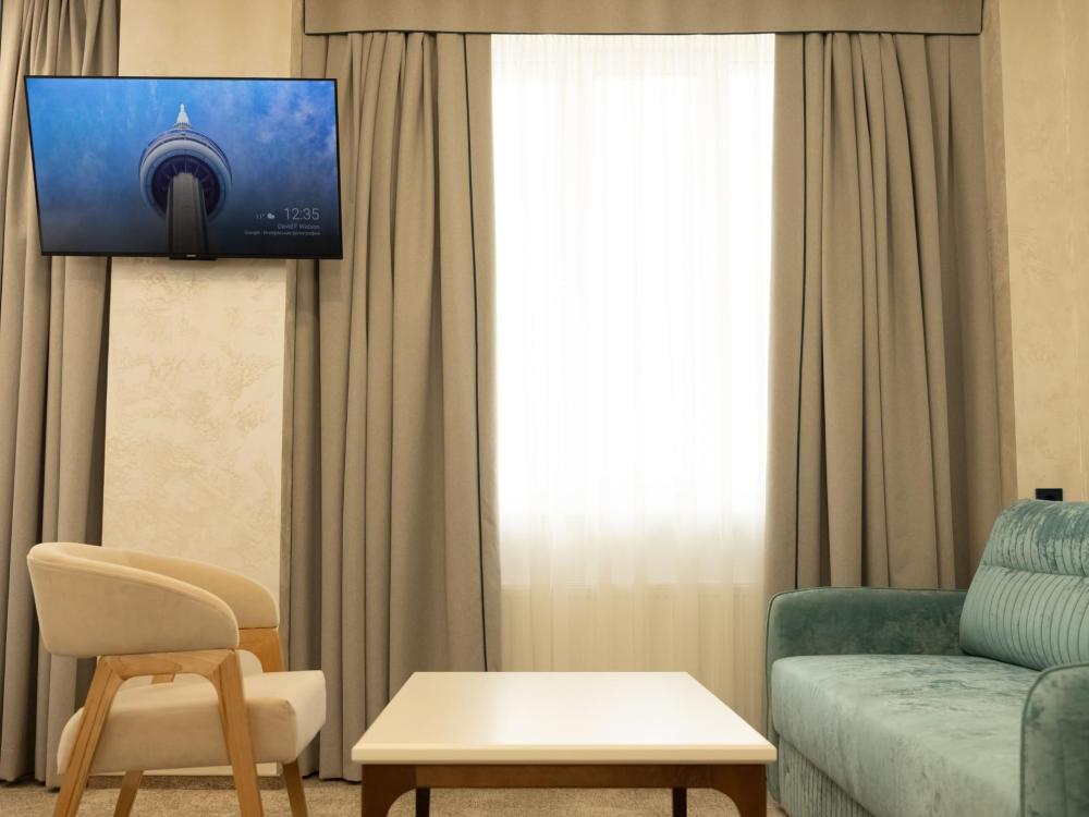 Семейный Люкс 53 м² идеально подойдет гостям, которые ценят комфорт и внимание к деталям. Интерьер номера выполнен в сдержанных тонах с яркими акцентами, создающими атмосферу уюта и изысканности. Номер состоит из просторной спальни, и элегантной гостиной с выделенной зоной отдыха с уютными креслами и журнальным столиком. Каждый номер оборудован просторной ванной комнатой с современной сантехникой, тропическим душем и полами с подогревом. Окна номеров данной категории выходят во двор, что обеспечивает спокойную атмосферу и уединение.