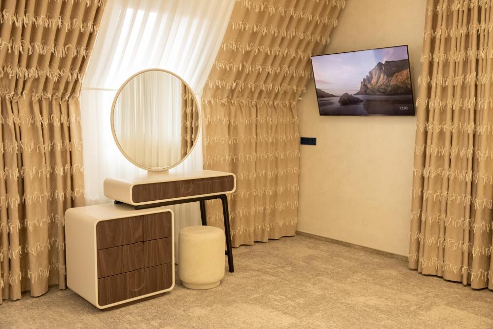 Представительский Люкс 82 м² идеален для людей, которые ценят роскошь и комфорт. Просторный двухкомнатный номер, оформленный в сдержанных тонах, состоит из уютной спальни, изысканной гостиной и просторной ванной комнаты с джакузи, а из окон открывается вид на гору Эльбрус. Главная особенность номера – собственное джакузи и зона отдыха с камином.