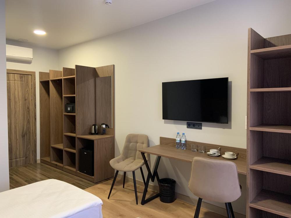 В номере: кухня с плитой и микроволновкой, чайник, кровать с ортопедическим матрасом, сейф, телефон, телевизор, холодильник, кондиционер, фен, гигиенические средства, полотенце, тапочки.