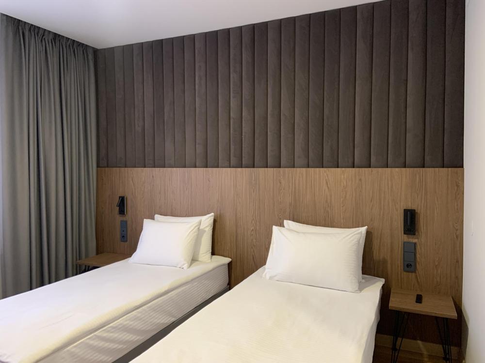 В номере: две односпальные кровати, сейф, телефон, телевизор, холодильник, кондиционер, фен, гигиенические средства, полотенце, тапочки.