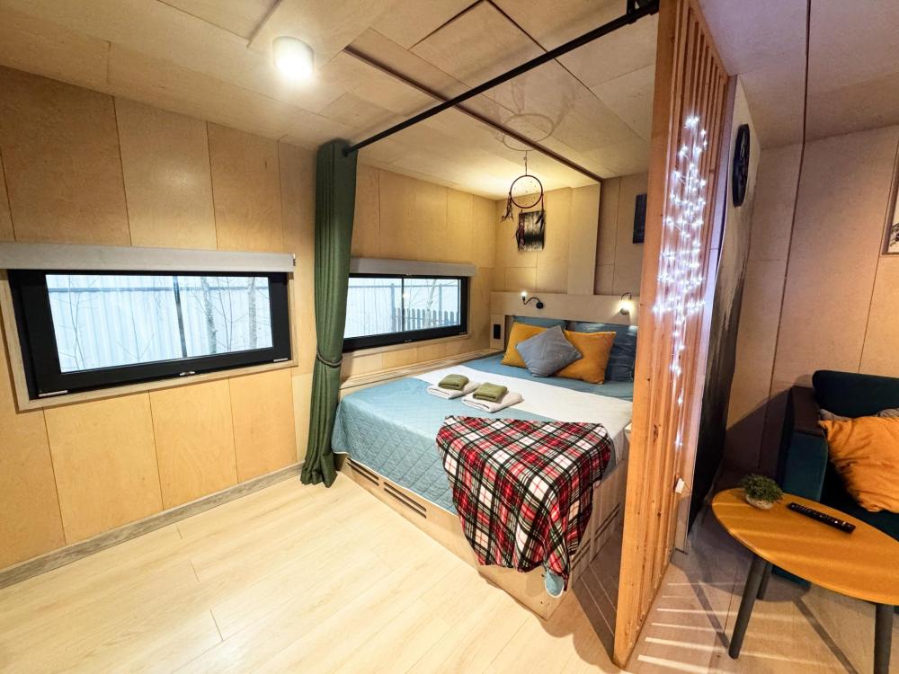 Smart-коттедж "O-frame Medium" - средний по размеру домик в линейке наших авторских проектов класса "Комфорт+". Удобное размещение до 4 человек. Панорамное остекление фасада. У каждого коттеджа веранда-терраса со столом и стульями. Спальная зона огорожена от гостиной перегородкой. В спальне располагается двухместная кровать. В гостиной находится раскладной диван-кровать на двоих человек, телевизор со SmartTV, Кухня оборудована керамической варочной панелью, микроволновой печью, холодильником, капельной кофеваркой, чайником, посудомоечной машиной и набором посуды на 4-х человек. В санузле расположены унитаз, душевая кабина и стиральная машина. На территории коттеджа есть зона барбекю со всем необходимым (решетка, шампуры, кочерга), баня-бочка, качели.