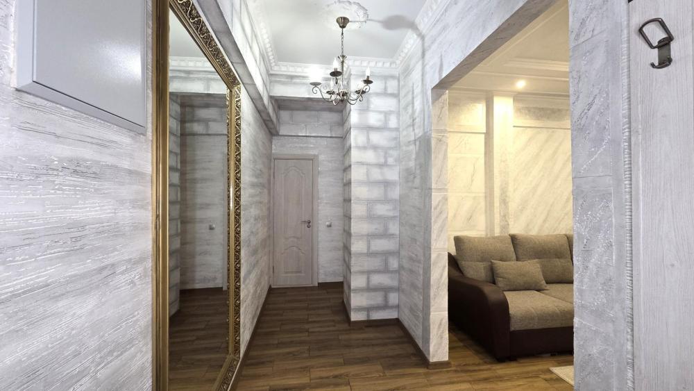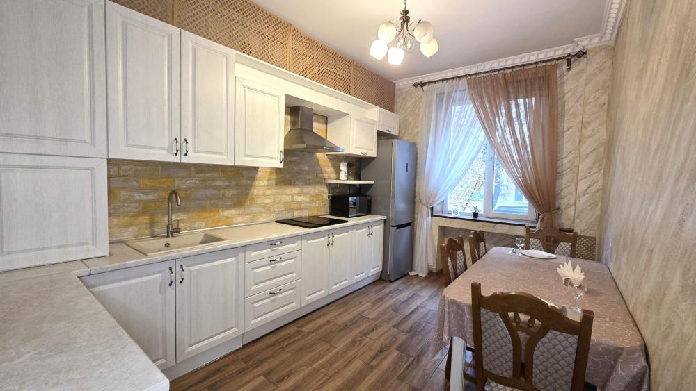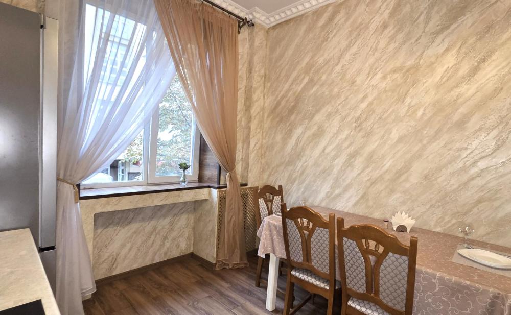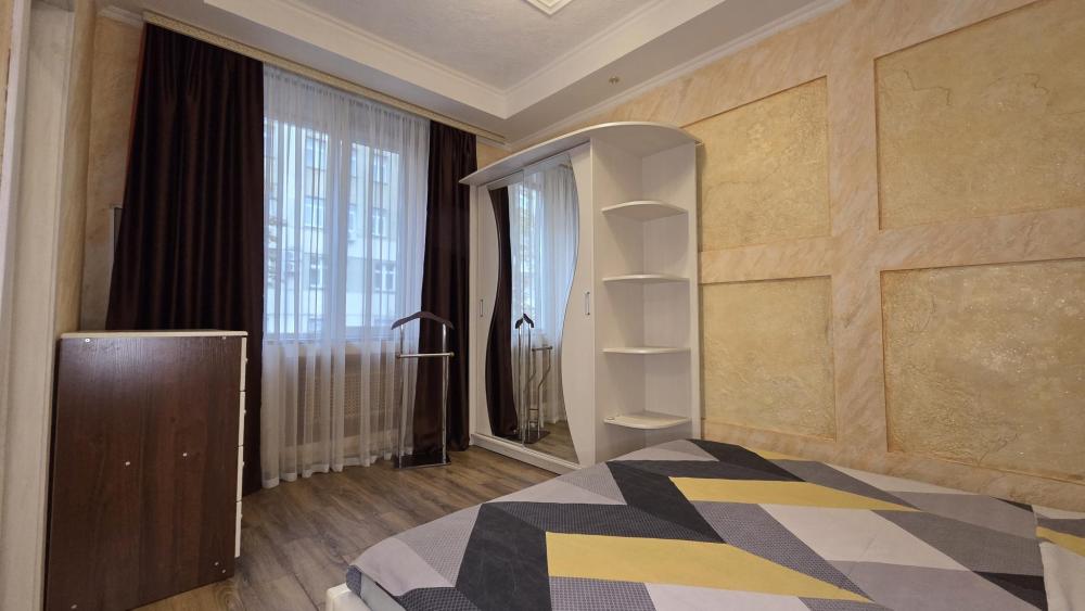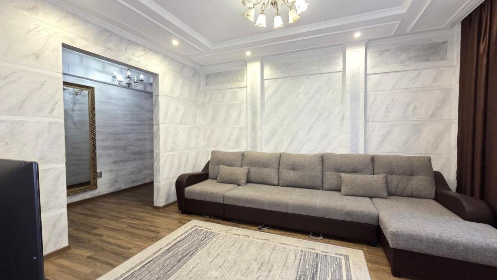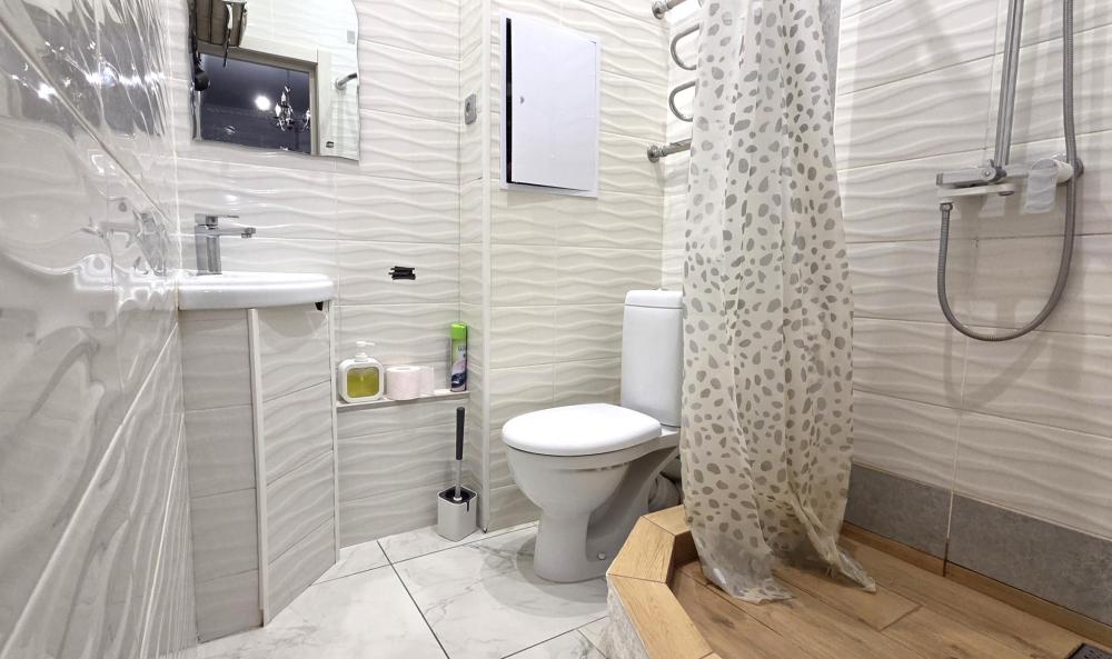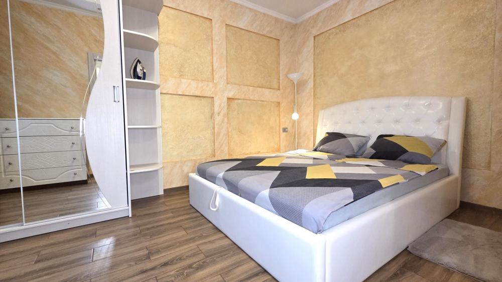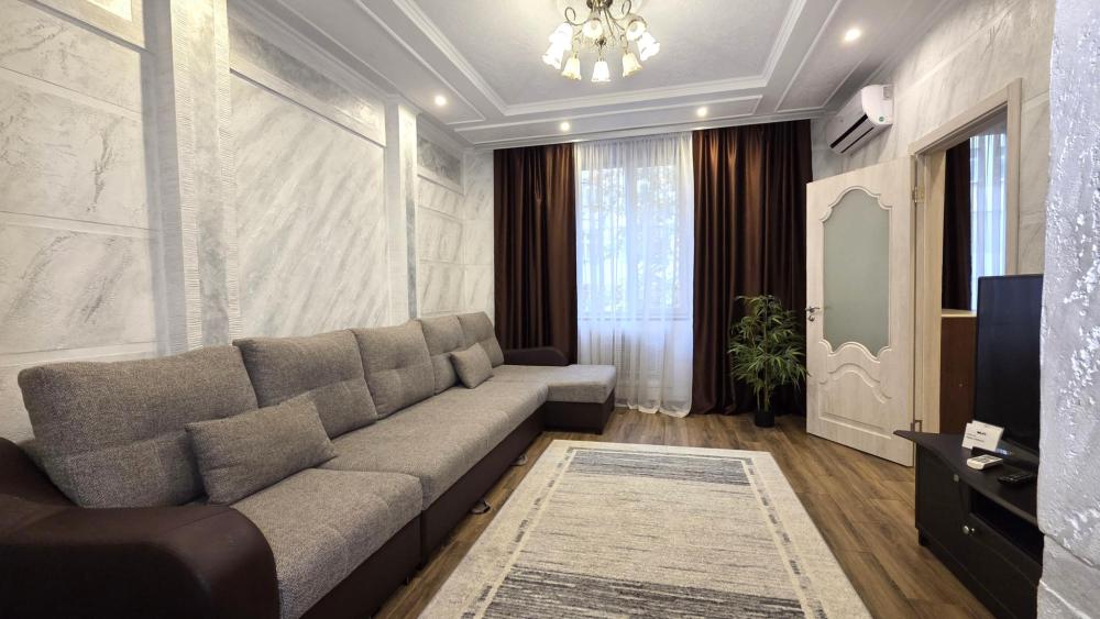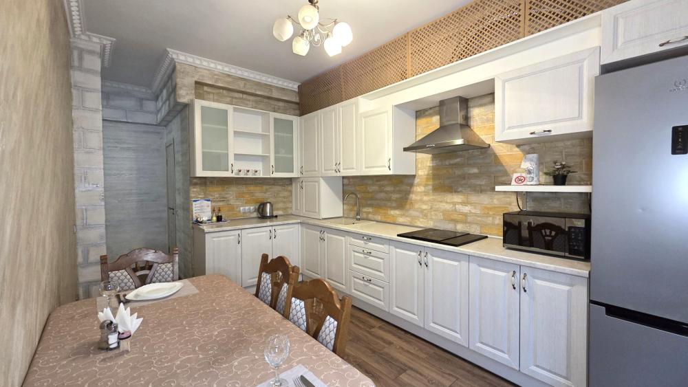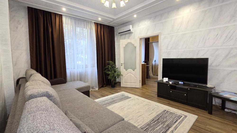 Апартаменты рассчитаны на комфортное проживание гостей, имеется вся необходимая мебель и бытовая техника для проживания. В изолированной спальне - удобная двуспальная кровать, а также вместительный комод для хранения личных вещей. В гостиной можно отдохнуть на большом, 2-спальном, при необходимости раскладывающемся диване с чашечкой кофе за журнальным столиком, просматривая любимые передачи по TV с плоским экраном. В ванной комнате можно воспользоваться душевой кабиной, а также ванно-косметическими принадлежностями, свежими полотенцами и феном. Стиральная машина находится на кухне. В просторной кухне обеденный стол и стулья, кухонная мебель с рабочей зоной для приготовления домашних блюд: бытовая техника, кухонные принадлежности, посуда. Для поддержания комфортного микроклимата в апартаментах функционирует кондиционер.