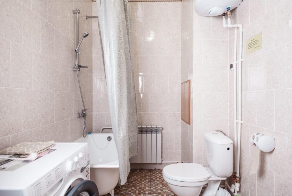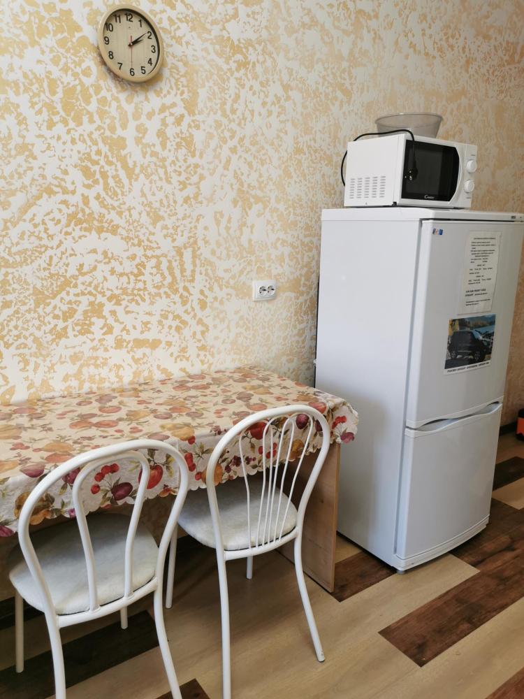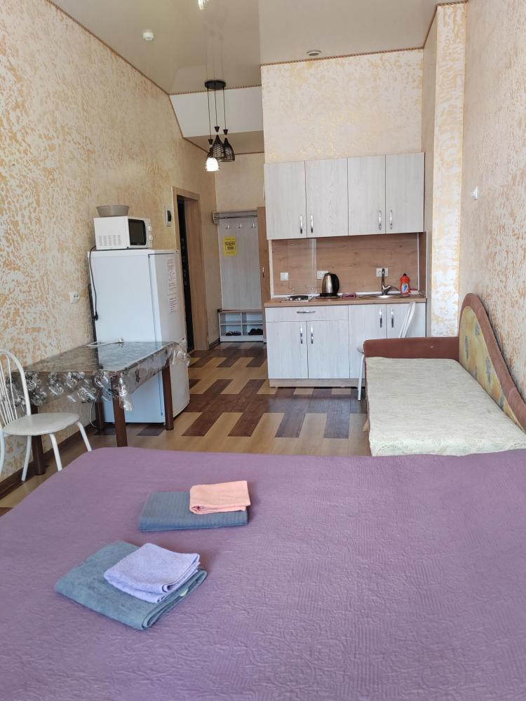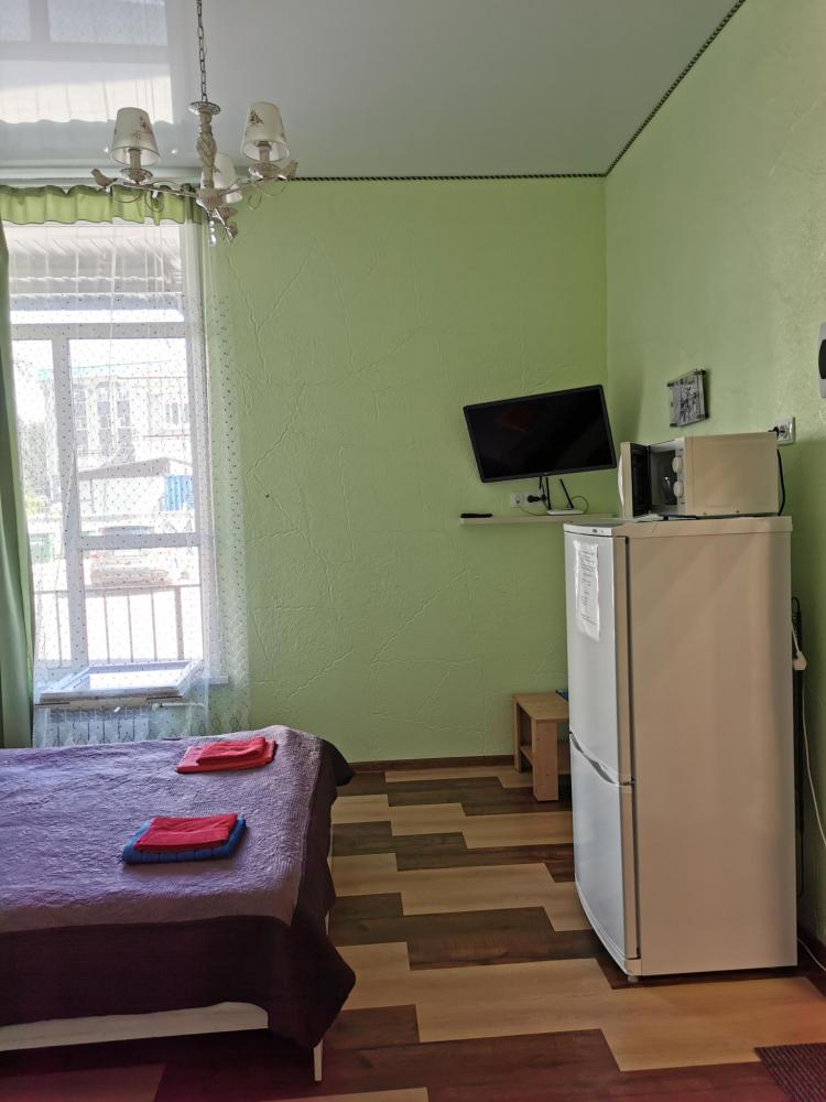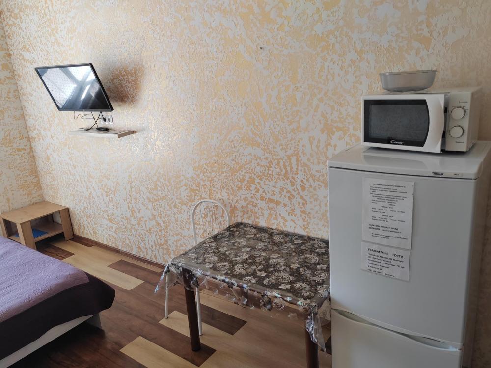 Двуспальная кровать, прикроватная тумба, телевизор. Оборудованная зона кухни с техникой: холодильник, плита, микроволновая печь, чайник. Ванная комната, стиральная машина, гигиенические принадлежности. Полотенца, постельное белье.