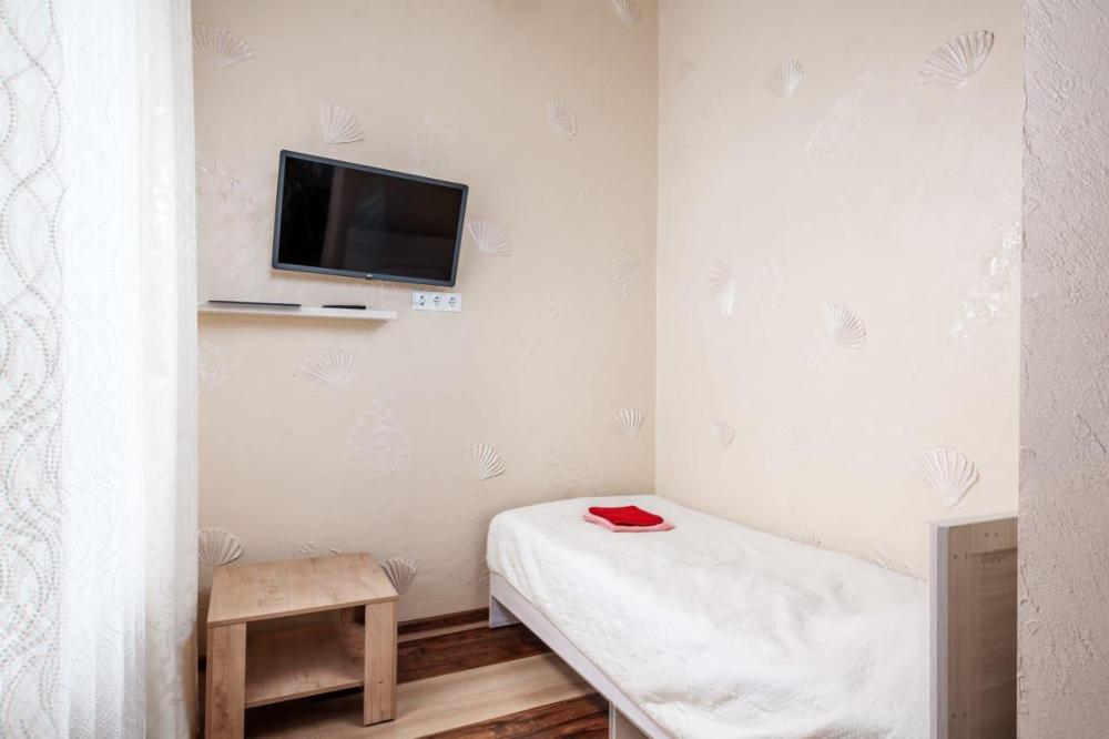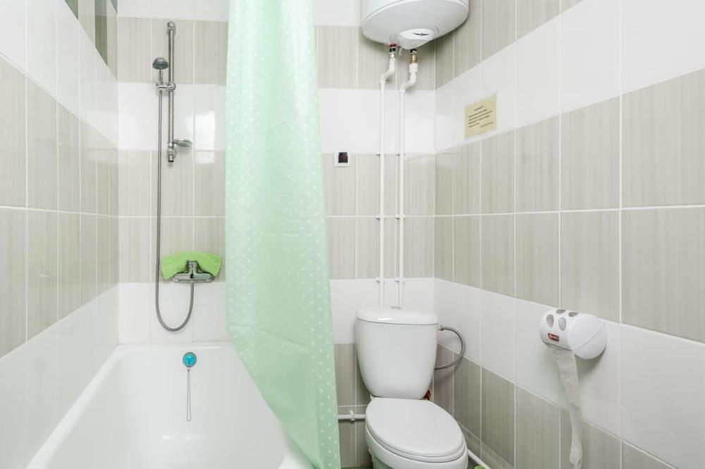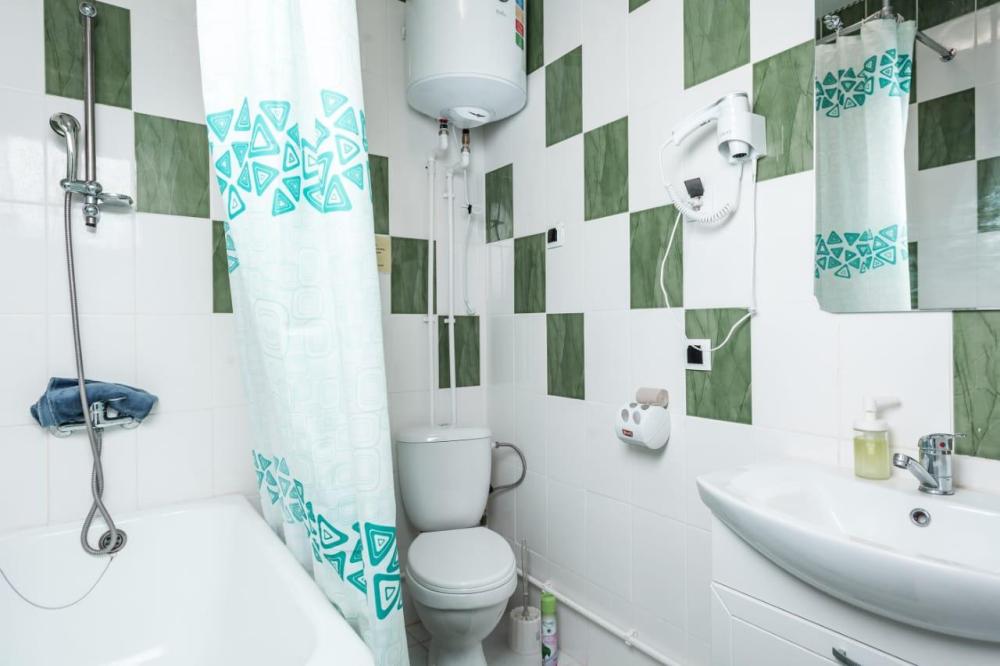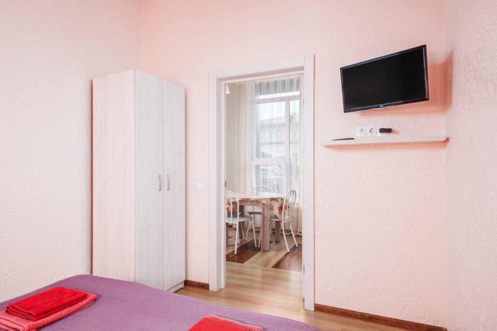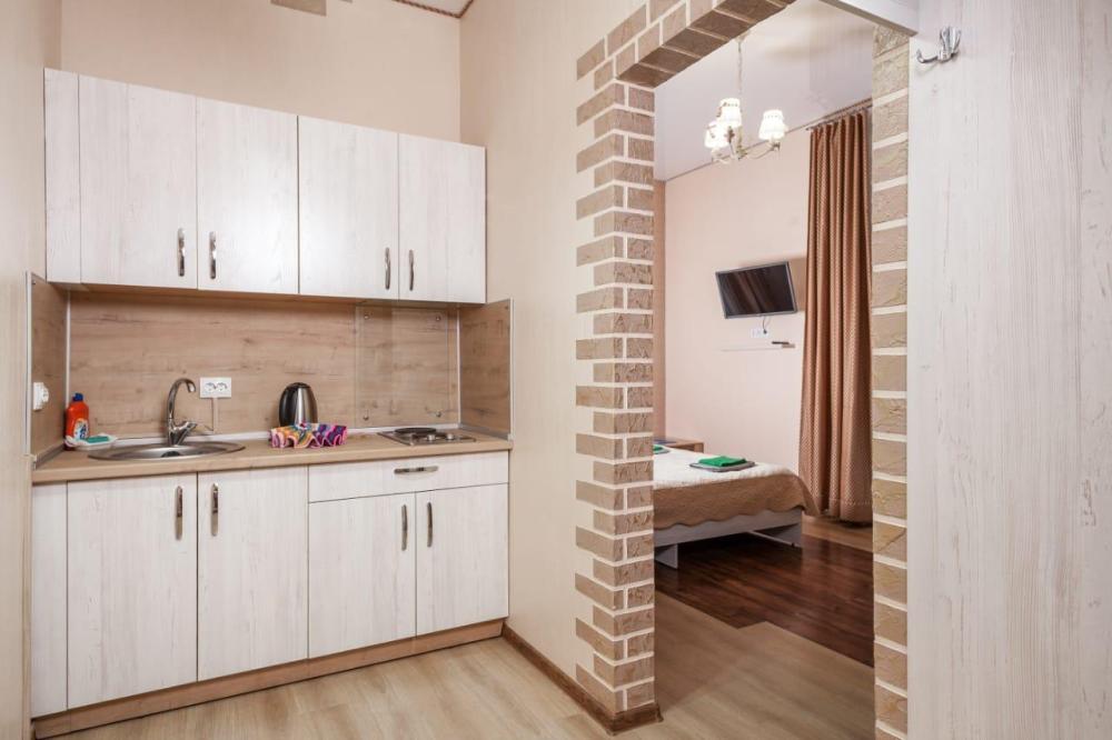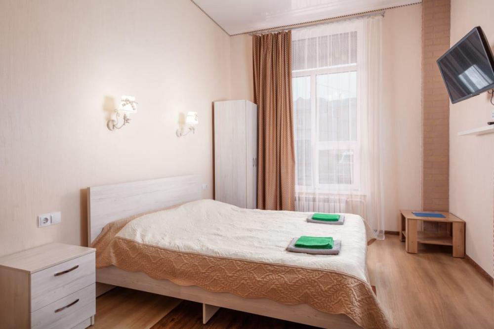 Двуспальная кровать, прикроватная тумба, телевизор. Оборудованная зона кухни с техникой: холодильник, плита, микроволновая печь, чайник. Ванная комната, стиральная машина, гигиенические принадлежности. Полотенца, постельное белье.