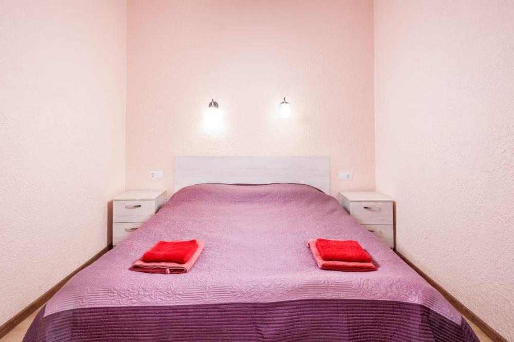 Двуспальная и односпальная кровати, прикроватная тумба, телевизор. Оборудованная зона кухни с техникой: холодильник, плита, микроволновая печь, чайник. Ванная комната, стиральная машина, гигиенические принадлежности. Полотенца, постельное белье.