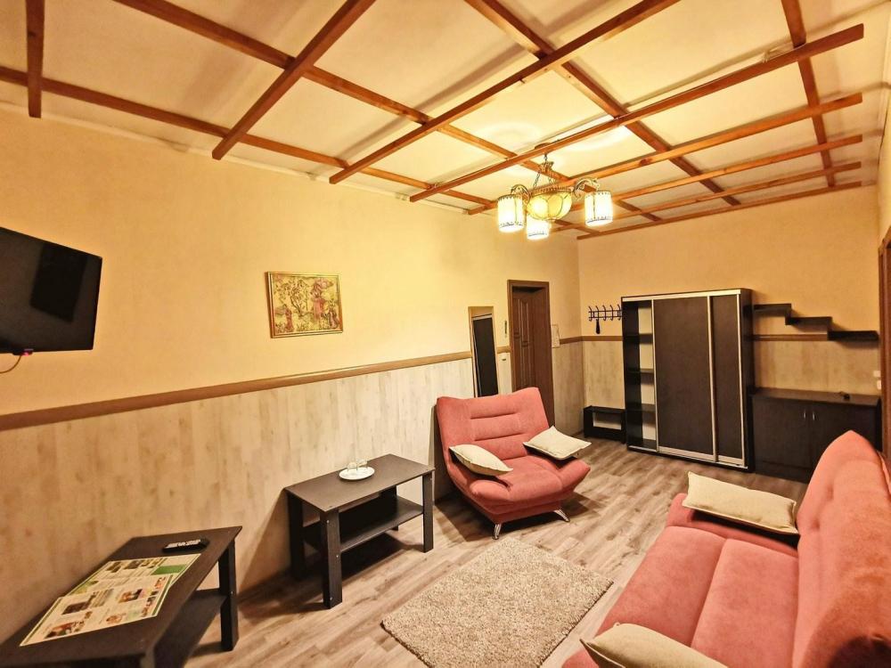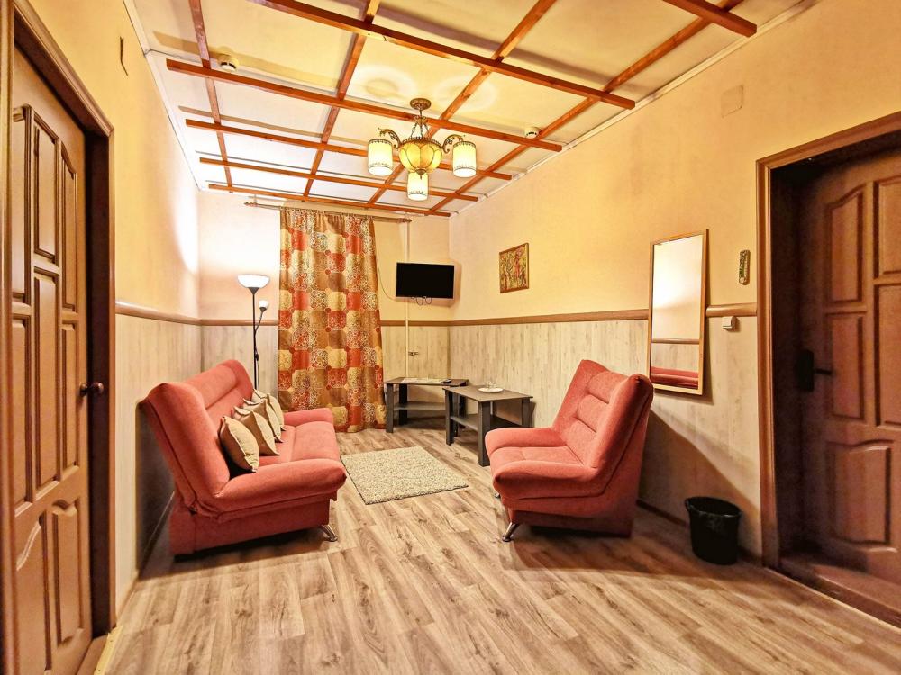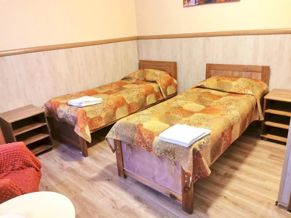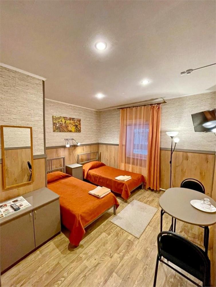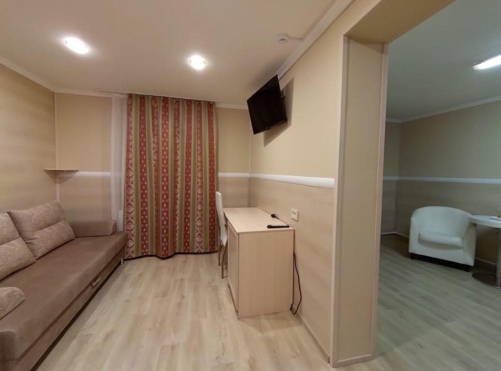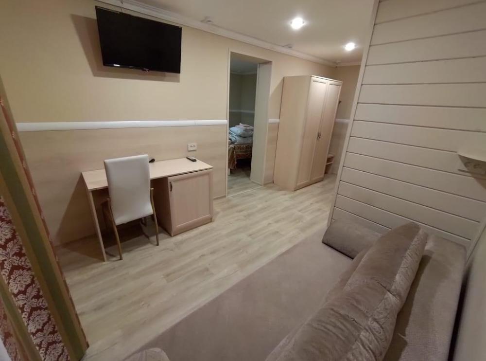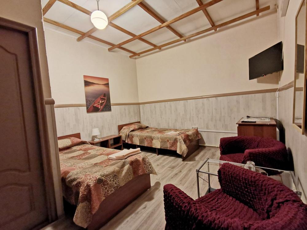 Номер комфорт. В номере имеются две односпальные кровати, диван, шкаф, стол, зеркало, телевизор, холодильник, фен, собственный санузел.