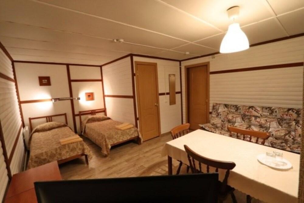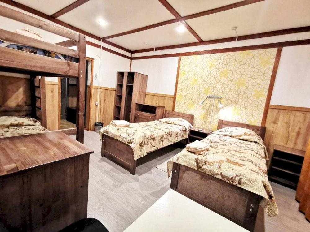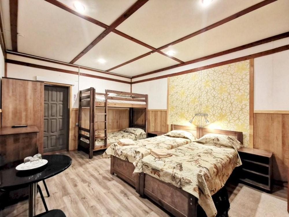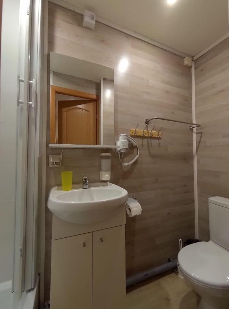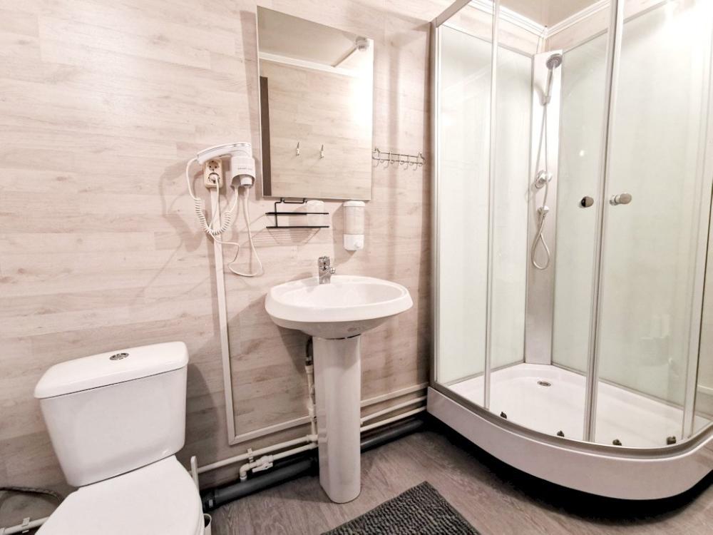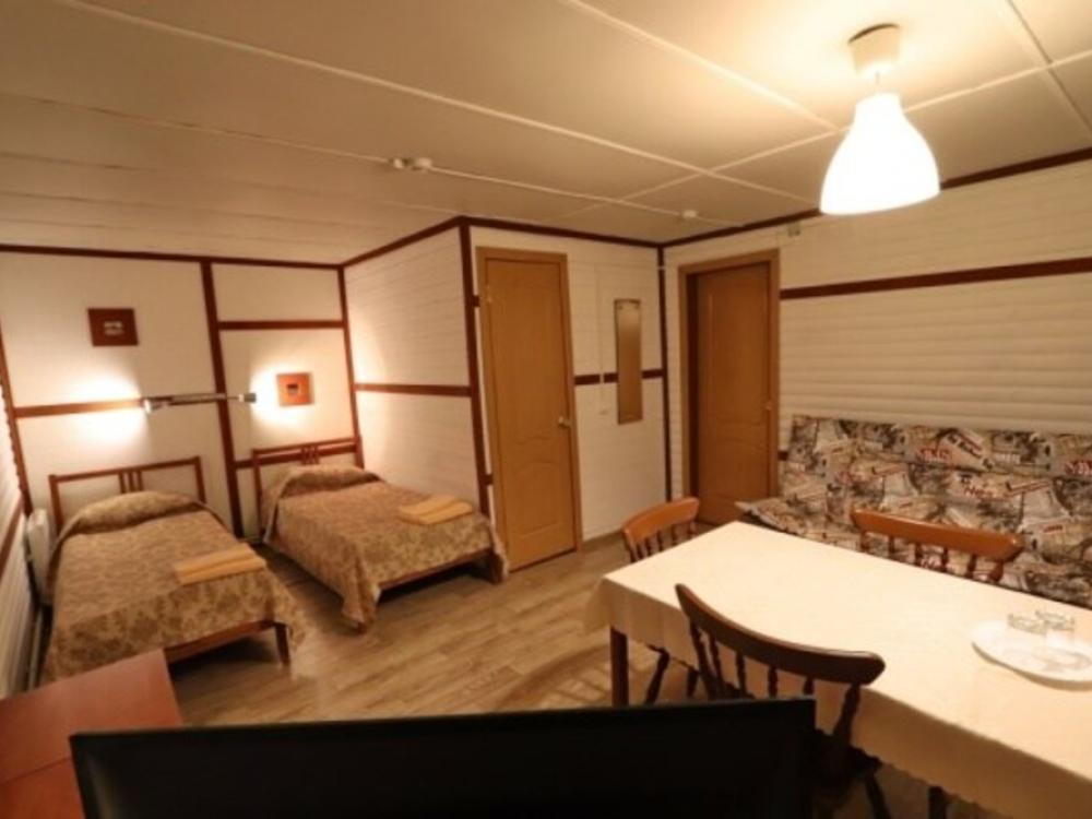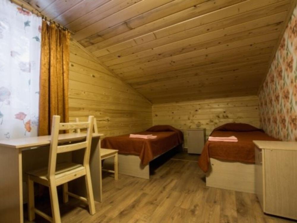 Номер стандарт улучшенный. В номере имеется двуспальная или две односпальные кровати, двухъярусная кровать, шкаф, стол, зеркало, фен, собственный санузел.