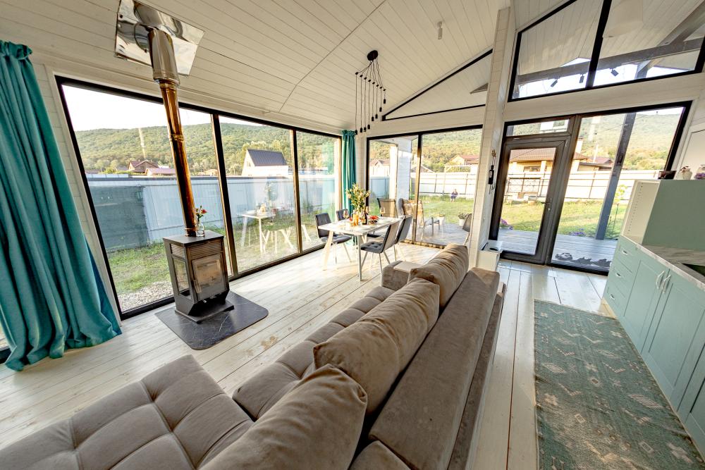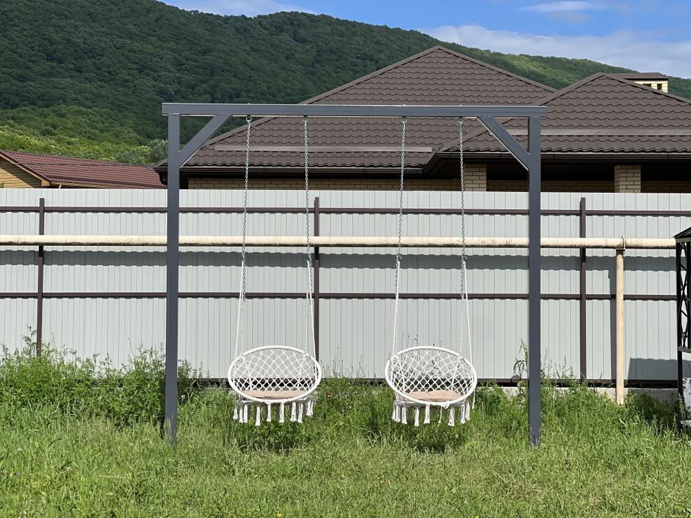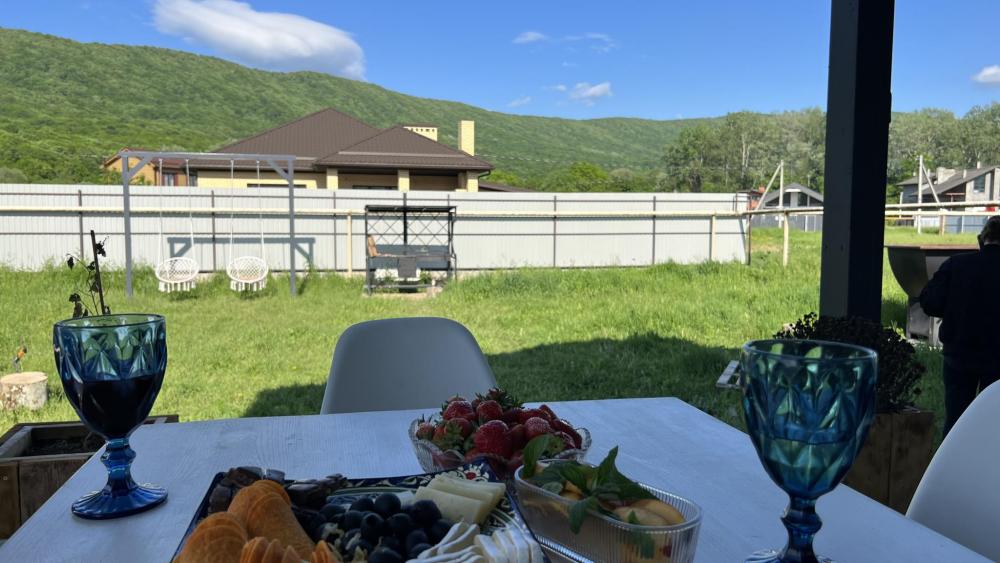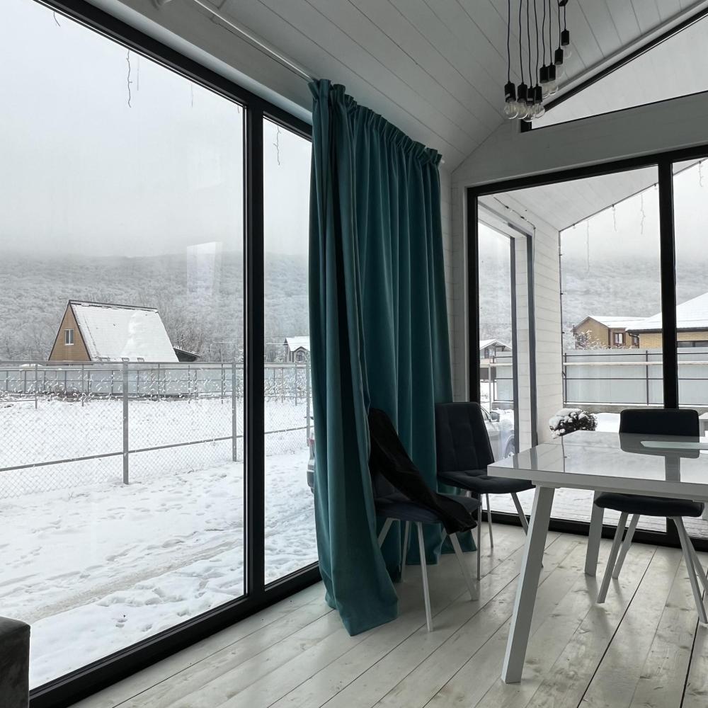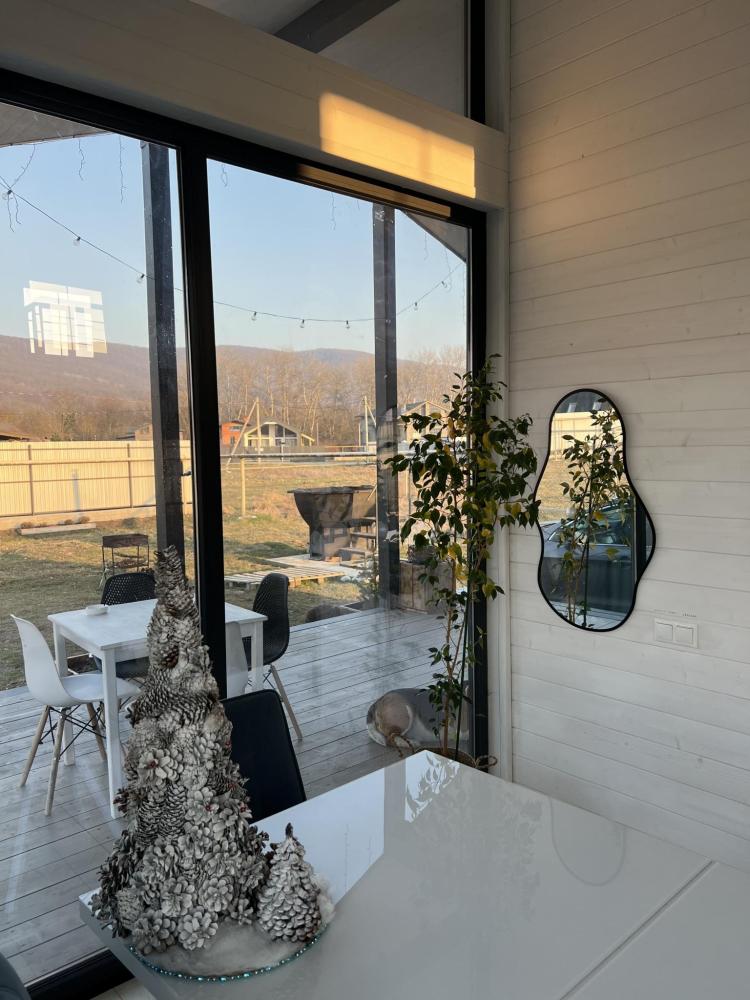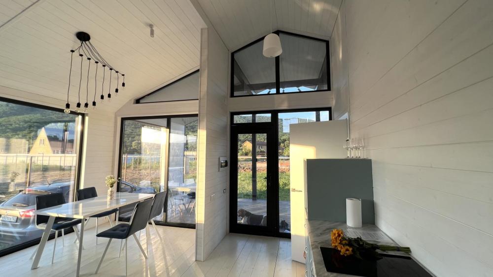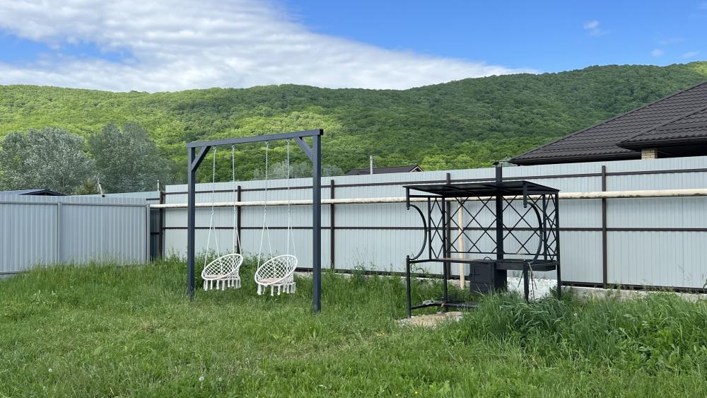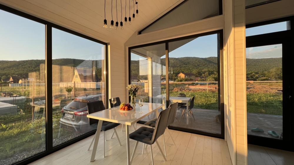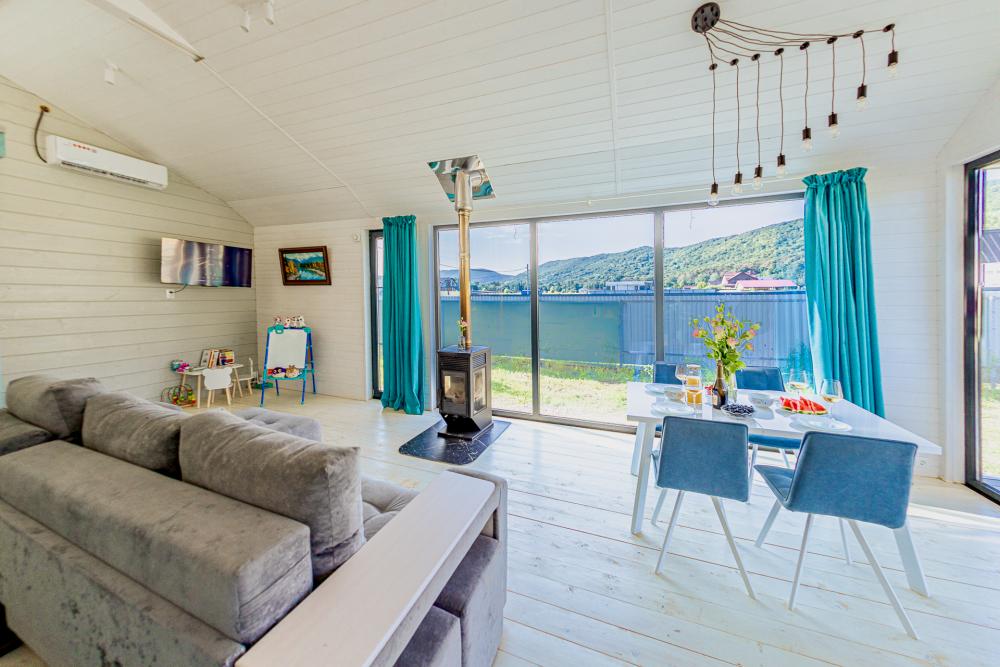Прекрасный новый дом общей площадью 80 кв.м. для размещения до 7-ми гостей. Дом полон света, с чудесным панорамным остеклением на фантастически красивые горы. В доме две спальни с двухспальными кроватями, большой панорамный 45 м2 зал с камином и удобным диваном, стильная кухня с индукционной плитой, холодильником, и всей необходимой посудой, белоснежное белье, полотенца, множество сценариев освещения, быстрый Wi-fi, в ванной комнате душевая кабина, свежие полотенца, гигиенические средства, фен, стиральная машинка, сушилка для белья. Рядом с домом большая терраса со столиком и стульями, мангальная зона (жаровня, печь для казана), качели, чан на 6 человек, батут. Озеро с птицами и детская площадка в коттеджном поселке.