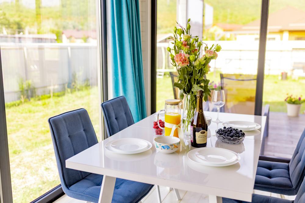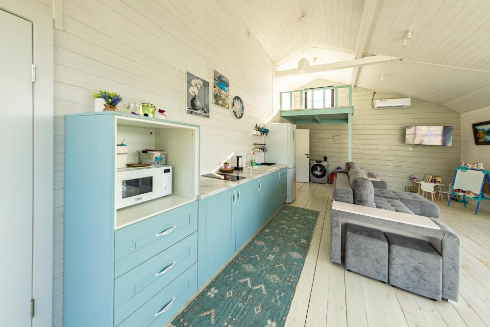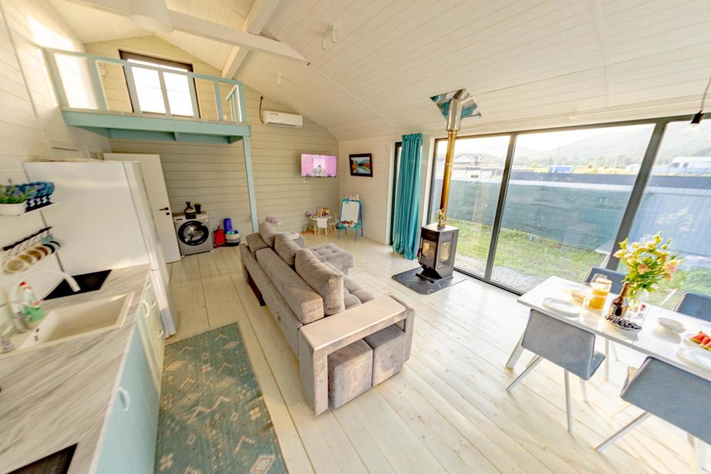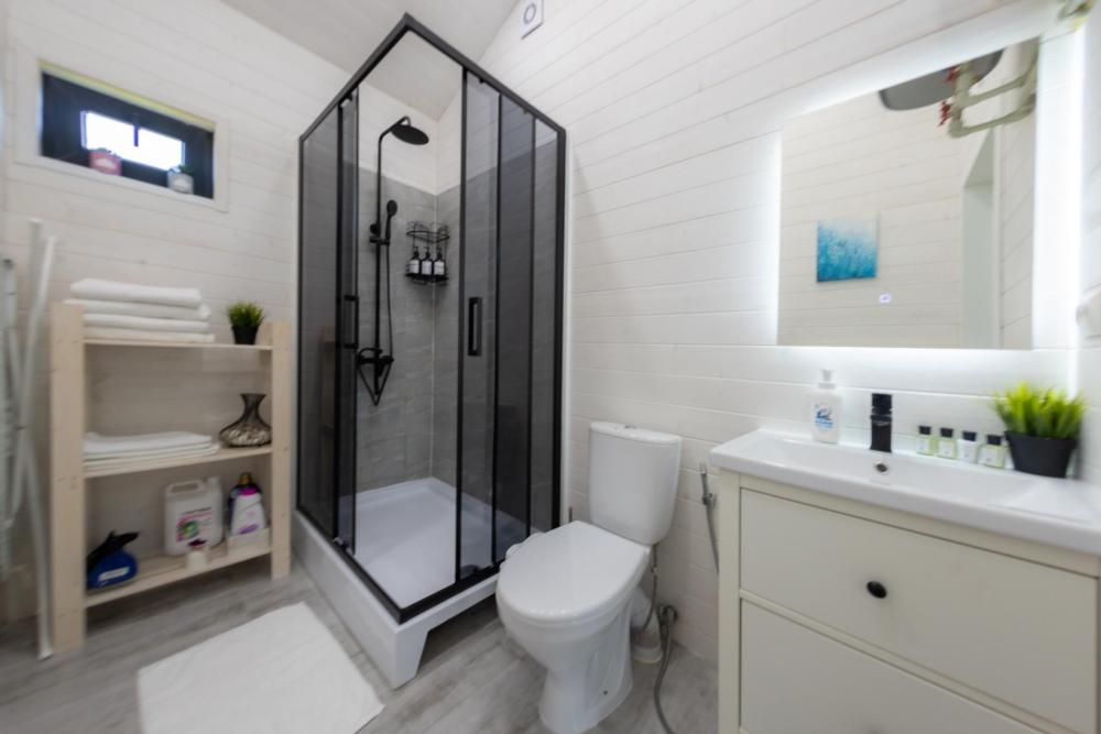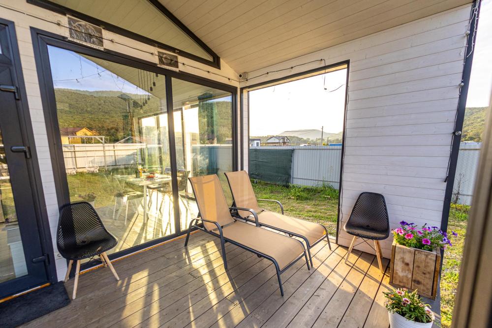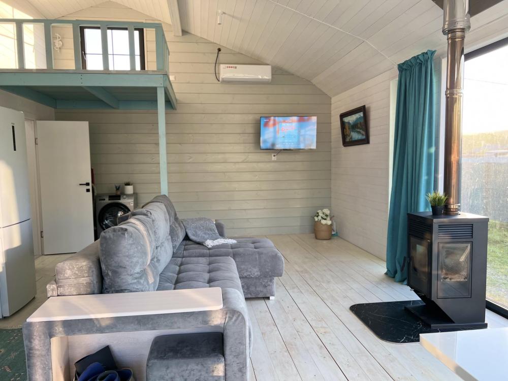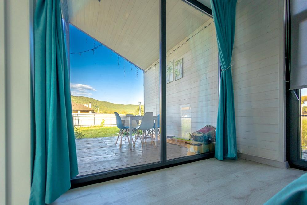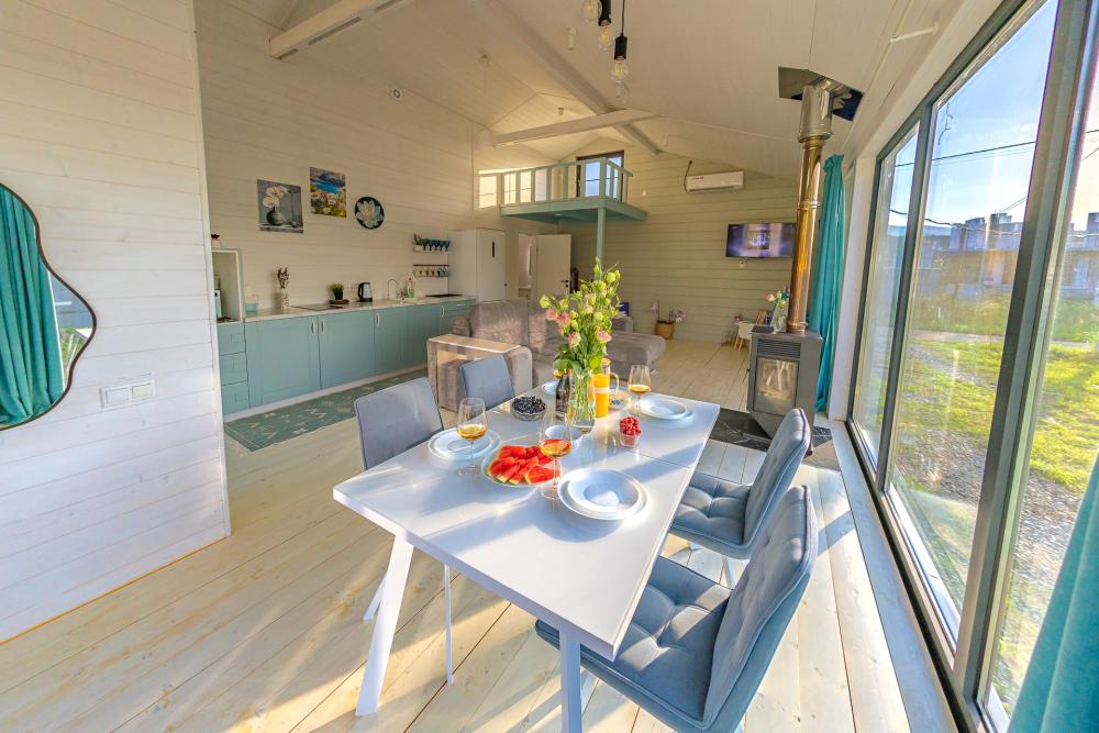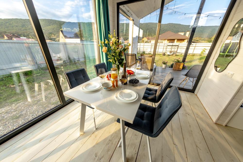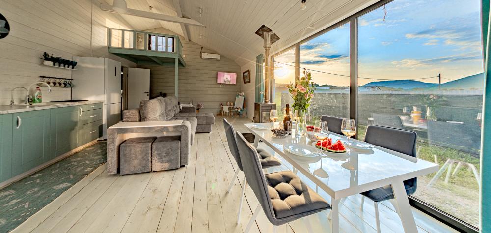 Прекрасный новый дом общей площадью 80 кв.м. для размещения до 7-ми гостей. Дом полон света, с чудесным панорамным остеклением на фантастически красивые горы. В доме две спальни с двухспальными кроватями, большой панорамный 45 м2 зал с камином и удобным диваном, стильная кухня с индукционной плитой, холодильником, и всей необходимой посудой, белоснежное белье, полотенца, множество сценариев освещения, быстрый Wi-fi, в ванной комнате душевая кабина, свежие полотенца, гигиенические средства, фен, стиральная машинка, сушилка для белья. Рядом с домом большая терраса со столиком и стульями, мангальная зона (жаровня, печь для казана), качели, чан на 6 человек, батут. Озеро с птицами и детская площадка в коттеджном поселке.
