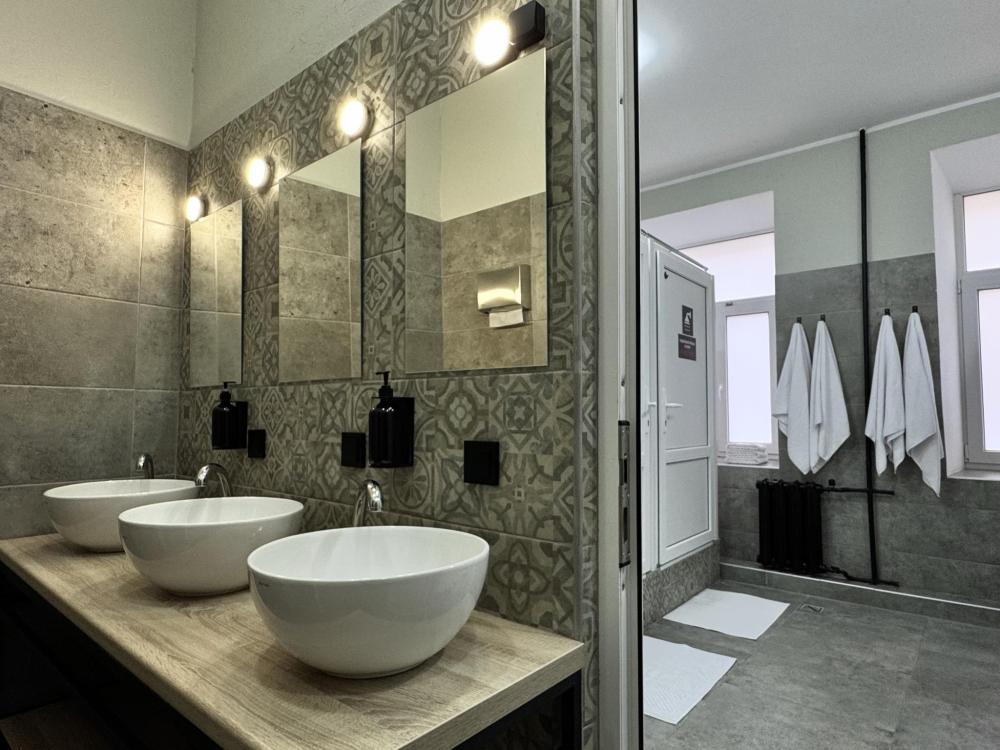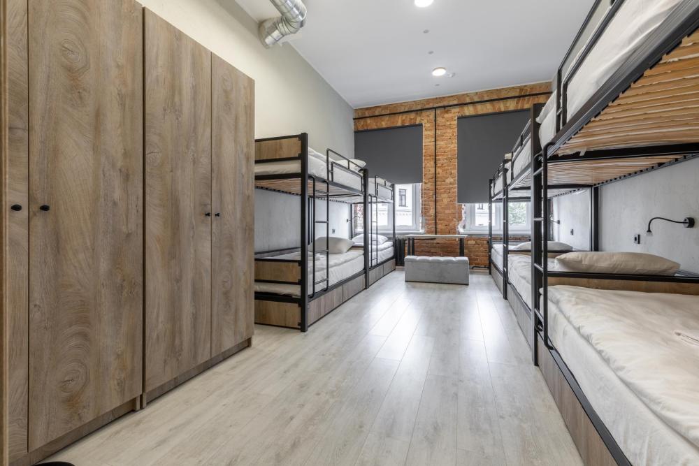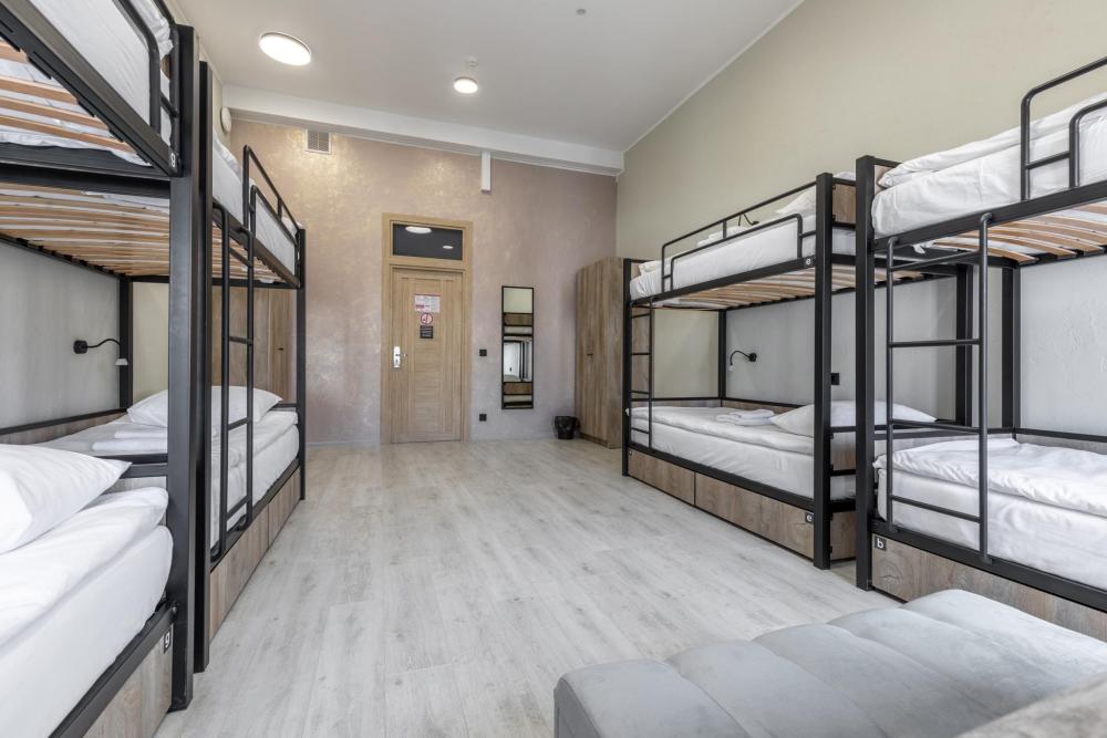 Просторные общие номера в стиле лофт — на 8 мест, с удобными двухъярусными кроватями. Комнаты оснащены новой мебелью, отдельными душевыми и всеми удобствами.