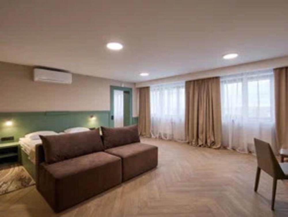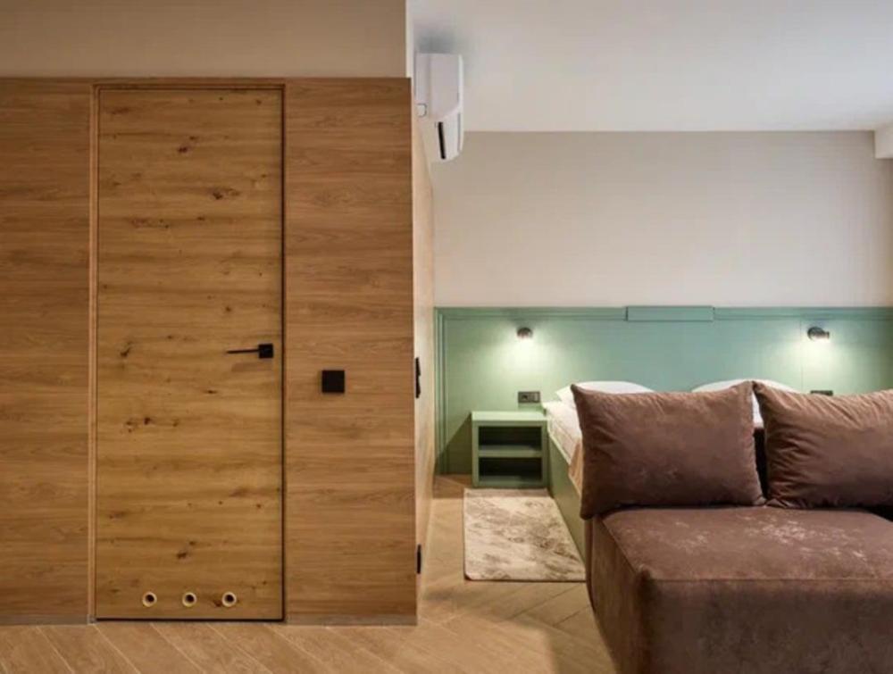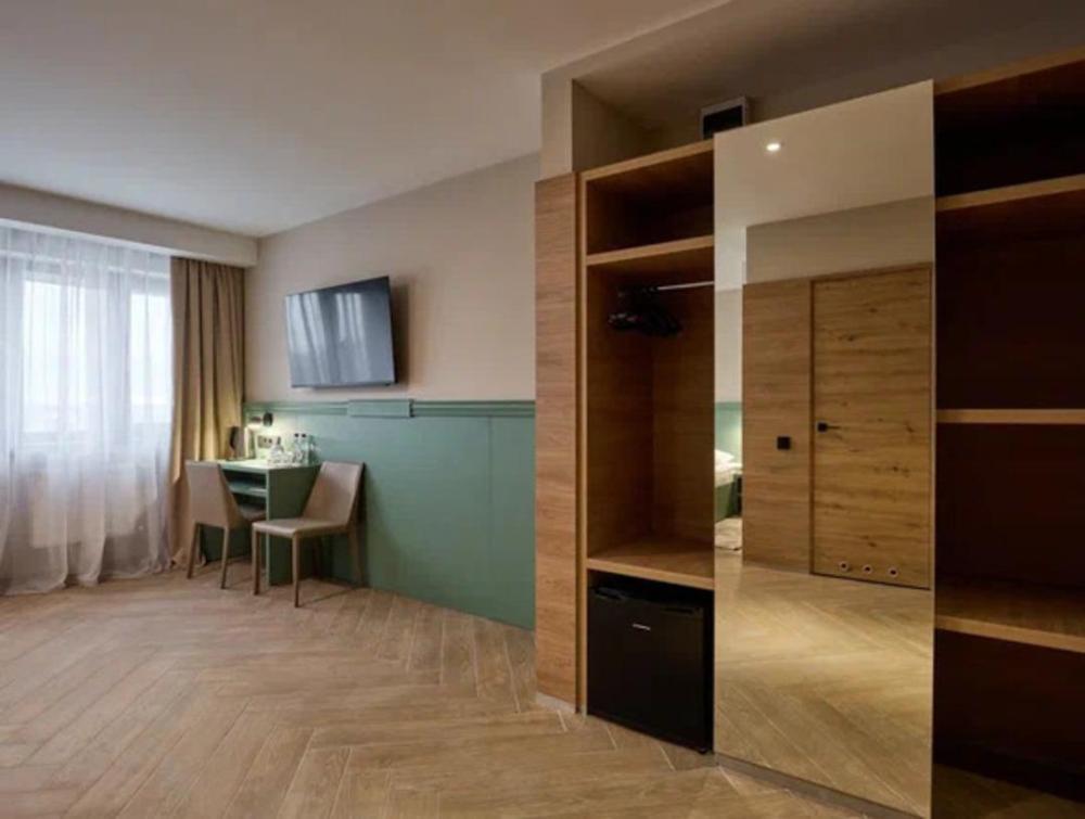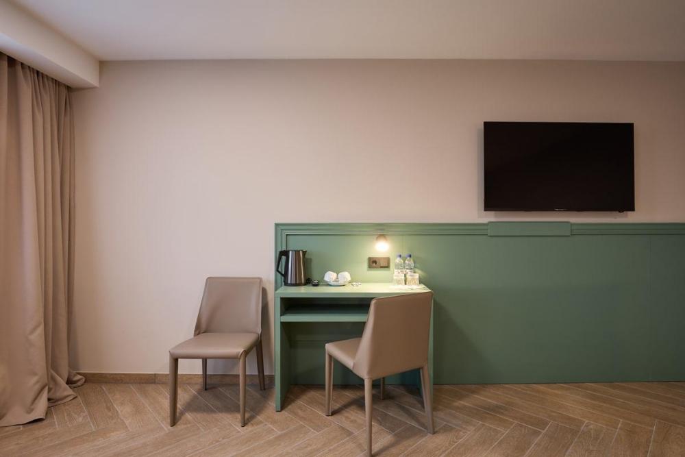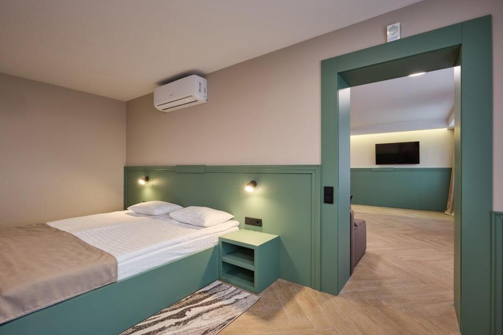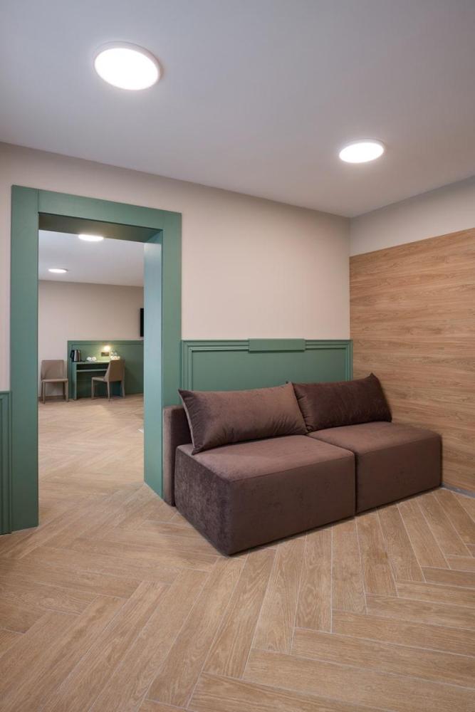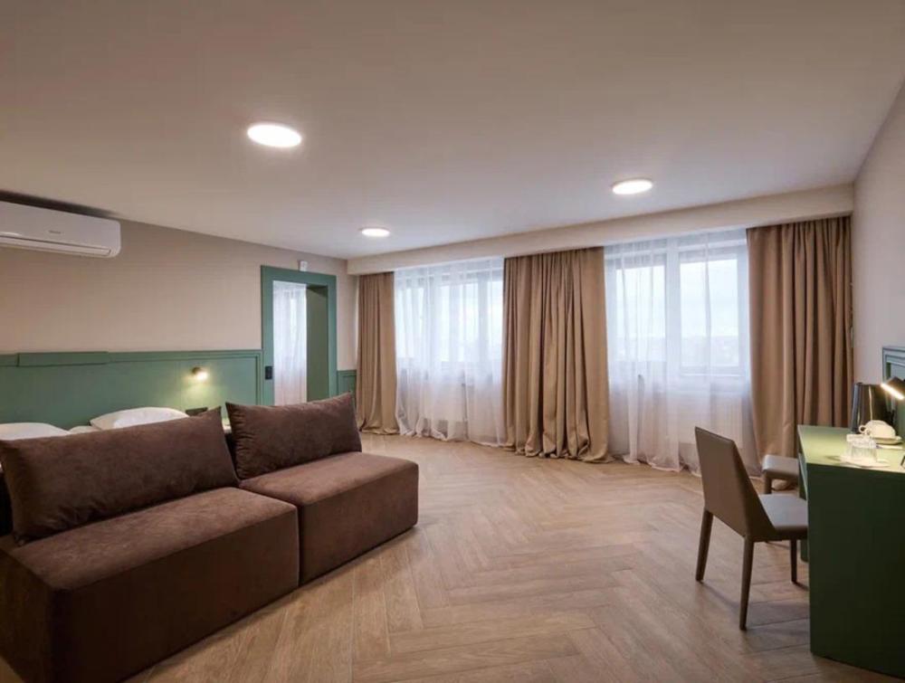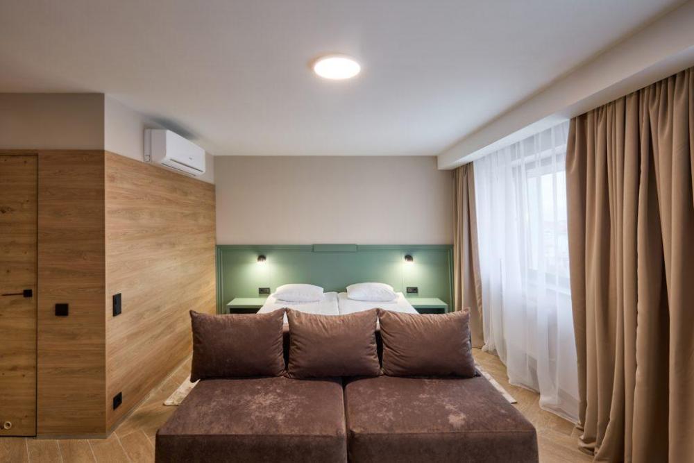 Просторный трёхместный номер площадью 42,50 м² дарит максимум возможностей для отдыха с близкими. Двуспальная кровать с ортопедическим матрасом 180*200 см и диван размером 150*200 см делают номер многофункциональным. В нем с лёгкостью могут расположиться трое взрослых и ребёнок до 7 лет. Для комфортного проживания в номере есть всё необходимое: Wi-Fi, телевизор, кондиционер, холодильник с мини-баром, чайная зона. Санузел оснащен душем. Бесплатно предоставляются полотенца, фен, качественные косметические средства в течение всего времени пребывания.