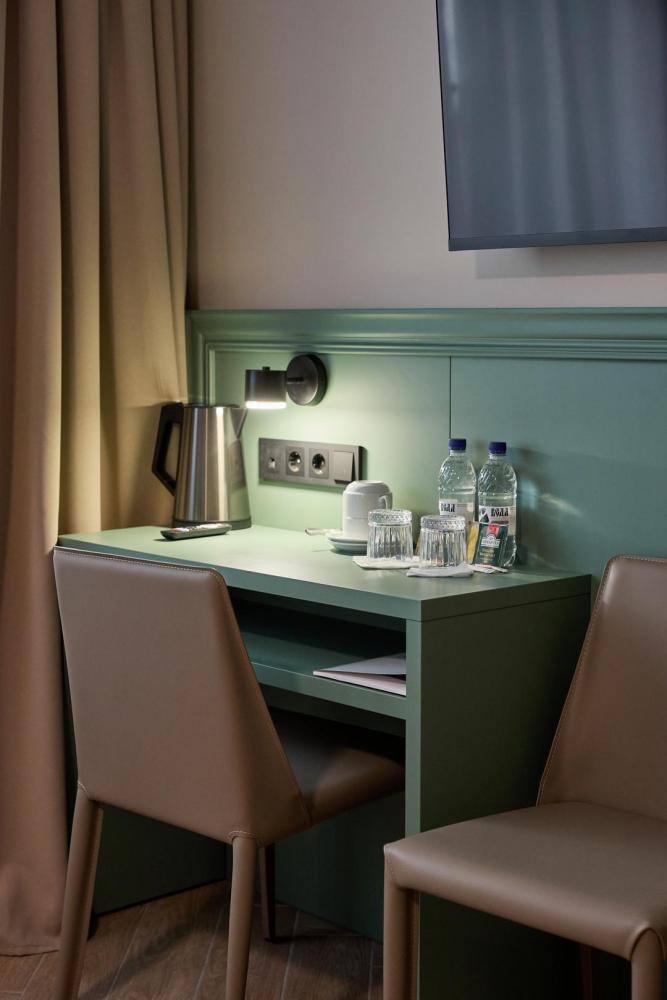 Уютный номер площадью 15.9 кв.м. Обстановка располагает к комфортному отдыху двоих гостей. В номере: кровать с ортопедическим матрасом 160*200, Wi-Fi, телевизор, холодильник с мини-баром, чайная зона. Санузел оснащен душем. Бесплатно предоставляются полотенца, фен, качественные косметические средства в течение всего времени пребывания.