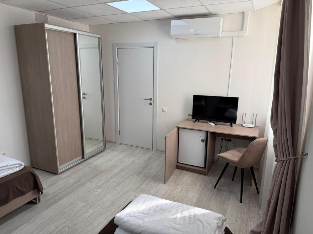 Двухместный номер стандарт площадью 20м2 с видом во двор. В номере есть все необходимое для комфортного проживания: 2 односпальные кровати, телевизор, кондиционер, шкаф, вешалка, зеркало, рабочий стол, чайник, холодильник, стулья, санузел: душ, раковина, туалет.