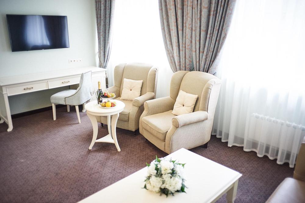 2-местный номер стандарт улучшенный Площадь 32 кв. м, на 1 или 2 этаже, пол – ковролин, система кондиционирования со стационарным пультом; окна с видом на озеро — без балкона или окна с видом во двор — с балконом. Одна большая кровать (160см) или две односпальные кровати(100см) с возможностью совмещения), декоративные подушки на кровати, прикроватные тумбы, прикроватные светильники или бра настенные. Шкаф платяной, багажница, письменный стол с мини-баром, стул, сейф, ТВ с пультом, торшер, настенное зеркало в деревянной раме, одно или два кресла с декоративными подушками, журнальный столик. В шкафу: тапочки, щетка д/одежды, рожок д/обуви, швейный набор, пакет для прачечной с квитанцией на услуги прачечной, плечики. Чайная станция (чайник, чашки блюдца, чай, сахар) Ванная комната: Ванна или душевая кабина, биде или гигиенический душ, унитаз, умывальник, зеркало с подсветкой, косметическое настенное зеркало, фен, полотенцесушитель; набор туалетных принадлежностей (шампунь, гель, мыло, косметический, бритвенный и зубной наборы, жидкое мыло в дозаторе), комплект полотенец: банные, средние, коврики для ног.
