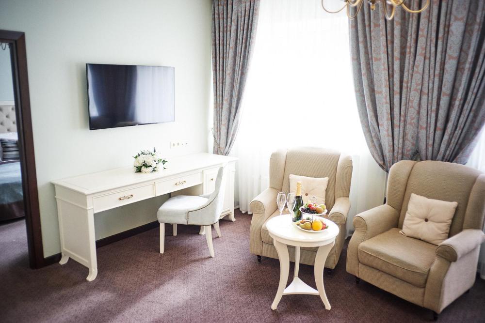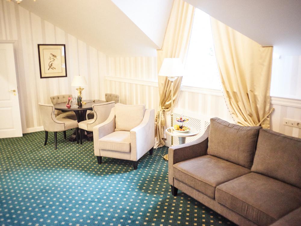 2-х комнатный номер (122м) на мансардном этаже (ковролин): система кондиционирования со стационарным пультом в каждой комнате; окна с видом на озеро. Прихожая с вешалкой и ящиками тапочки, щетка д/одежды, рожок д/обуви, швейный набор, пакет для прачечной с квитанцией на услуги прачечной. Гостевой санузел — унитаз, гигиенический душ, раковина, зеркало с подсветкой, полотенцесушитель. Гостиная с кухней, кофе-машиной, чайником и посудой на 4 персоны, встроенный мини-холодильник, питьевая вода, чай в ассортименте, кофе для капсульной машины, стол круглый обеденный с 4 стульями, диваном (раскладывается) и 2 креслами, стол письменный, стол для настольных игр, ТВ, камин. Спальня с большой кроватью (200см), прикроватные тумбы, светильники, туалетный стол с зеркалом, кресло, 2 полукресла, комод, ТВ, гардеробная с ящиками, платяными шкафами, сейф. Ванная комната :душевая кабина, ванна, раковина с тумбой, унитаз, биде, полотенцесушитель, сауна, набор туалетных принадлежностей (шампунь, гель, мыло, косметический набор, бритвенный набор, зубной набор, жидкое мыло в дозаторе), фен комплект полотенец: банные, средние, коврики для ног, халаты.
