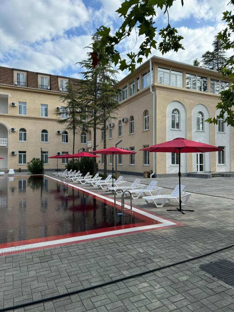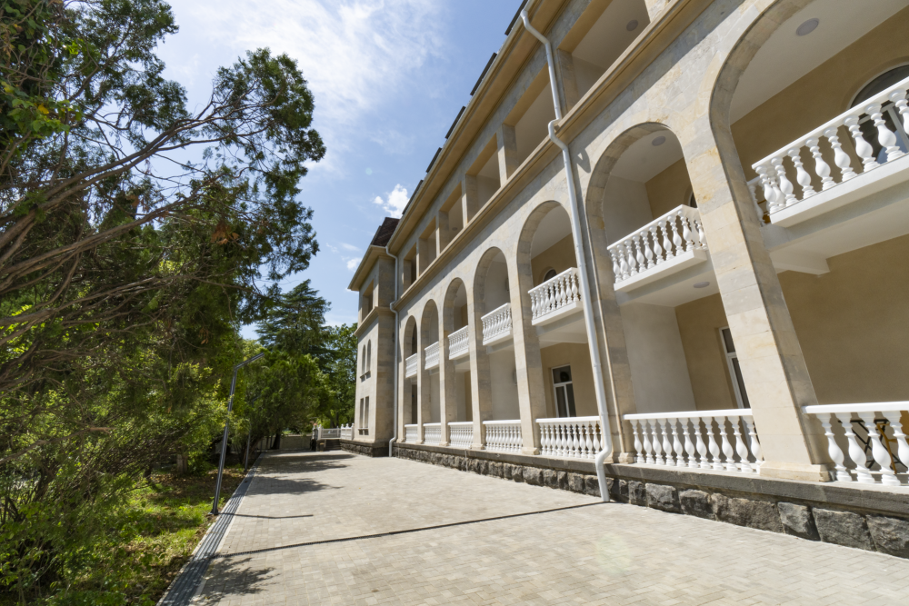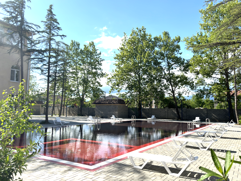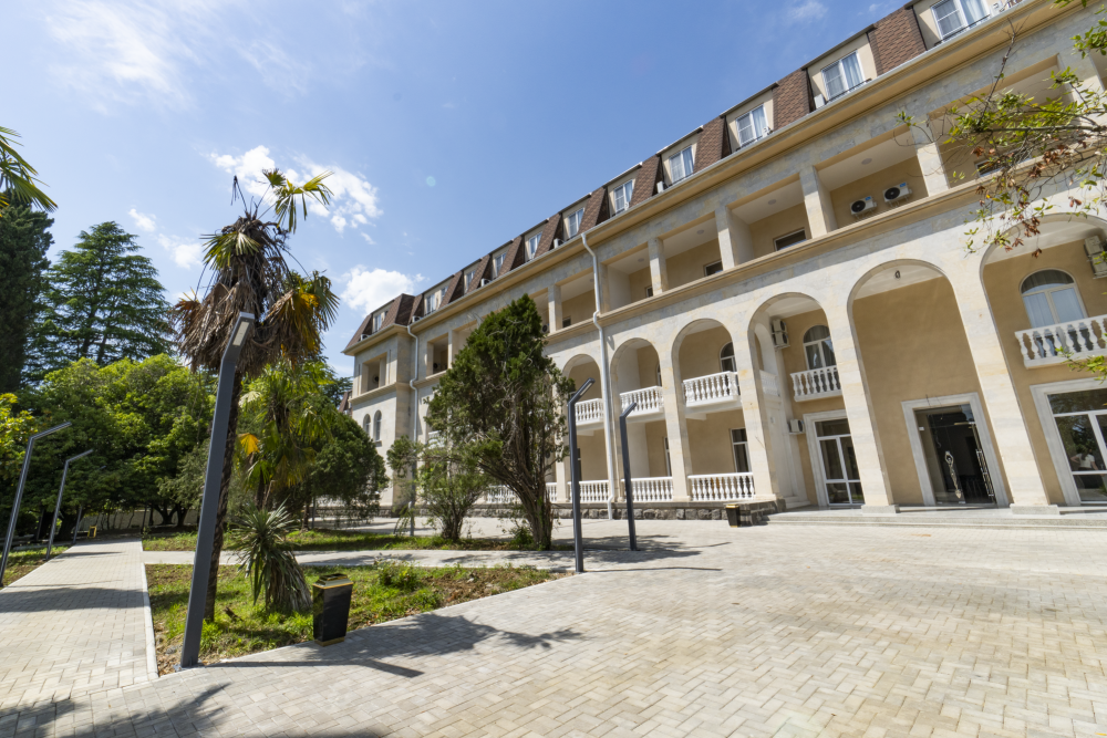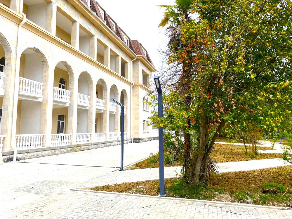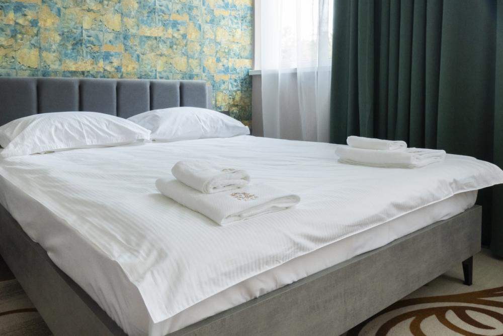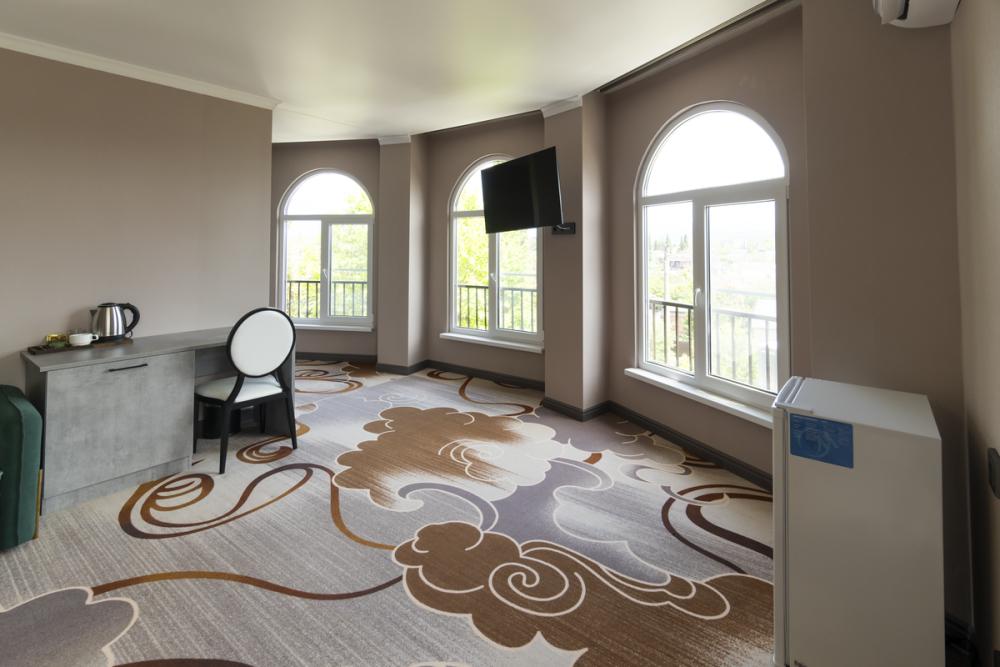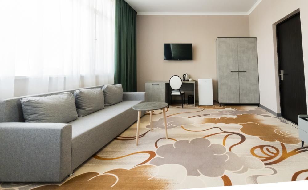 Просторный люкс площадью 59 кв.м. В распоряжении гостей удобная мебель, кондиционер, телевизор прикроватные тумбы, чайник и собственная ванная комната.