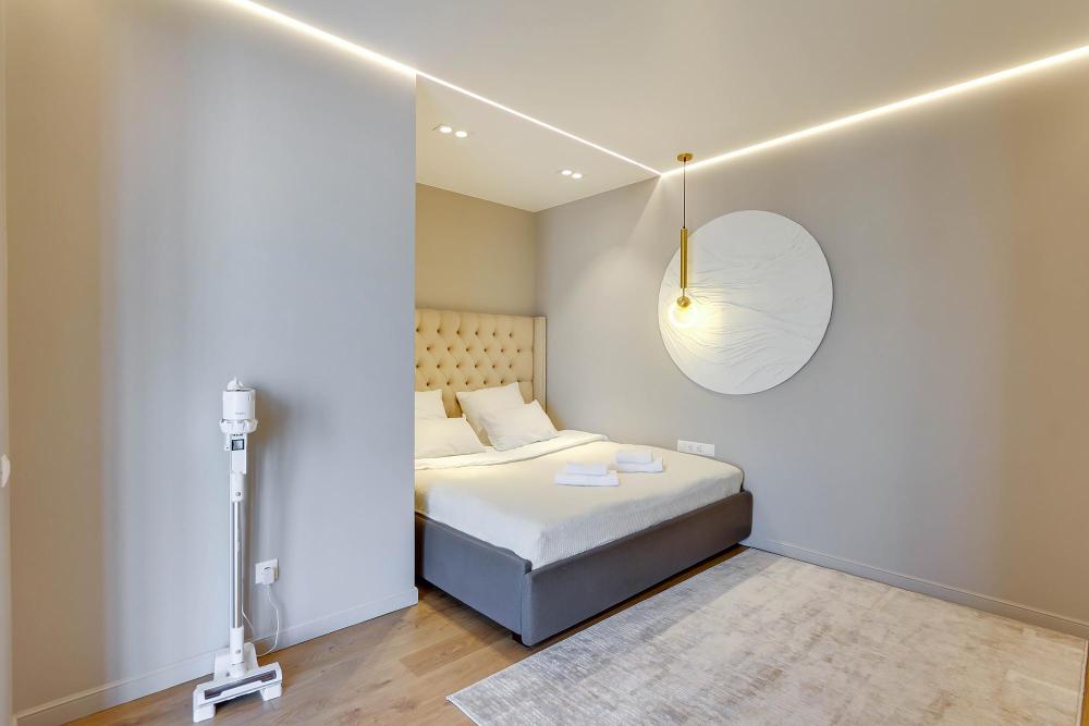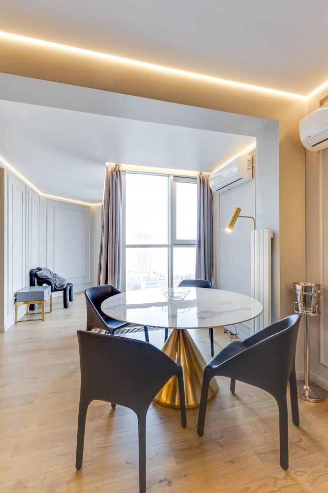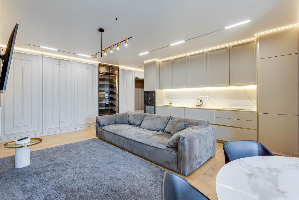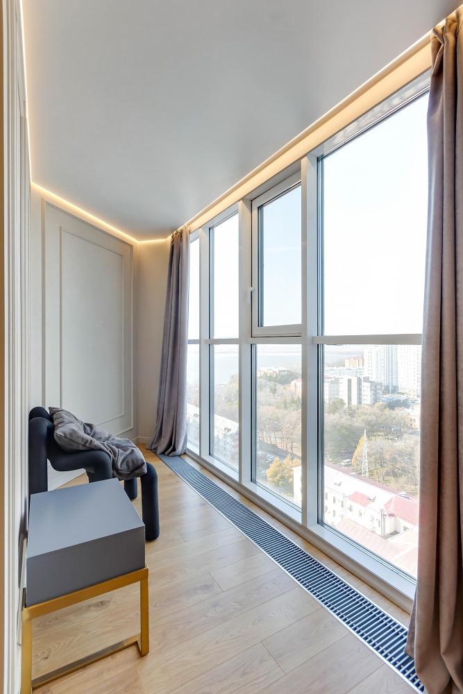 · Стиль и комфорт: Просторная квартира с модным ремонтом, панорамными окнами и видом на город. Четкое зонирование на гостевую зону с удобным диваном и уединенную спальную зону.