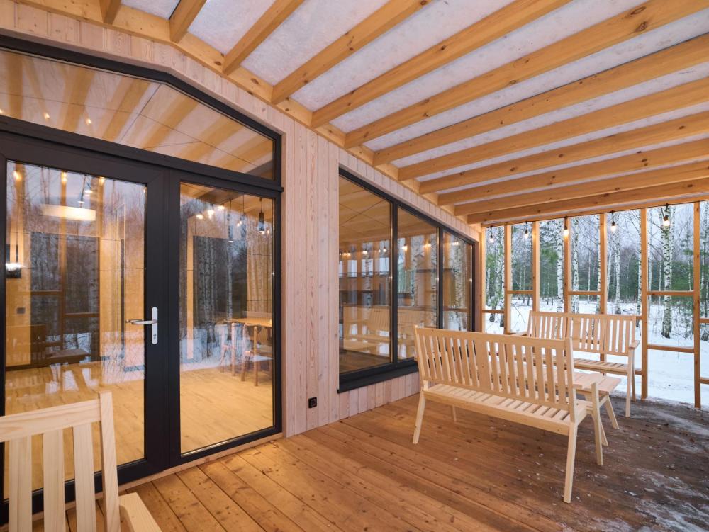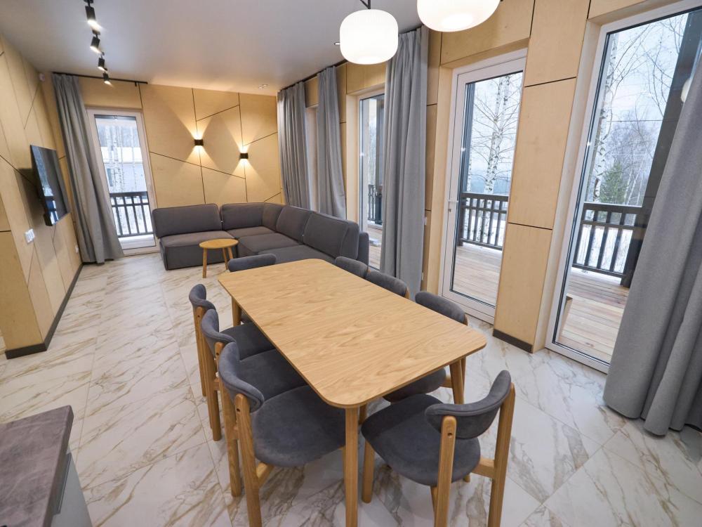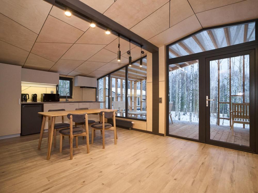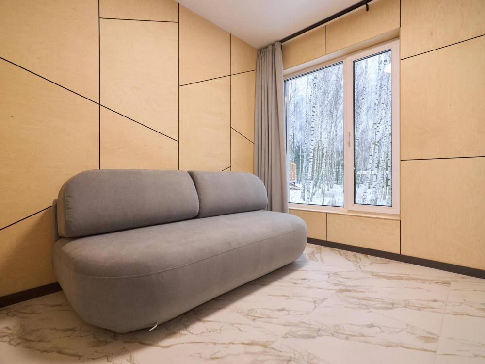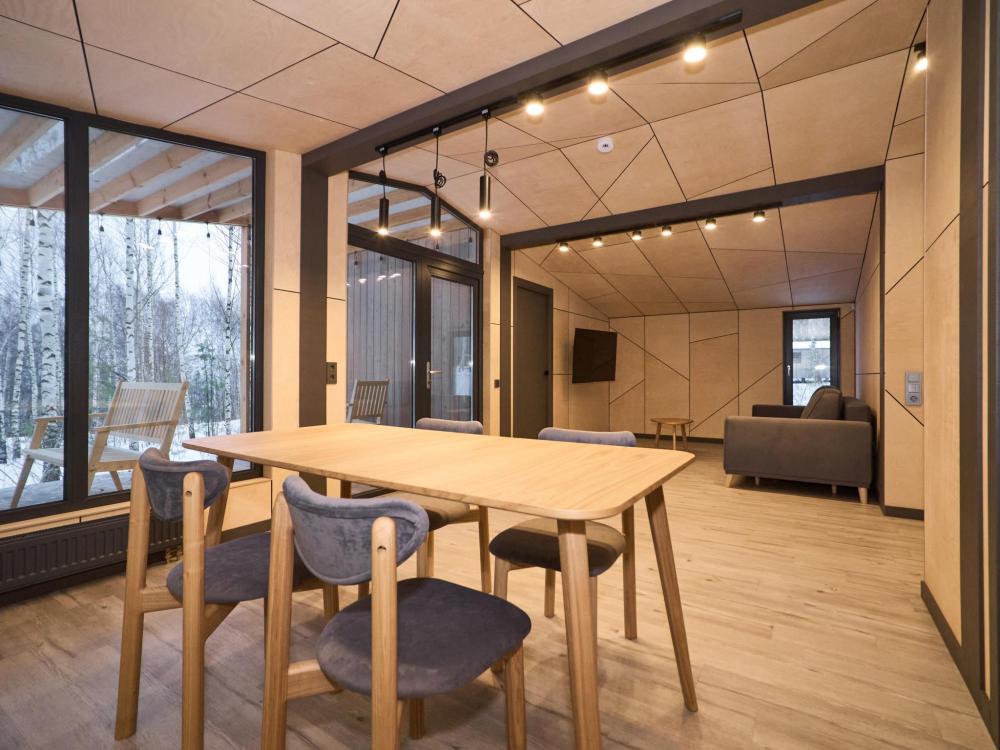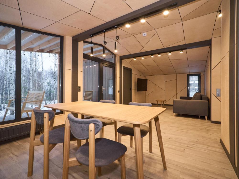 Комфортабельный и просторный дом площадью 103 кв.м, идеально подходящий для семейного или дружеского отдыха, до 8-ми гостей. Отличается продуманным наполнением и наличием большой открытой веранды с зоной для барбекю. Вид на лес и реку. В доме просторная спальня-гостиная с большой двуспальной кроватью и панорамными окнами, из которых открывается вид на лесной массив (двуспальная кровать трансформер и раскладной диван), современная кухня с варочной панелью, холодильником, кофемашиной, СВЧ и посудой телевизор в гостиной и спальне, колонка “JBL” для удобства и развлечений, веранда 11 м² - место для утреннего кофе или вечернего отдыха с книгой, панорамные окна в спальне и на веранде открывают вид на окружающую природу, теплый пол, радиатор и кондиционер, современная душевая с предметами гигиены, общий участок с индивидуальным подходом к домику, высокоскоростной интернет/WI-FI. Кухня полностью оборудована для длительного проживания: микроволновка, минибар, холодильник, столовые приборы, обеденный стол, кофе/чай, кофемашина/кофеварка, чайник. В ванной комнате: халаты, тапочки, туалетно-косметические принадлежности, душ, фен.