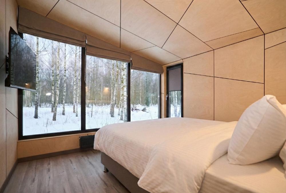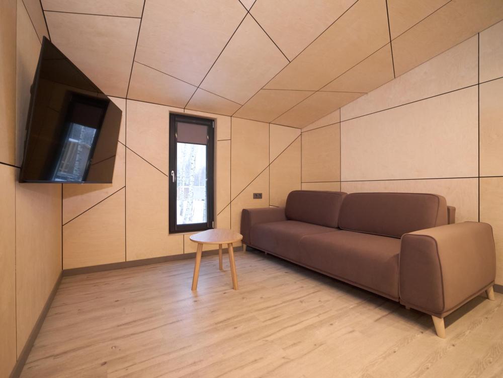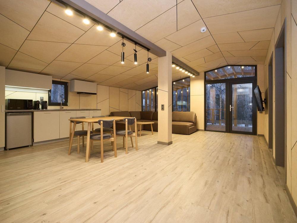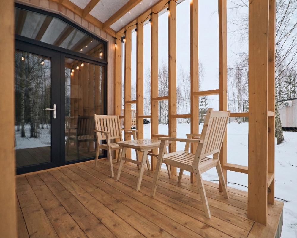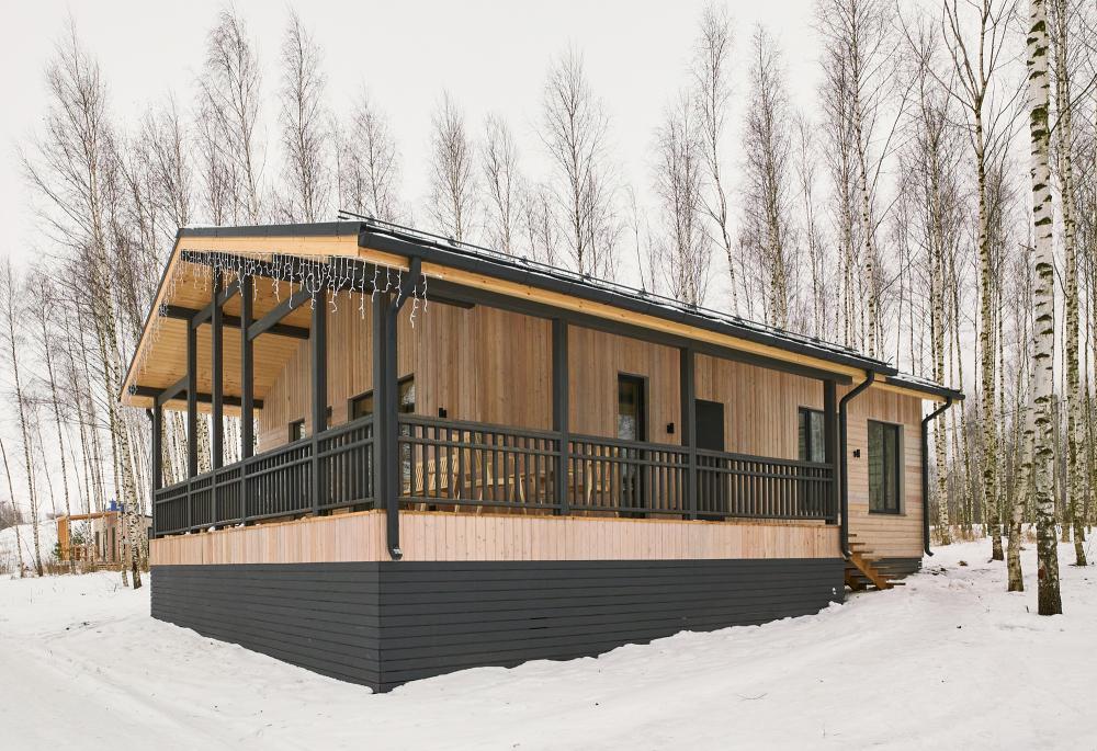 Комфортабельный и просторный дом площадью 103 кв.м, идеально подходящий для семейного или дружеского отдыха, до 8-ми гостей. Отличается продуманным наполнением и наличием большой открытой веранды с зоной для барбекю. Вид на лес и реку. В доме просторная спальня-гостиная с большой двуспальной кроватью и панорамными окнами, из которых открывается вид на лесной массив (двуспальная кровать трансформер и раскладной диван), современная кухня с варочной панелью, холодильником, кофемашиной, СВЧ и посудой телевизор в гостиной и спальне, колонка “JBL” для удобства и развлечений, веранда 11 м² - место для утреннего кофе или вечернего отдыха с книгой, панорамные окна в спальне и на веранде открывают вид на окружающую природу, теплый пол, радиатор и кондиционер, современная душевая с предметами гигиены, общий участок с индивидуальным подходом к домику, высокоскоростной интернет/WI-FI. Кухня полностью оборудована для длительного проживания: микроволновка, минибар, холодильник, столовые приборы, обеденный стол, кофе/чай, кофемашина/кофеварка, чайник. В ванной комнате: халаты, тапочки, туалетно-косметические принадлежности, душ, фен.