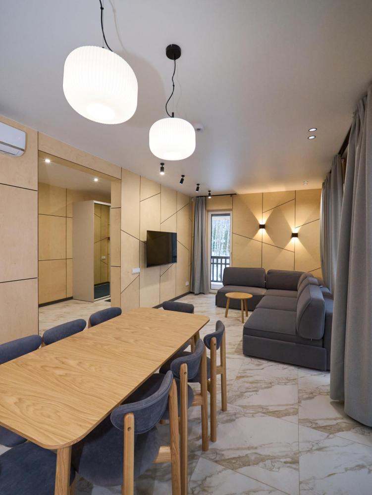 Просторный семейный дом для дружных компаний и тех, кто любит отдыхать с комфортом. Две отдельные спальни дарят личное пространство каждому гостю, а большая гостиная становится центром отдыха - здесь приятно смотреть фильмы, собираться за столом и просто наслаждаться временем вместе. Уютная веранда, зелень вокруг и мангальная зона создают атмосферу загородного клуба. Площадь - 77 кв.м, для размещения до 6-ти гостей. В доме: две спальни и диван-кровать (одна из спален с панорамным видом), уютная кухня-гостиная с плитой, посудомоечной машиной и холодильником, кофемашиной, СВЧ набором посуды, где легко готовить любимые блюда, веранда 16 м² - место, где приятно встречать рассветы и провожать закаты, теплый пол, радиатор и кондиционер, телевизор в гостиной и спальне, колонка “JBL” для удобства и развлечений, высокоскоростной интернет/WI-FI и станция “Алиса”. Кухня полностью оборудована для длительного проживания: микроволновка, минибар, холодильник, столовые приборы, обеденный стол, кофе/чай, кофемашина/кофеварка, чайник. Оснащение ванной: халаты, тапочки, туалетно-косметические принадлежности, душ, фен.