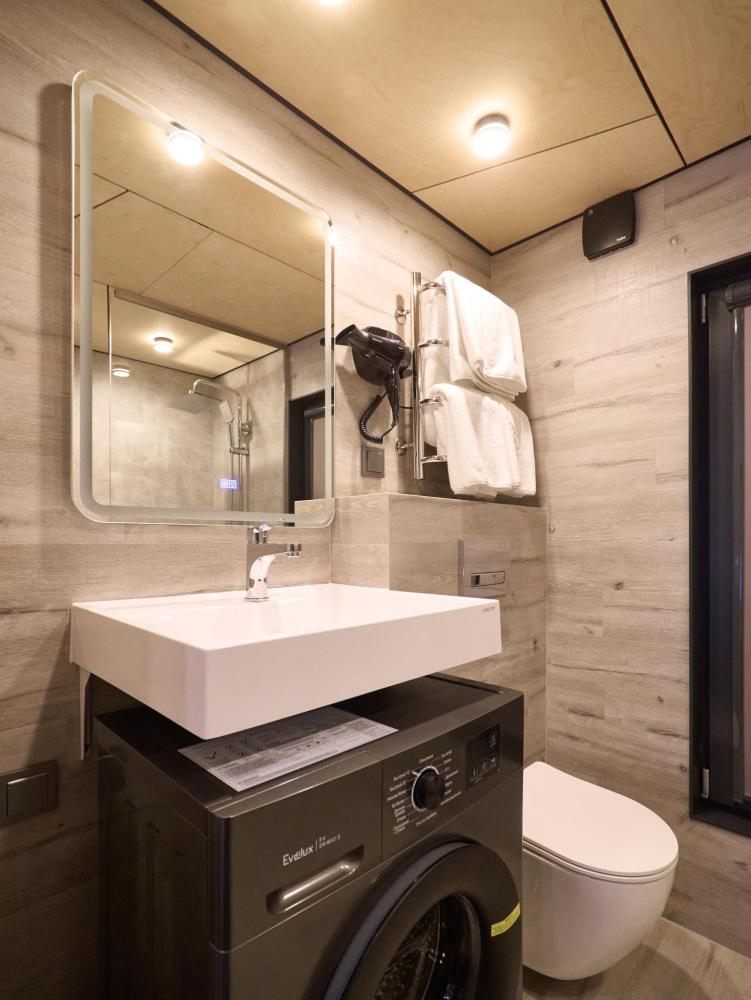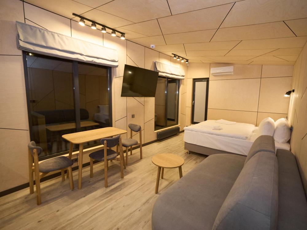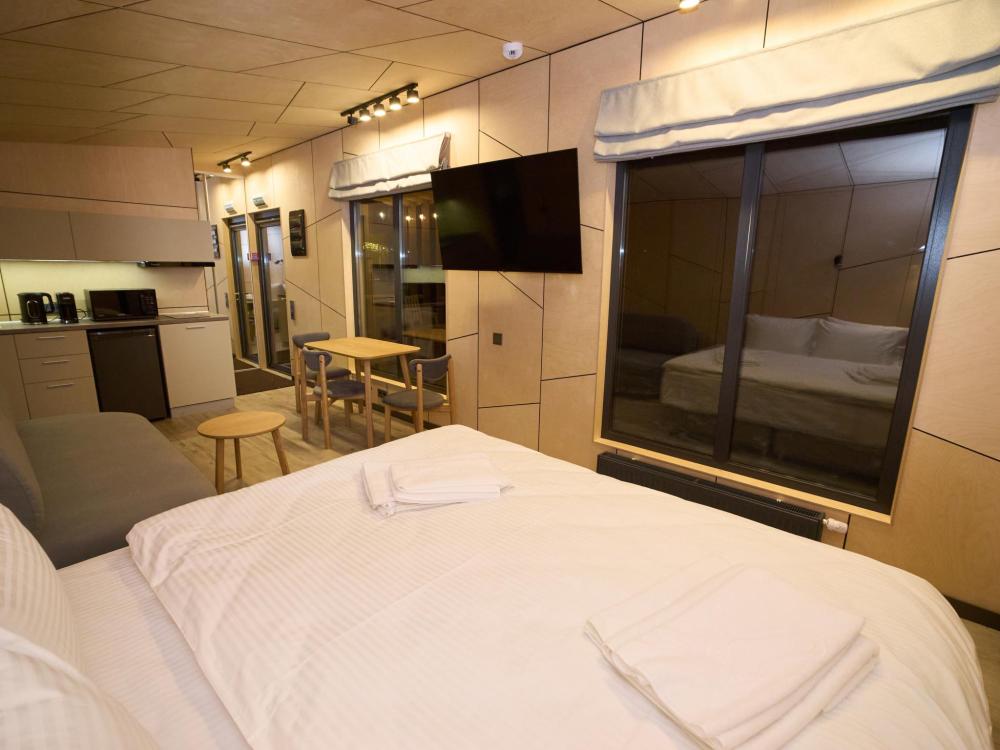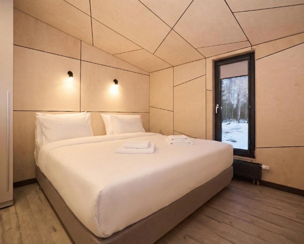Комфортный и стильный дом для пары или небольшой семьи площадью 48 кв.м. для размещения до 4-х гостей. Дом Double — гармония уюта, удобства и тёплой домашней атмосферы, где каждый момент отдыха становится особенным. Отдельная спальня позволяет уединиться, а светлая кухня-гостиная становится местом для общения и неспешных семейных завтраков. Панорамные окна создают ощущение простора, а веранда продолжает жилое пространство на свежем воздухе. В доме: 1 спальня и кухня-гостиная (двуспальная кровать и раскладной диван), современная кухня с варочной панелью, холодильником, кофемашиной, СВЧ и посудой, телевизор в гостиной и спальне, колонка “JBL” для удобства и развлечений, веранда 7 м² – место для утреннего кофе или вечернего отдыха с книгой, панорамные окна в спальне и на веранде открывают вид на окружающую природу и городской пейзаж, теплый пол и кондиционер, современная душевая с предметами гигиены, общий участок с индивидуальным подходом к домику, высокоскоростной интернет/WI-FI. Кухня полностью оборудована для длительного проживания: микроволновка, минибар, холодильник, столовые приборы, обеденный стол, кофе/чай, кофемашина/кофеварка, чайник. Оснащение ванной: халаты, тапочки, туалетно-косметические принадлежности, душ, фен.