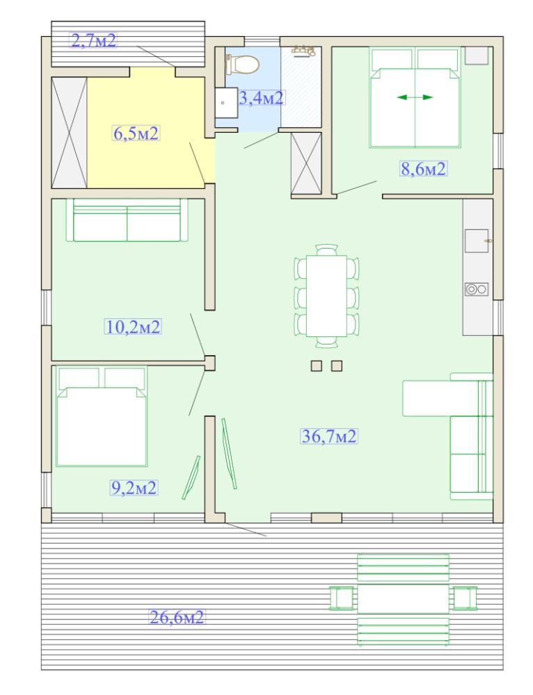 Комфортабельный и просторный дом площадью 111 кв.м, идеально подходящий для семейного или дружеского отдыха до 8-ми гостей. Отличается продуманным наполнением и наличием большой открытой веранды с зоной для барбекю. Вид на лес и реку. В доме просторная гостиная с раскладывающимся диваном, три отдельные спальни, кухня-столовая, 2 ванных комнаты, телевизоры: ТВ 55 дюймов в гостиной и ТВ 43 дюйма в мастер-спальне, высокоскоростной интернет/WI-FI, большая открытая веранда с комплектом уличной мебели для отдыха. Рядом с домом оборудована мангальная зона. Стоянка для двух автомобилей непосредственно у дома. Кухня полностью оборудована для длительного проживания: обеденный стол рассчитан на 8 человек, холодильник, электроплита 4-х конфорочная, СВЧ-печь, капсульная кофе-машина и машина для молотого кофе, чайник, полный комплект посуды и столовых приборов на 8 человек. Оснащение ванной: просторная душевая кабина с тропическим душем.