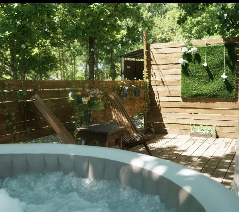 Собственная терраса с видом на горы и лес Джакузи-бассейн Мангальная зона Мини-кухня со всем необходимым Полотенца / халат / тапочки Санузел Косметические принадлежности для душа Питьевая вода Парковка Стабильный wi-fi (+ все операторы моб. связи работают на территории) Заезд после 14-00, выезд до 11-00